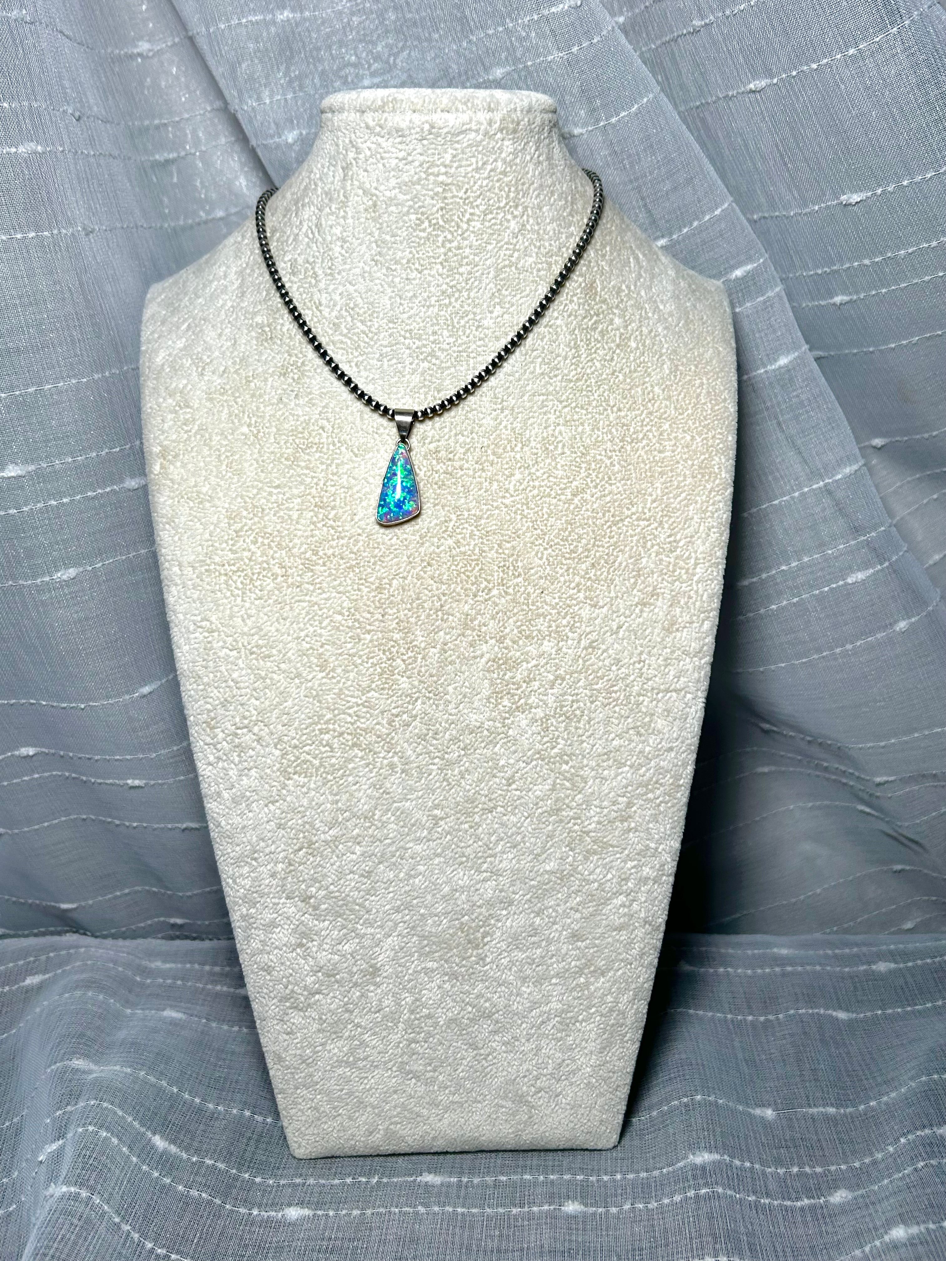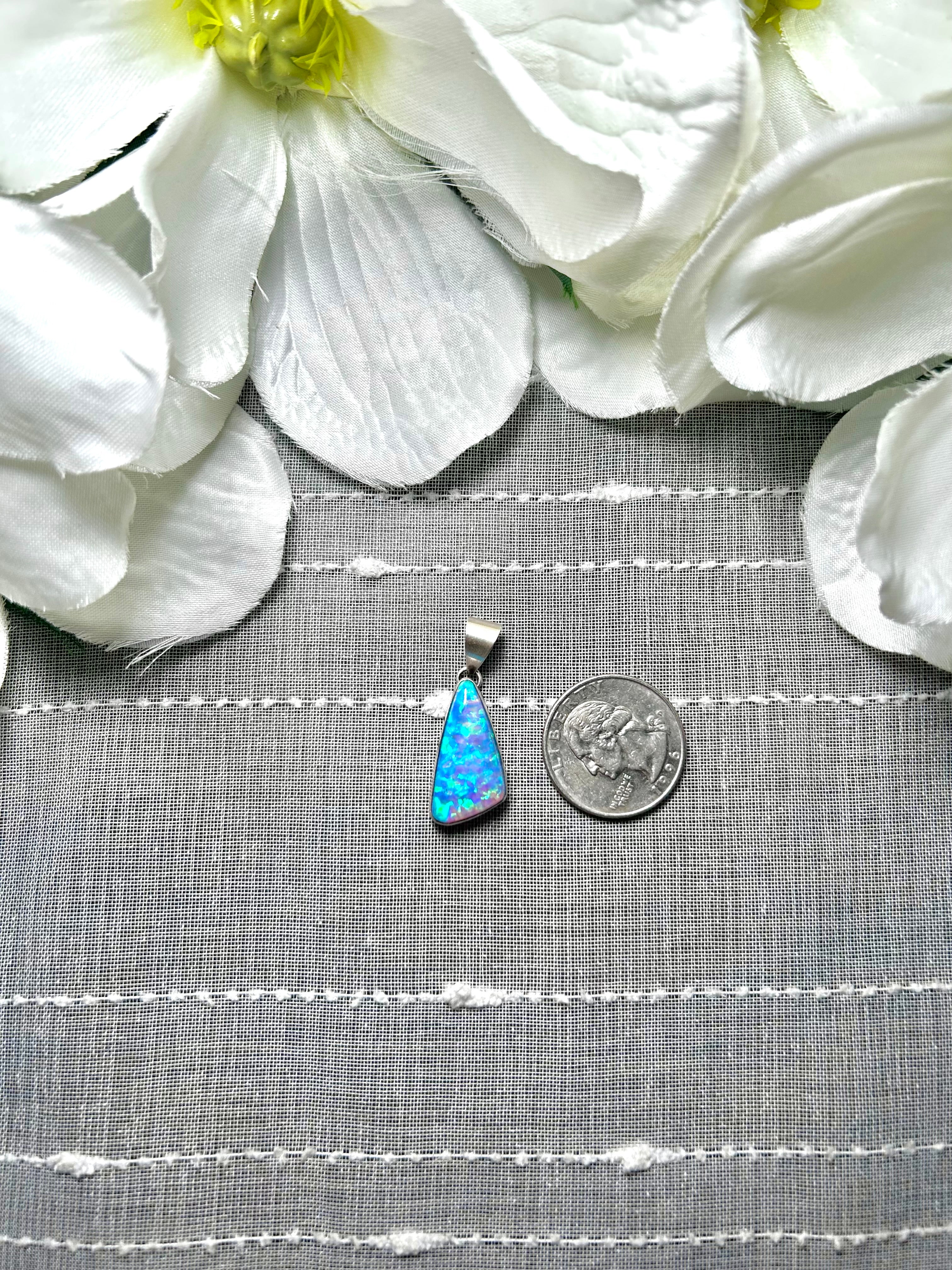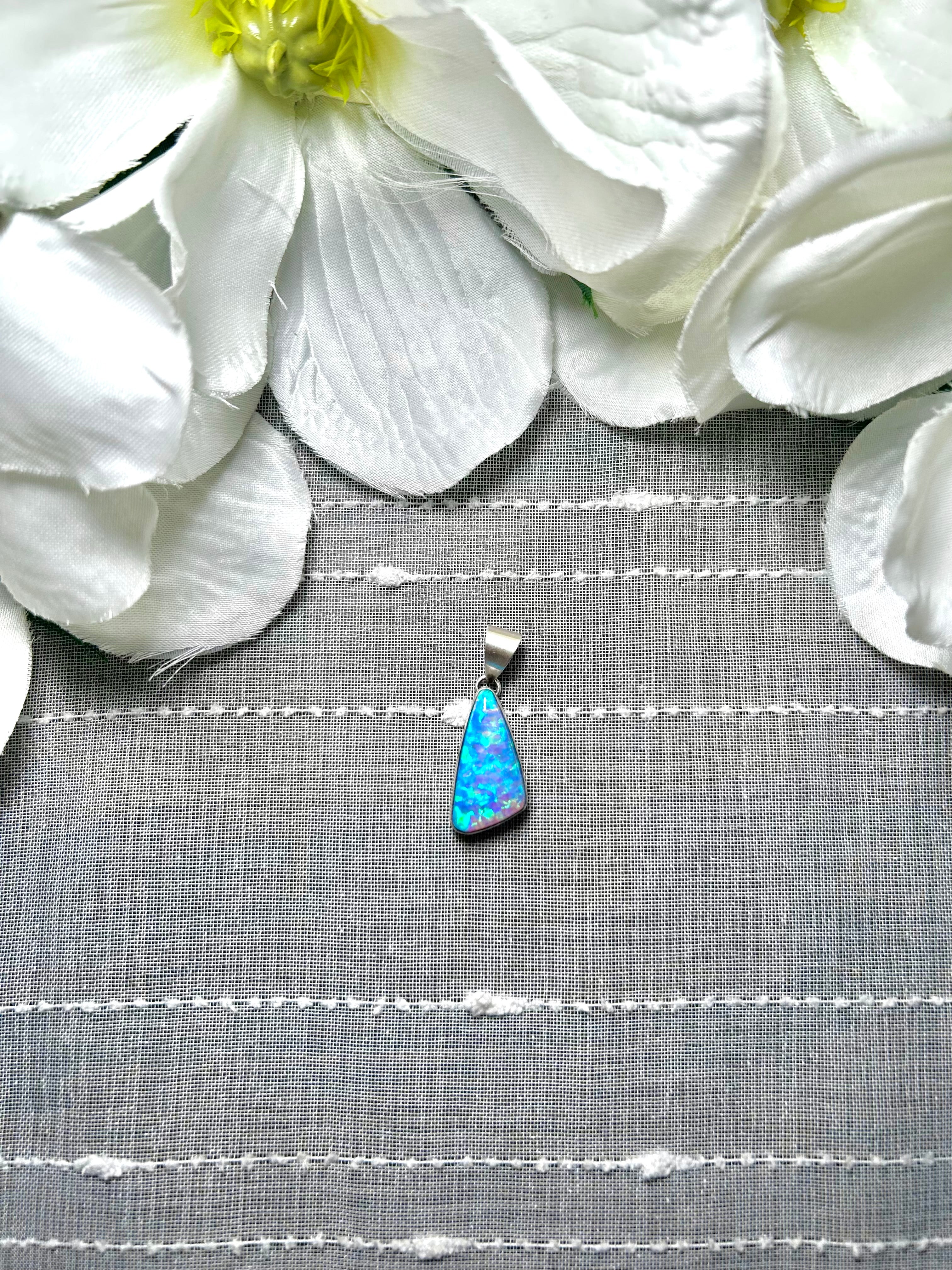 Navajo Man Made Opal & Sterling Silver Pendant. It measures 1 1/4 inches long and 1/2 of an inch wide. Pendant Only! Signed by the artist and stamped sterling silver.