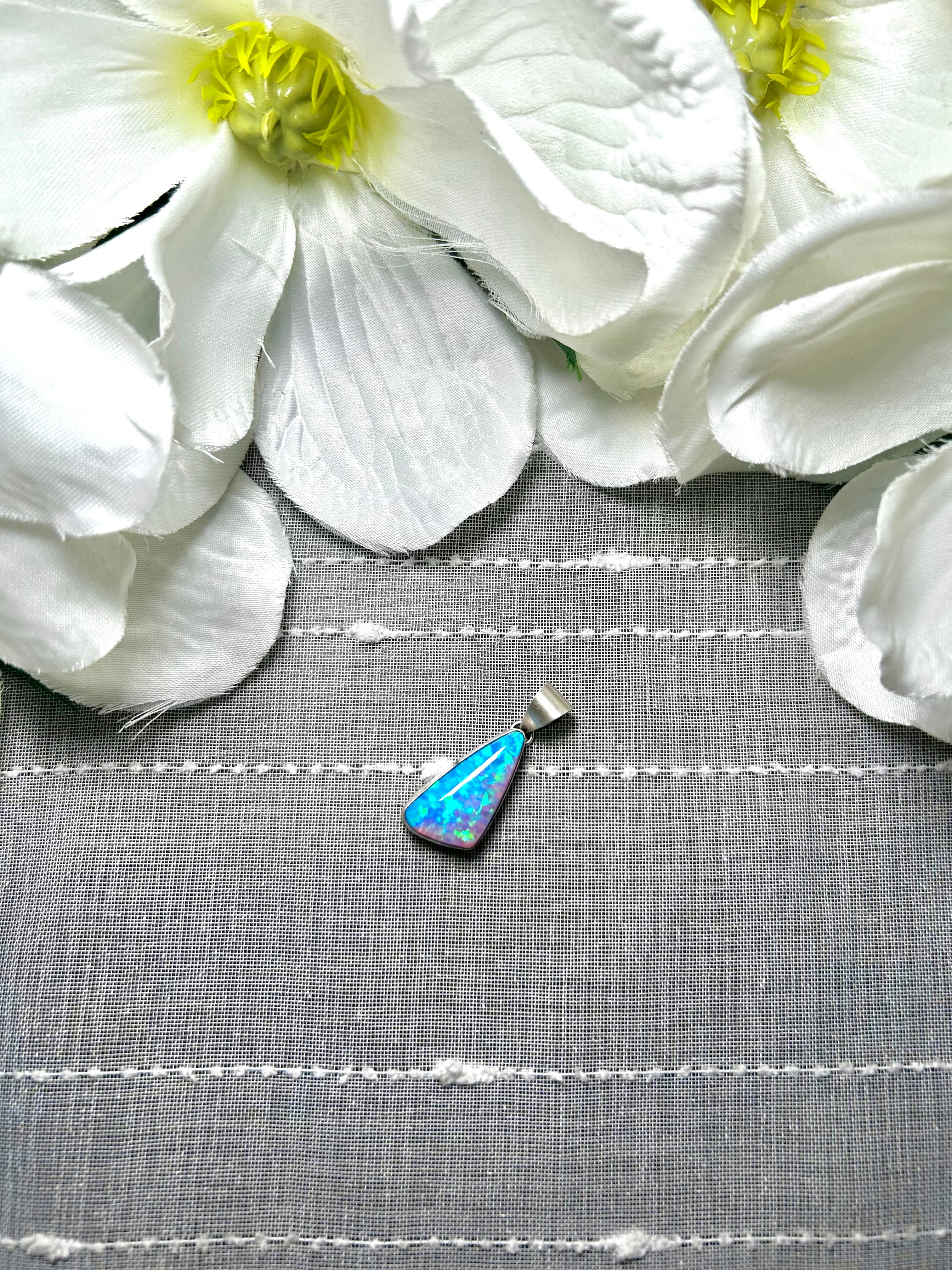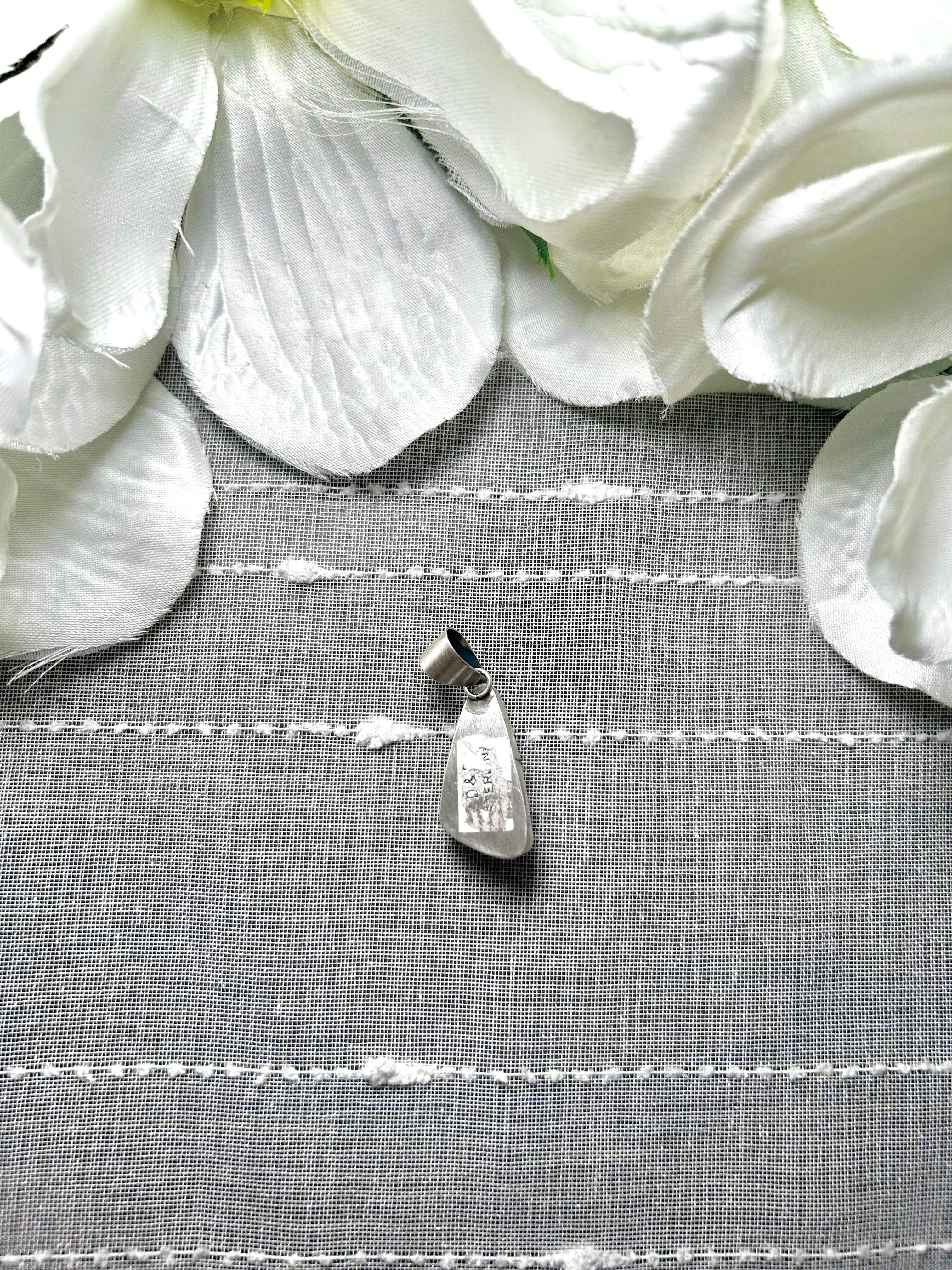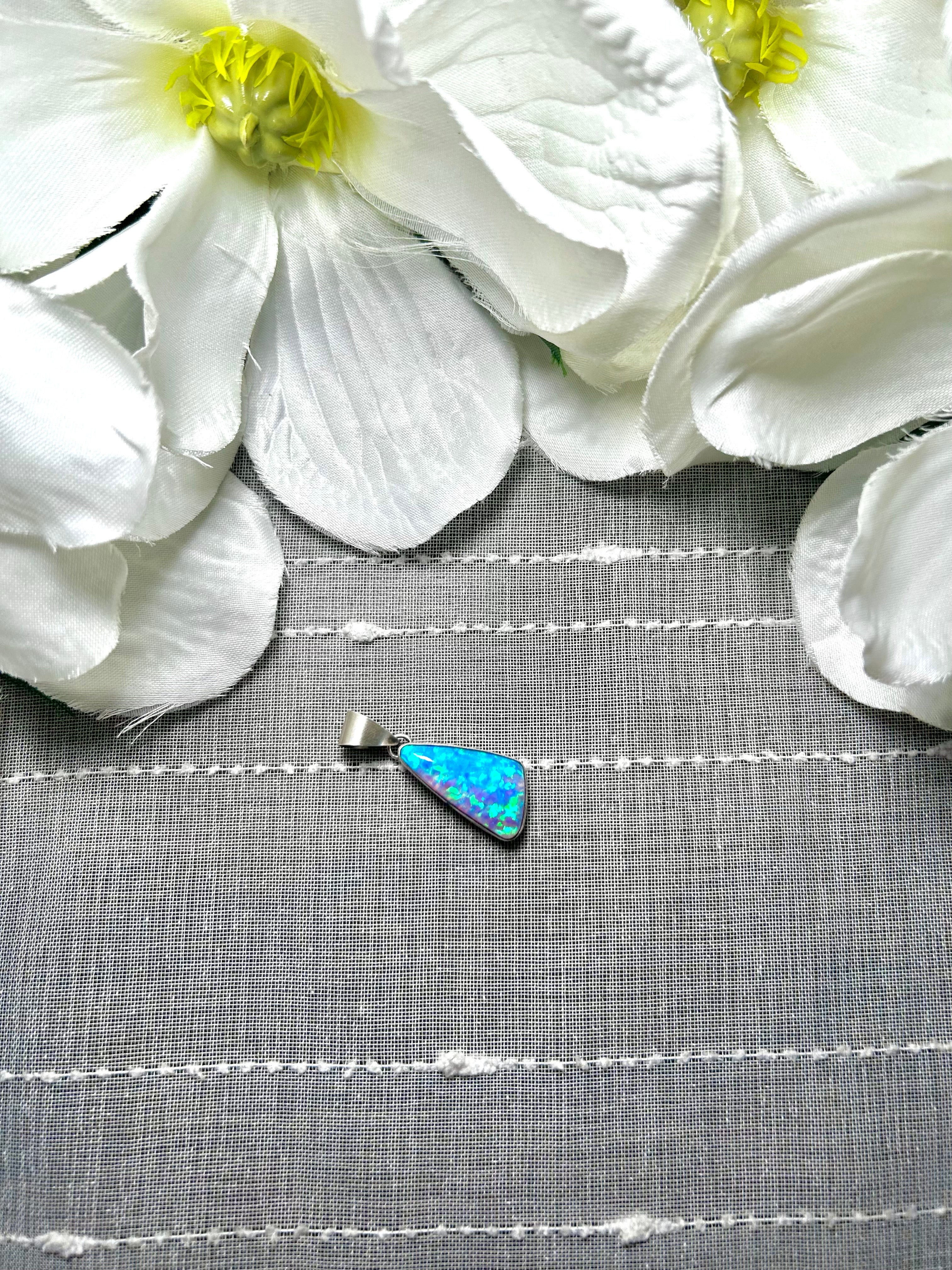 Navajo Man Made Opal & Sterling Silver Pendant. It measures 1 1/4 inches long and 1/2 of an inch wide. Pendant Only! Signed by the artist and stamped sterling silver.
