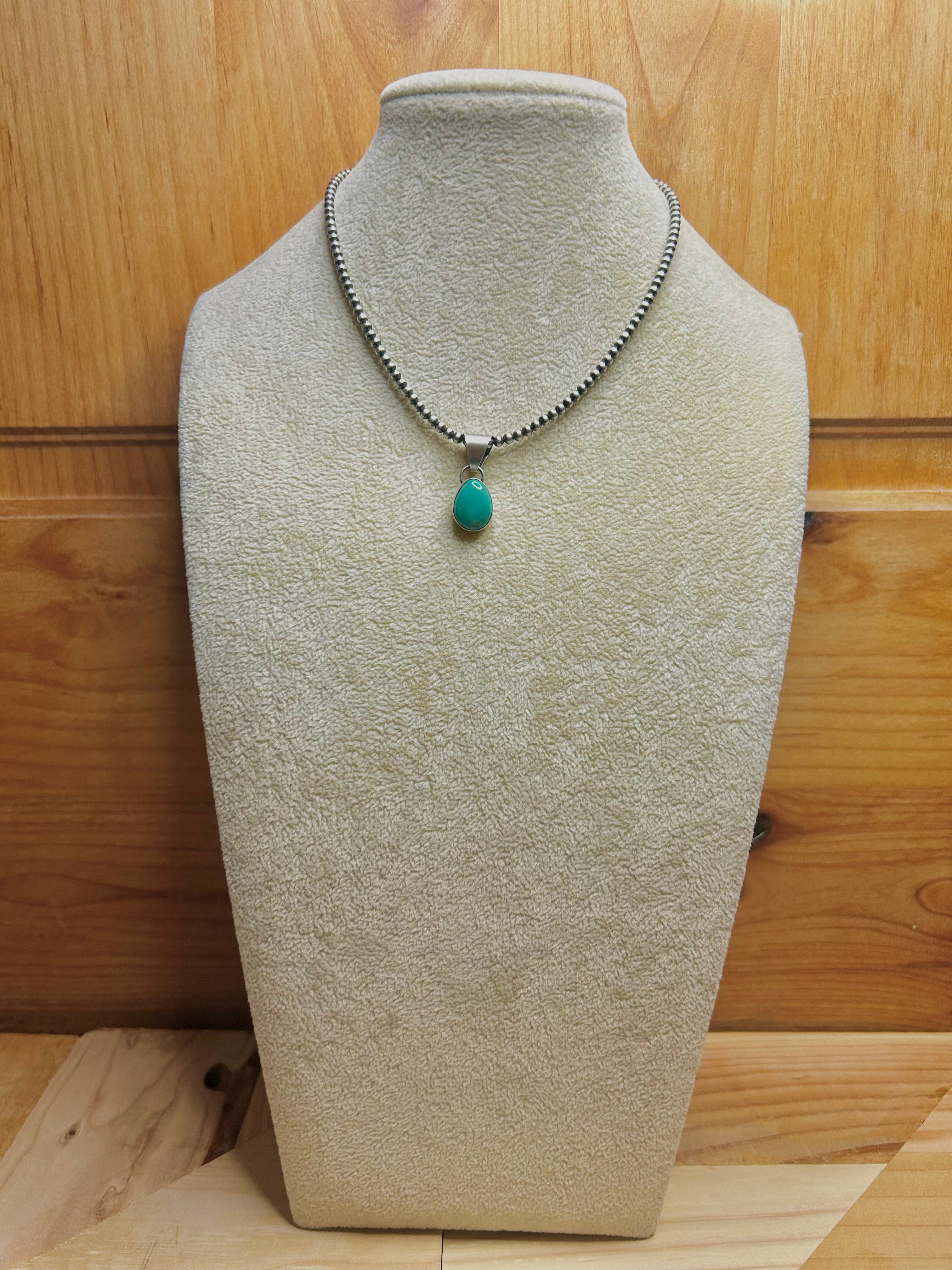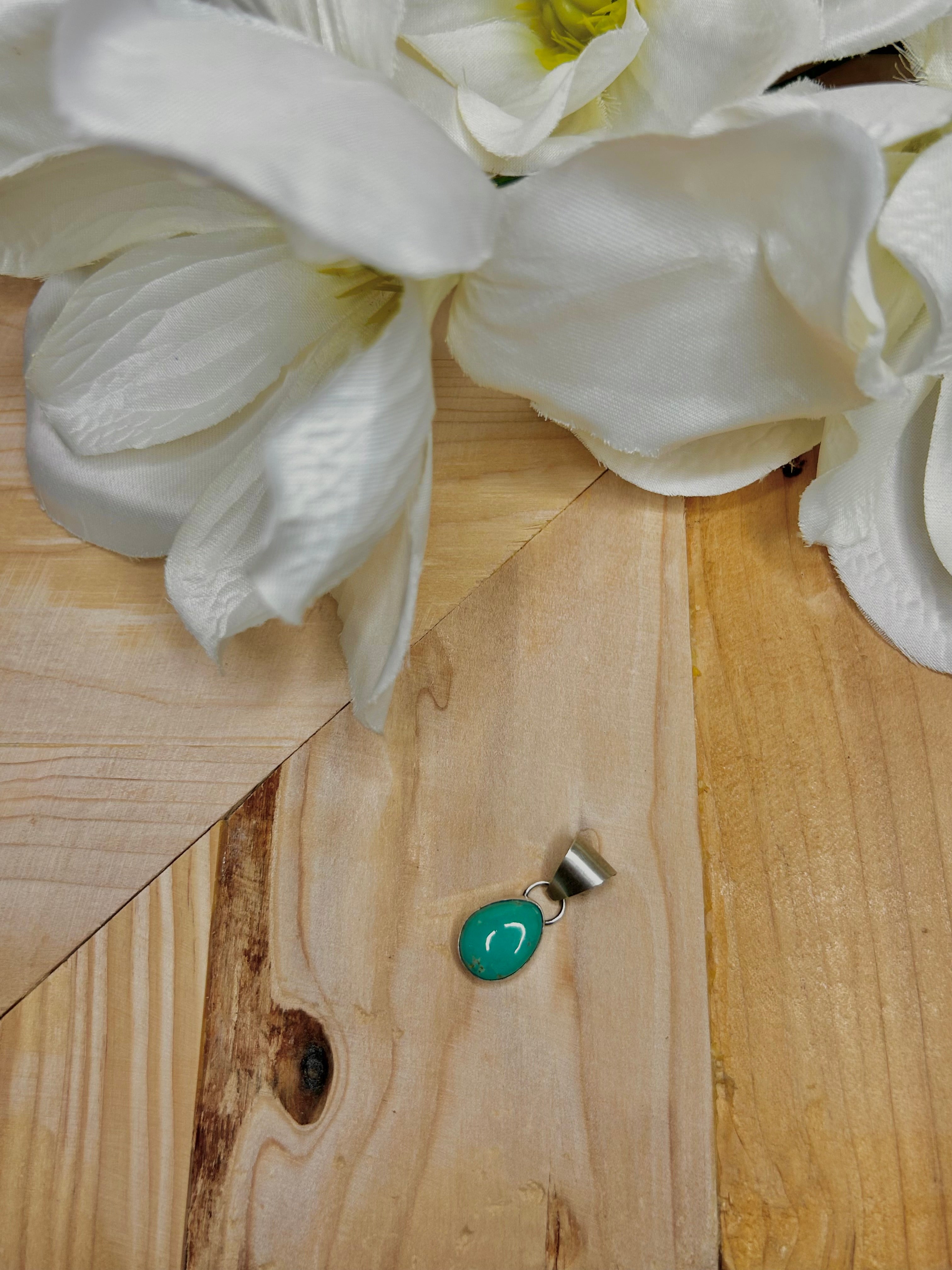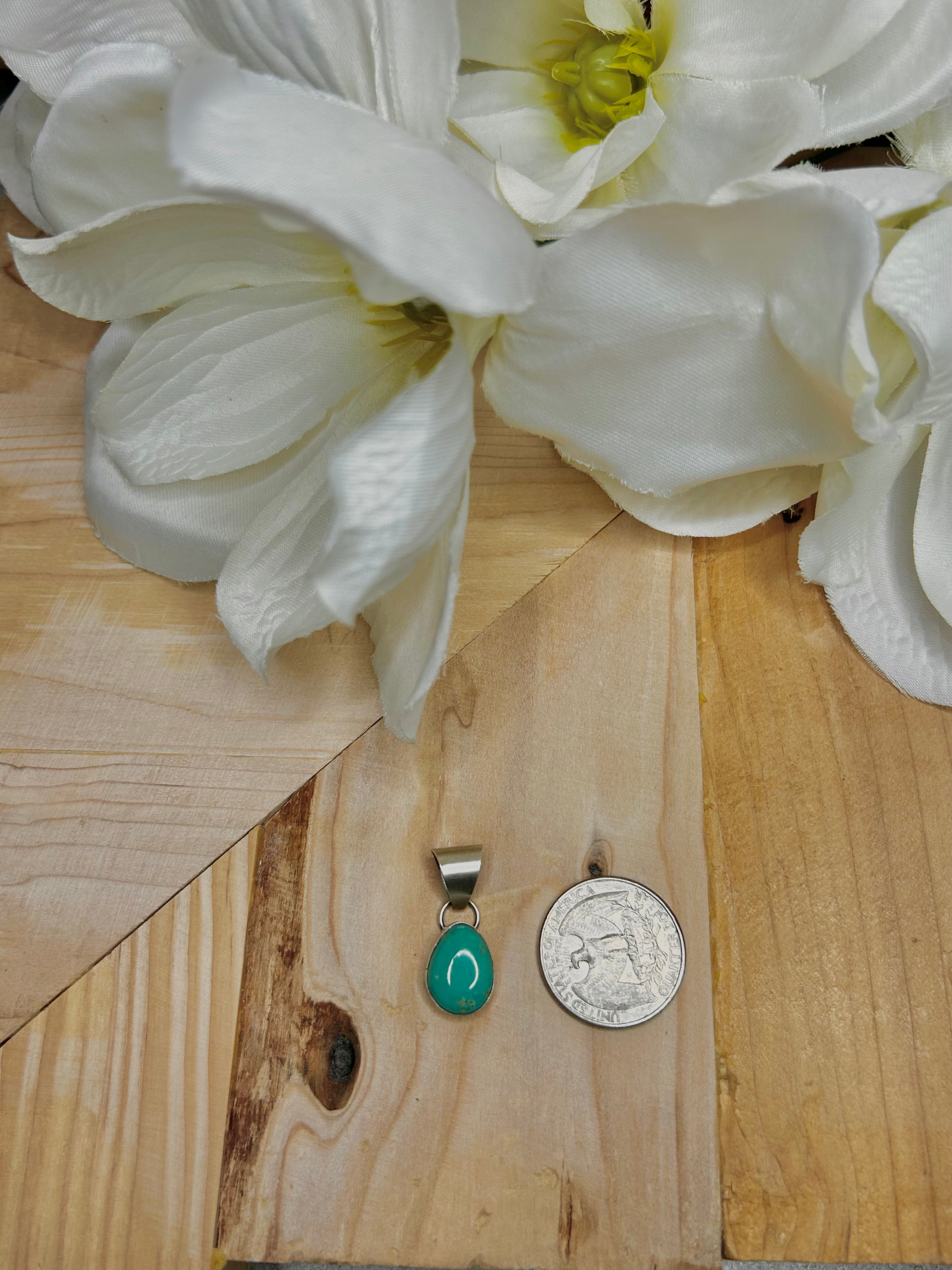 Navajo Made Kingman Turquoise & Sterling Silver Pendant. It measures 1 1/4 inch long and 1/2 of an inch wide. Pendant Only. Signed by the artist and stamped sterling silver.