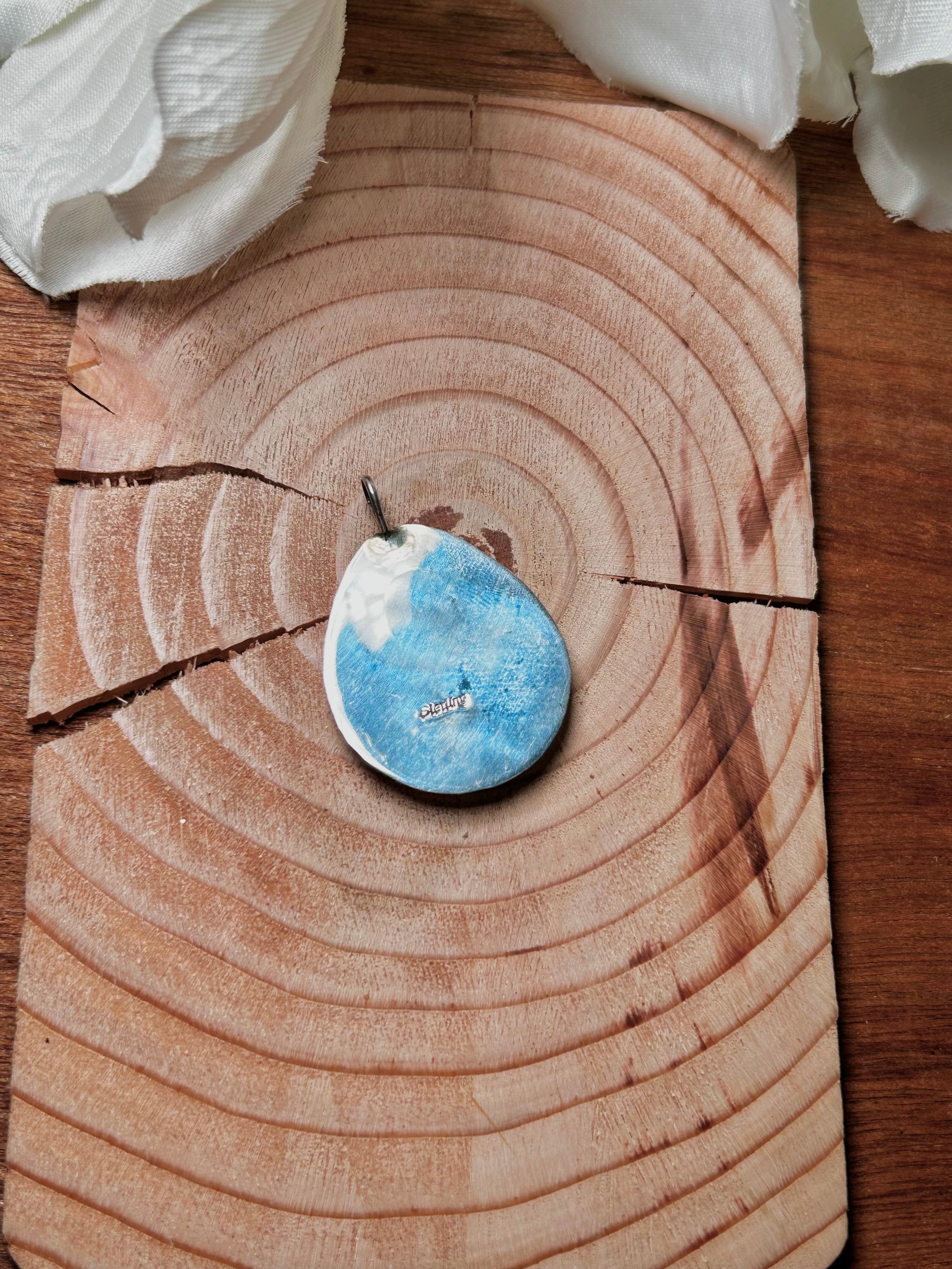 Navajo Made Kingman Turquoise & Sterling Silver Pendant. It measures 1 1/2 inches long and a little over 1 inch wide. Pendant Only. Signed by the artist and stamped sterling silver.