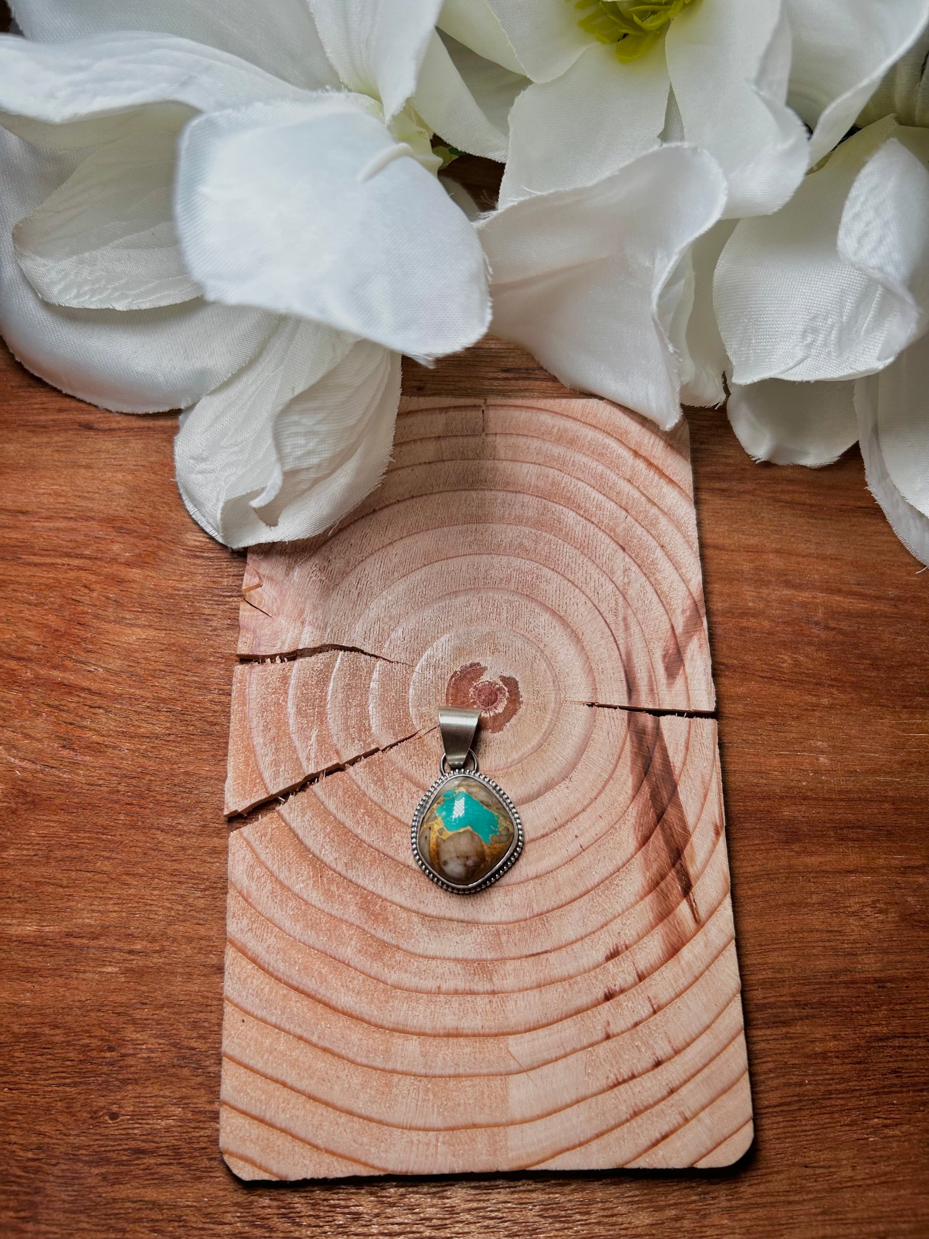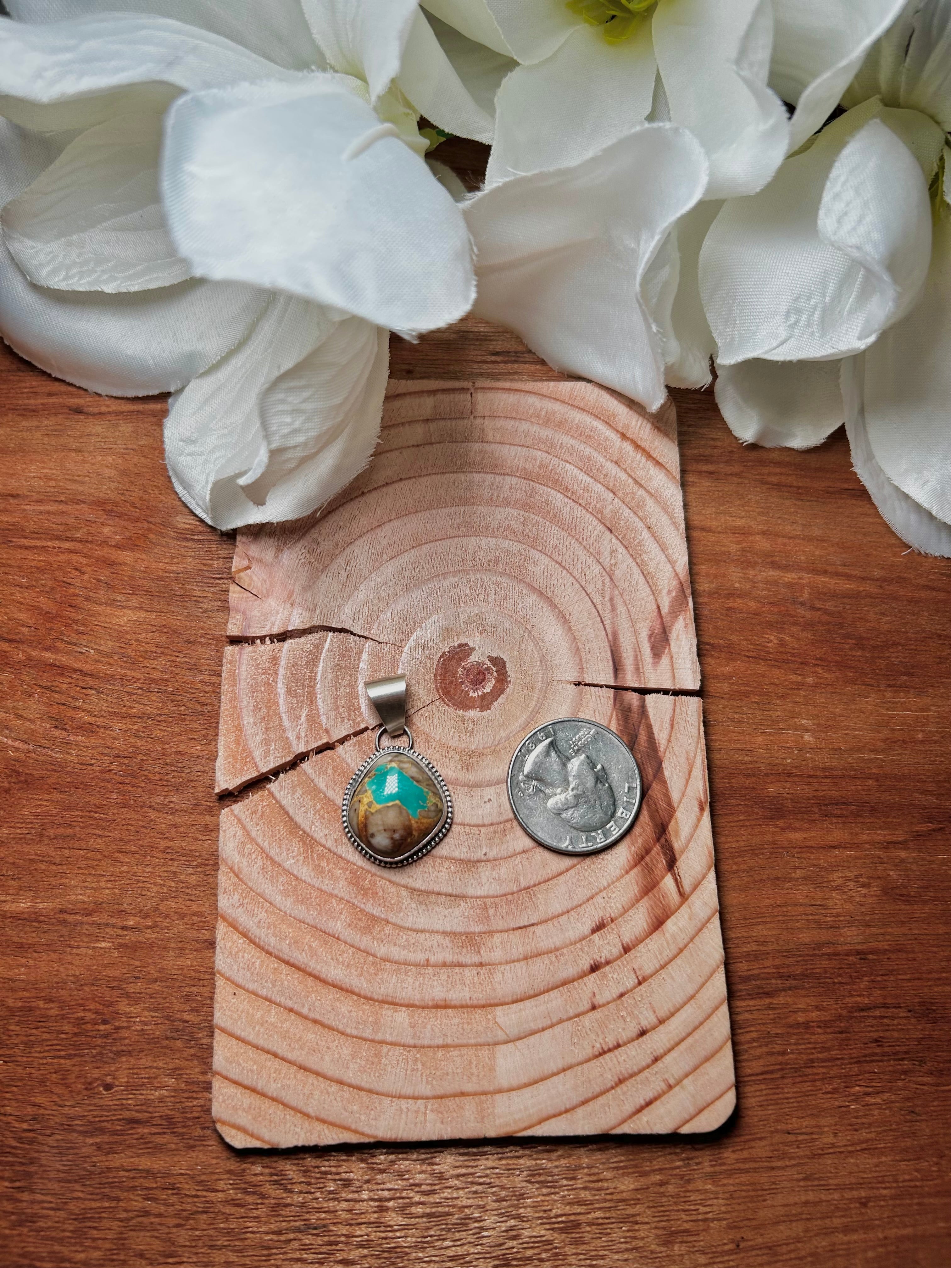Navajo Made Royston Turquoise & Sterling Silver Pendant. It measures 1 3/8 inches long and a little over 1 inch wide. Pendant Only. Signed by the artist and stamped sterling silver.