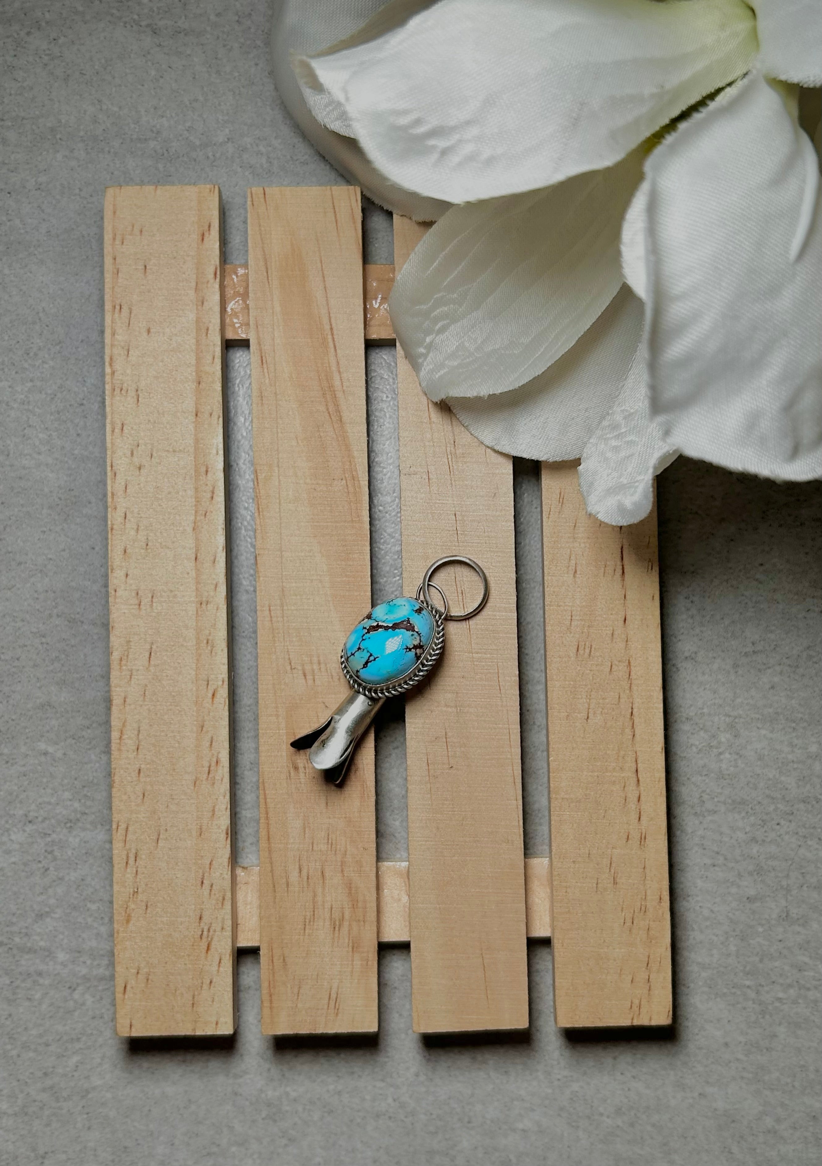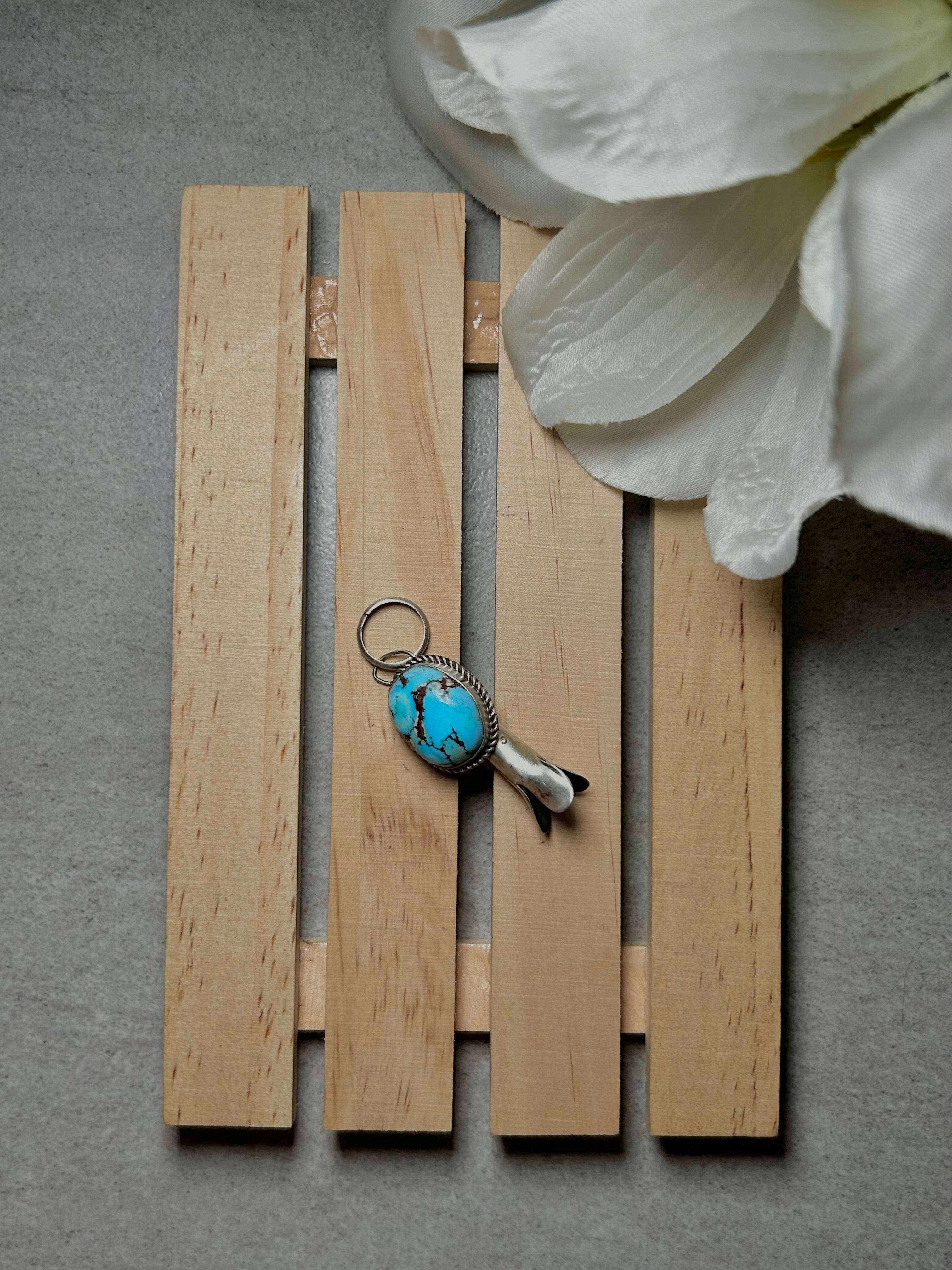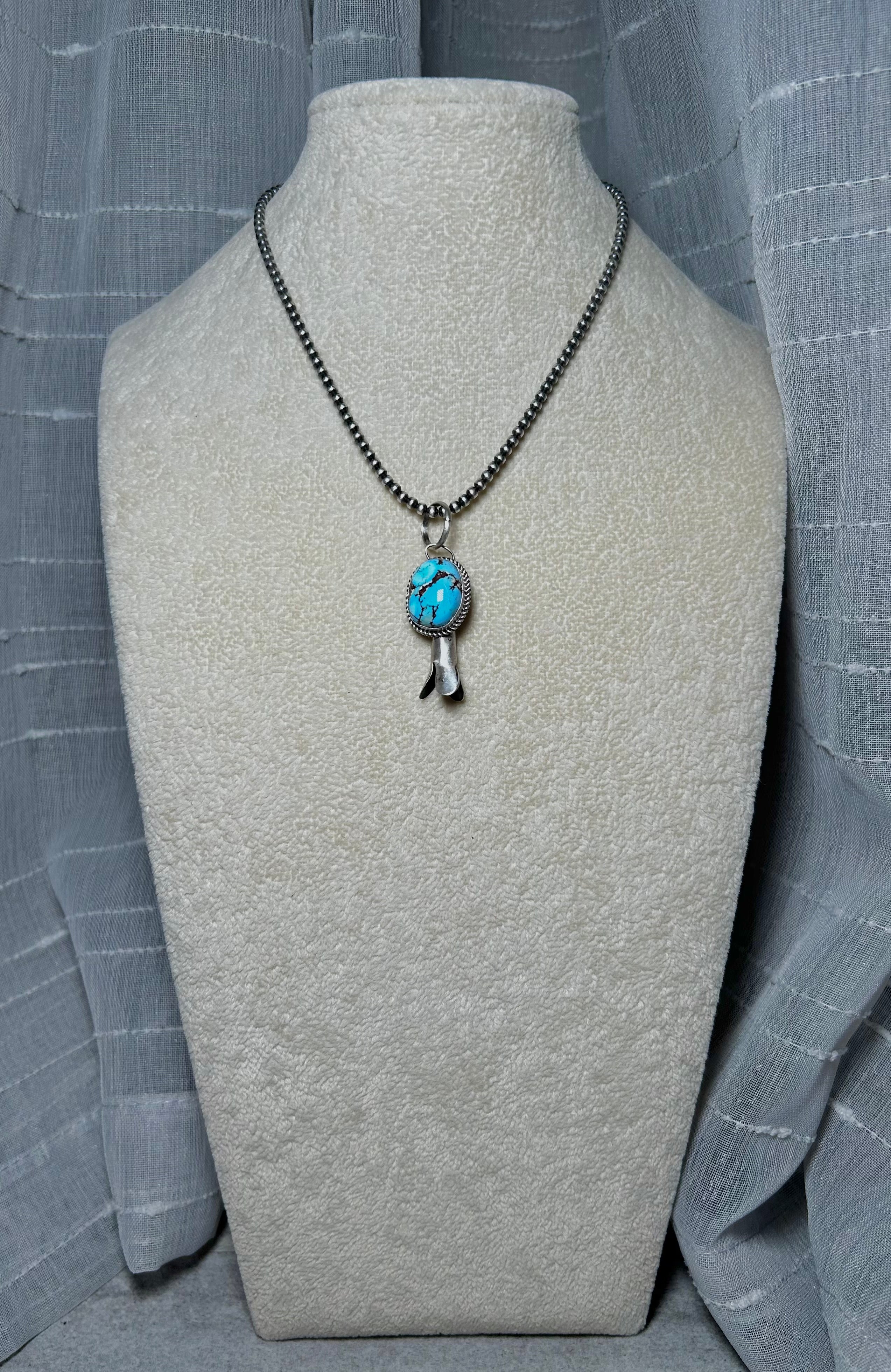 Navajo Made Golden Hill Turquoise & Sterling Silver Pendant. It measures 2 inches long and 3/4 of an inch wide. Pendant Only. Signed by the artist and stamped sterling silver.