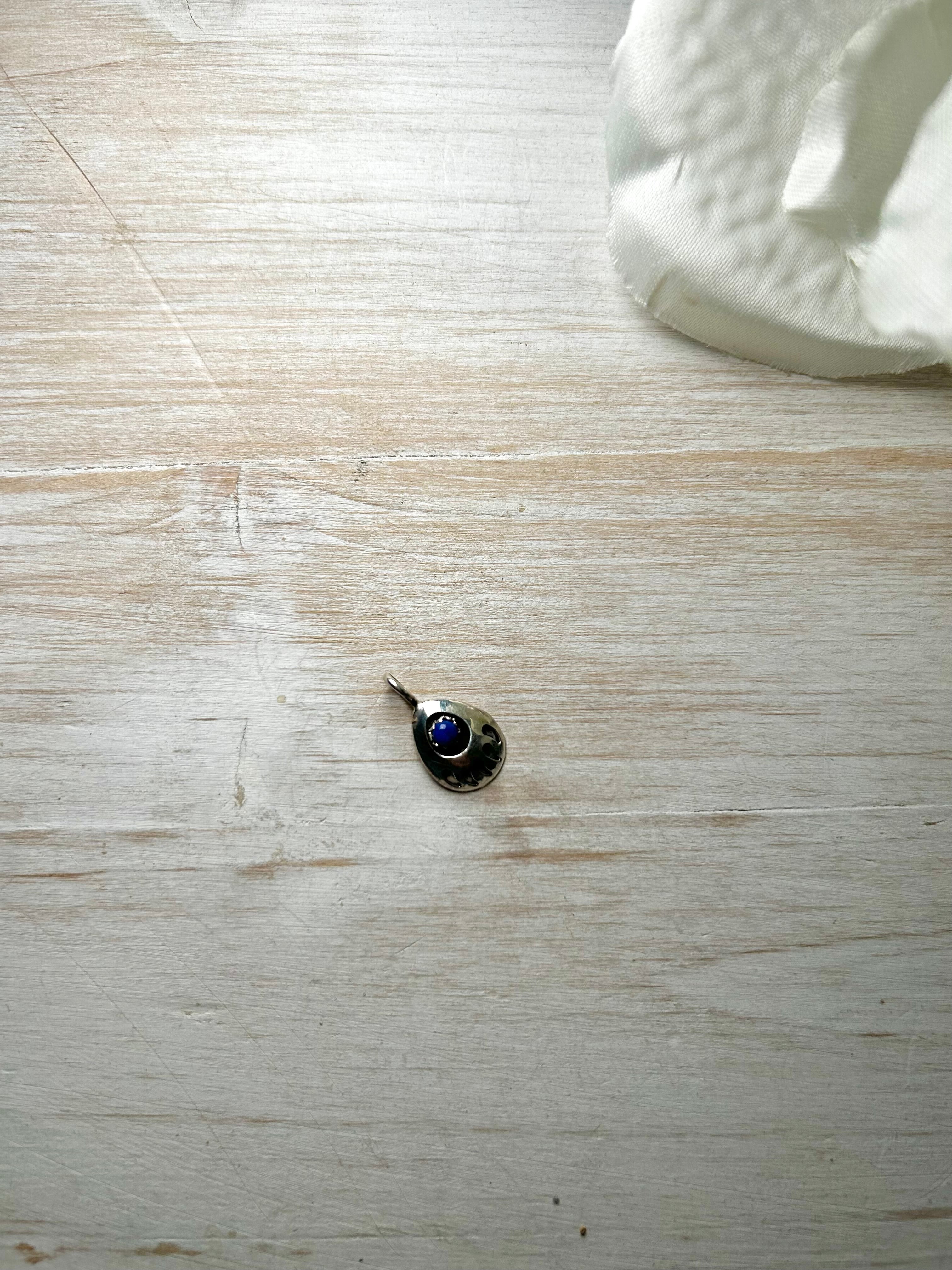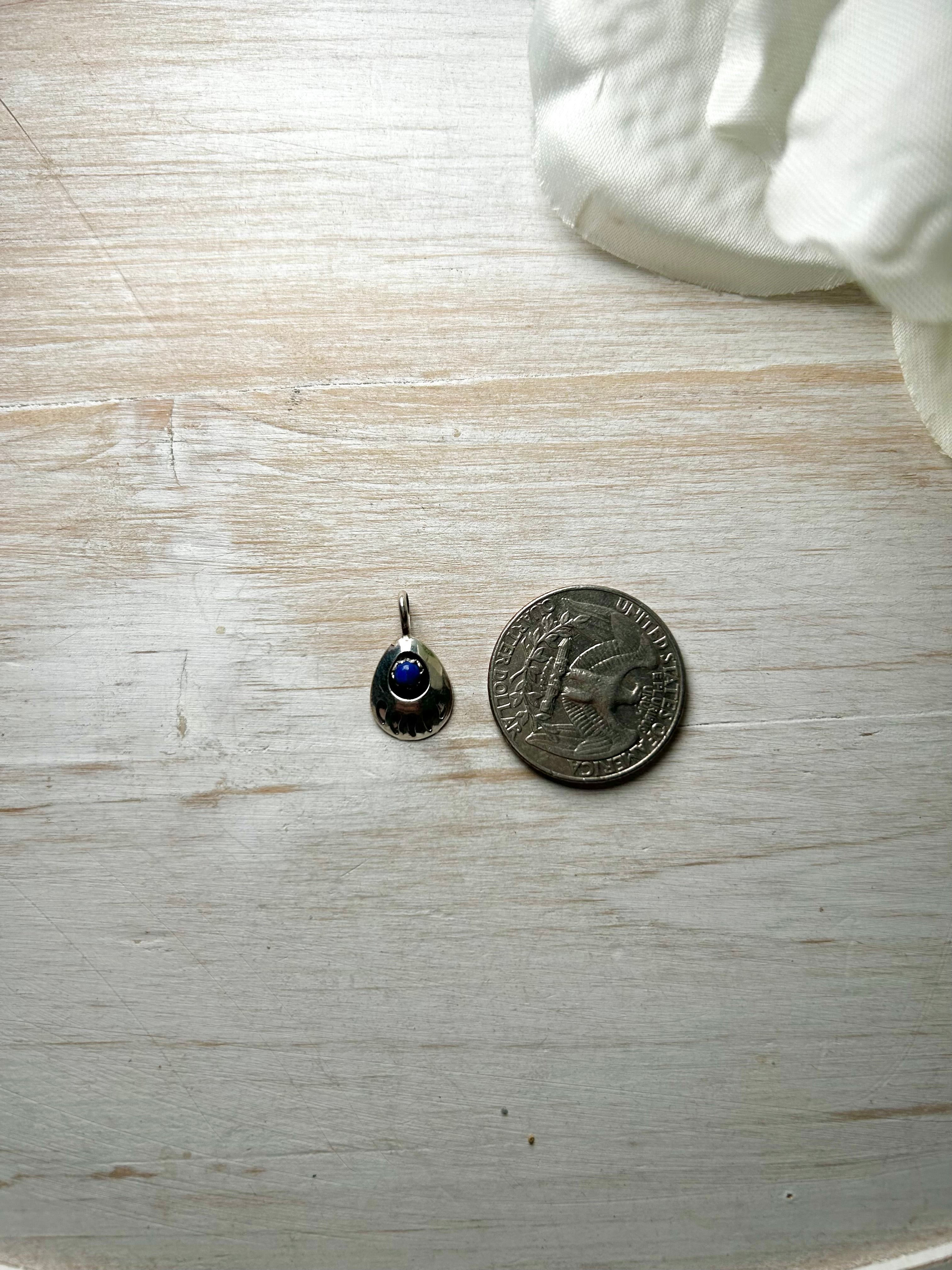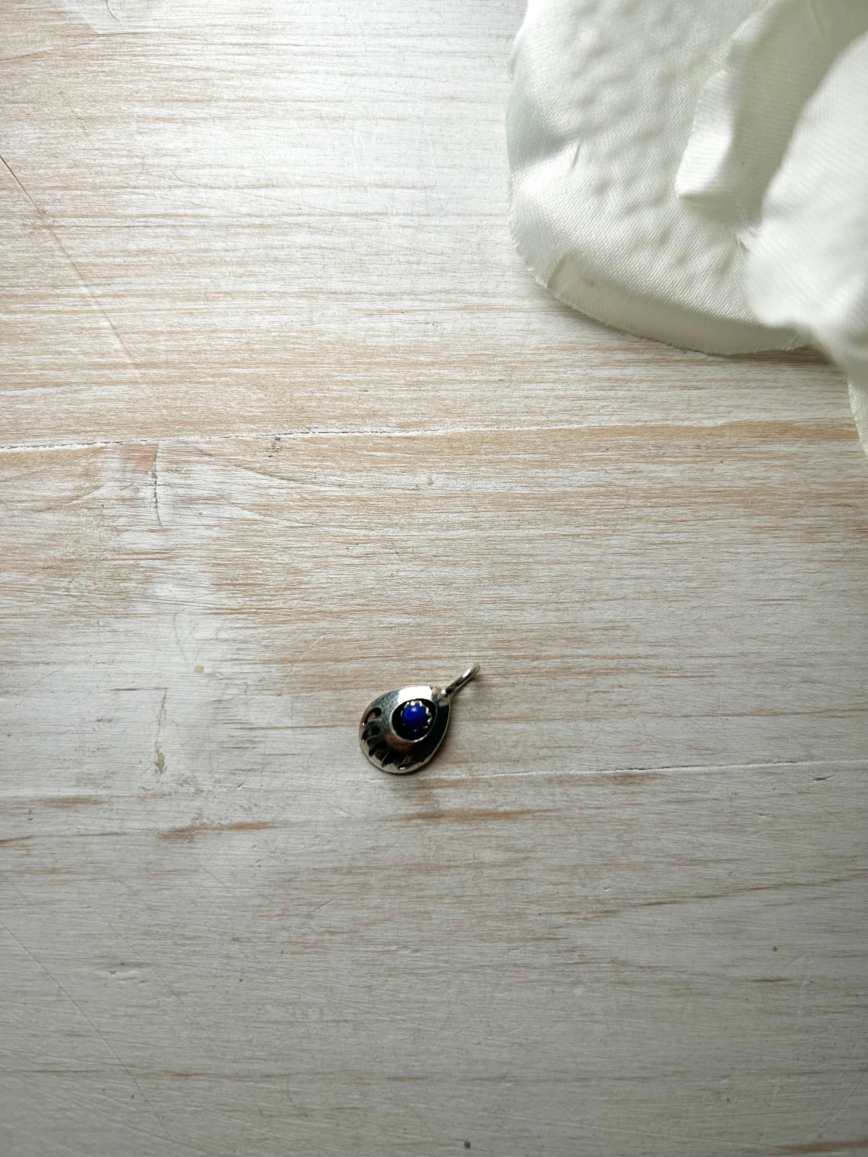 Navajo Made Lapis & Sterling Silver Pendant. It measures 3/4 of an inch long and 3/8 of an inch wide. Signed by the artist and stamped sterling silver. Pendant only!