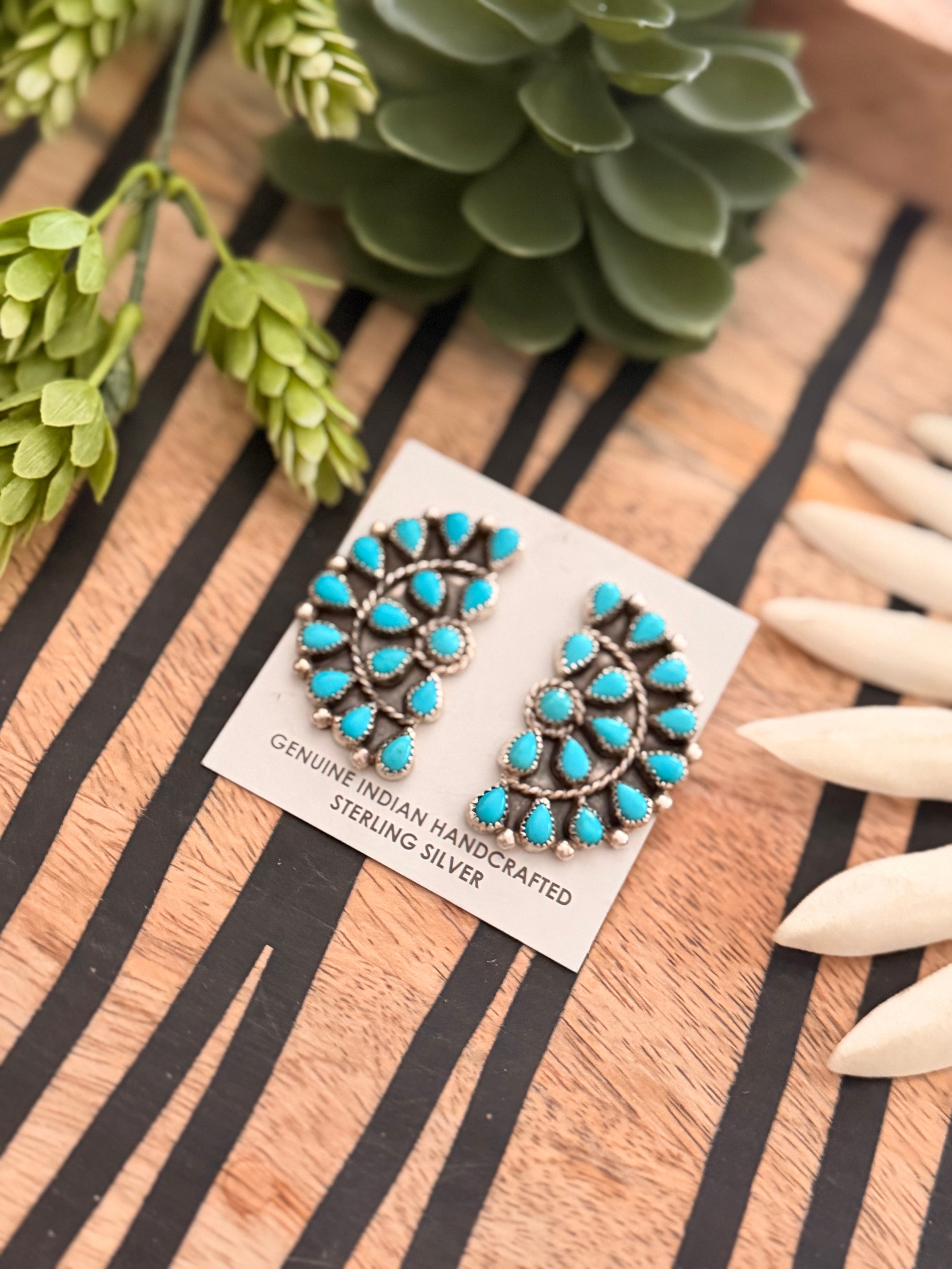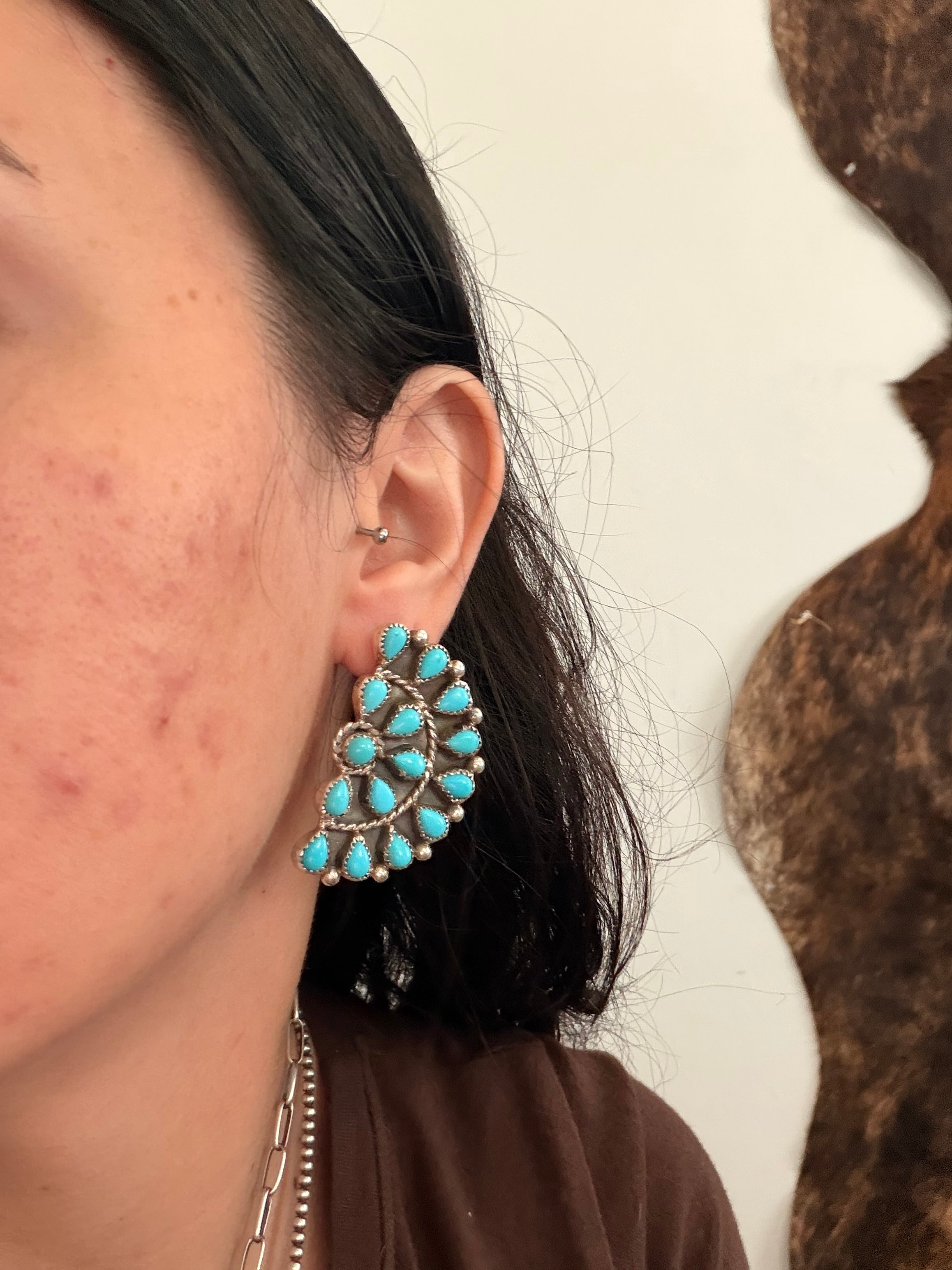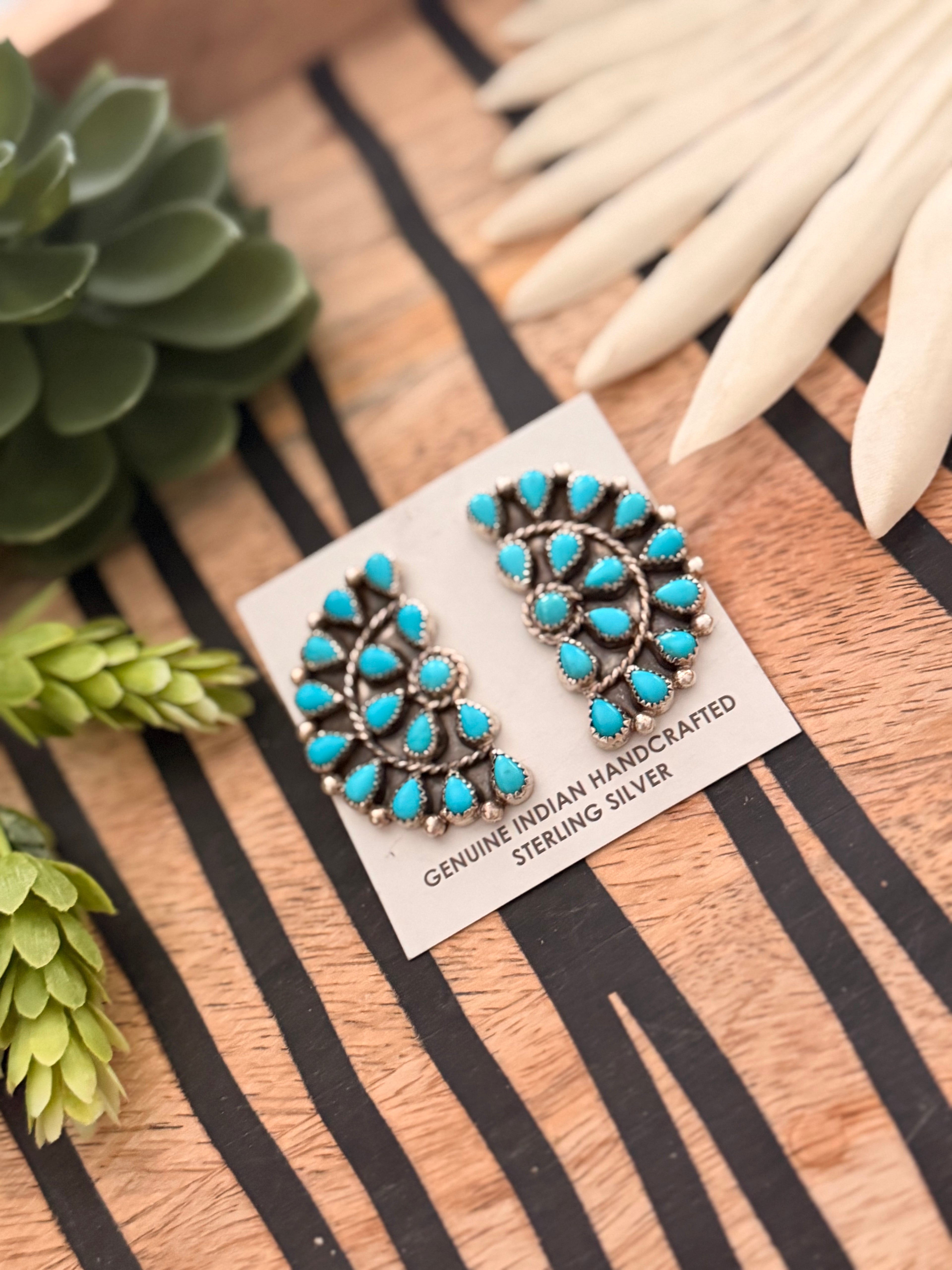Navajo Made Kingman Turquoise & Sterling Silver Post Dangle Cluster Earrings