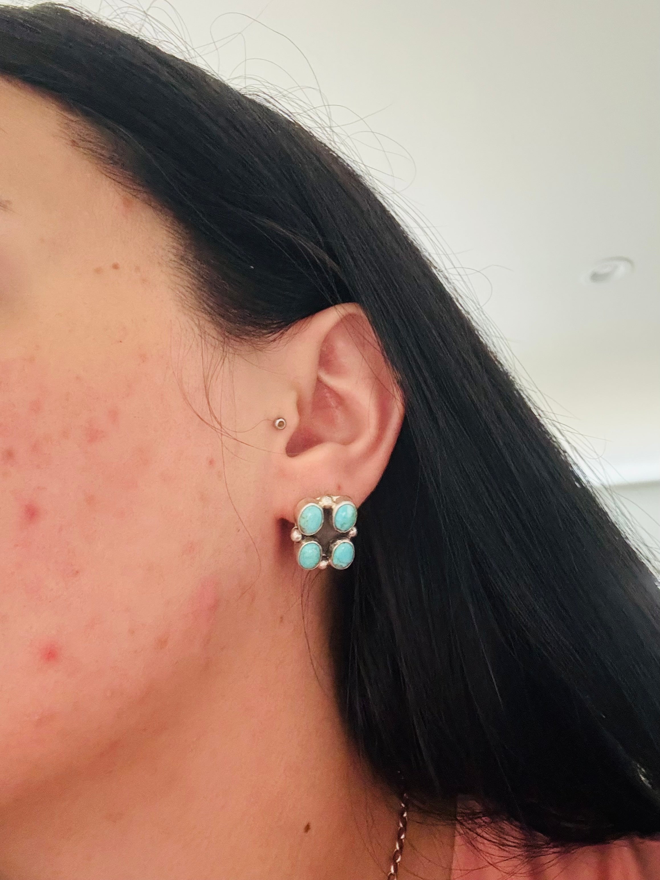 Navajo Made Kingman Turquoise & Sterling Silver Post Cluster Earrings. They measure 3/4 of an inch long and 5/8 of an inch wide . Stamped sterling silver and signed by the artist.