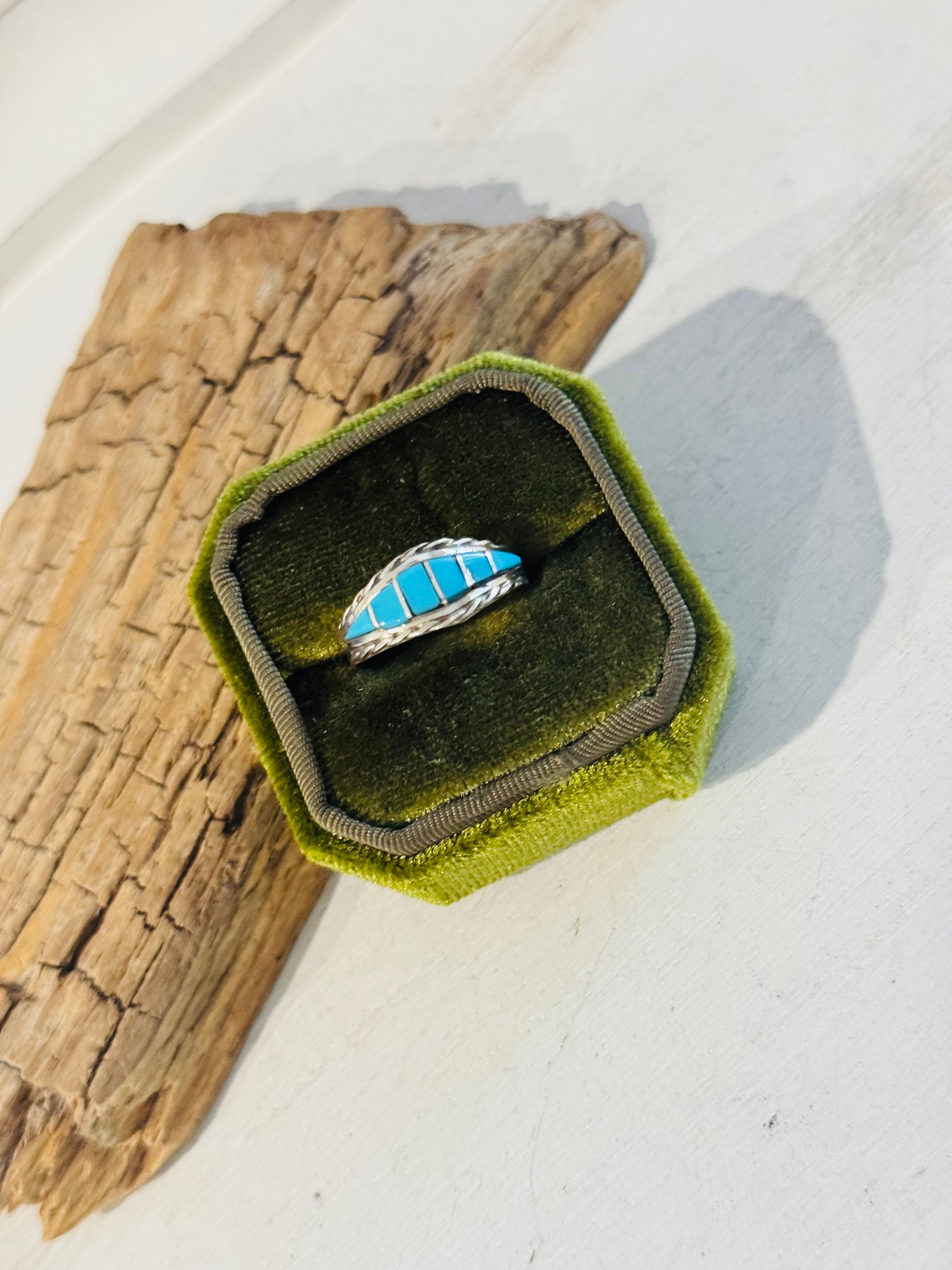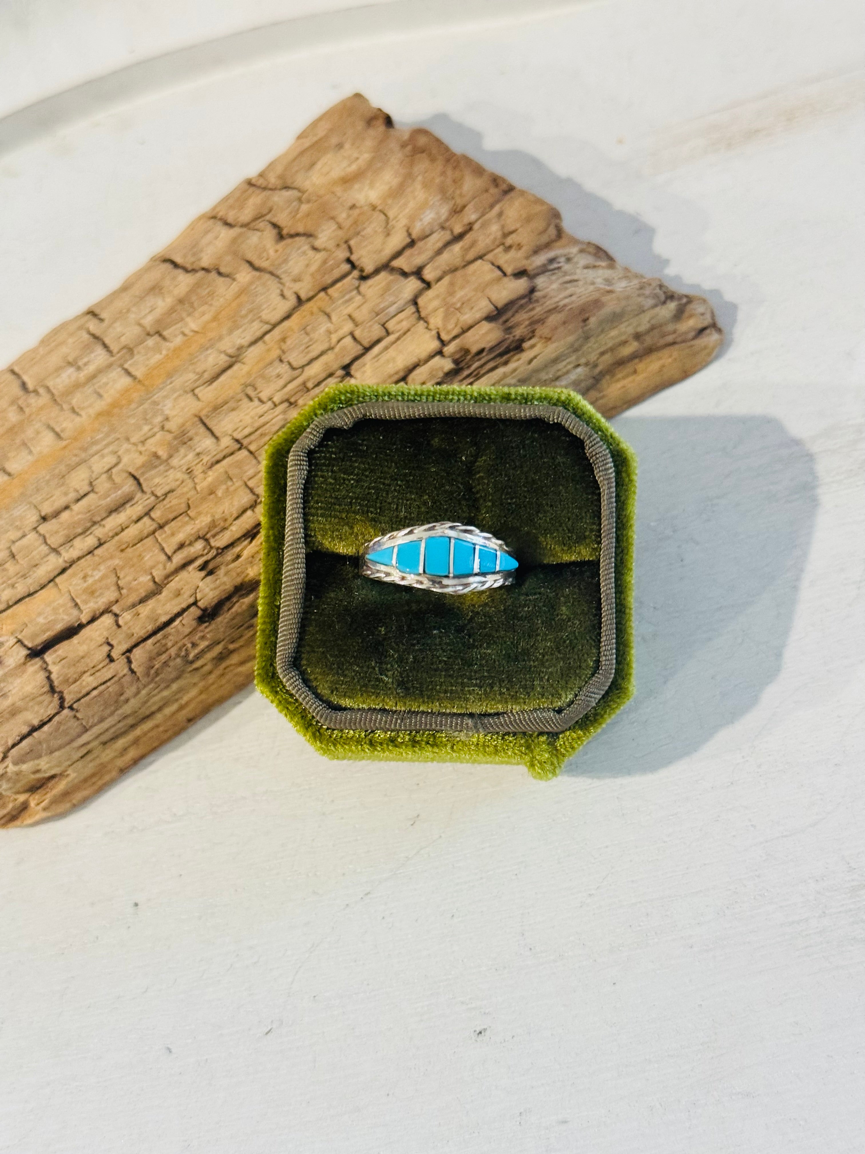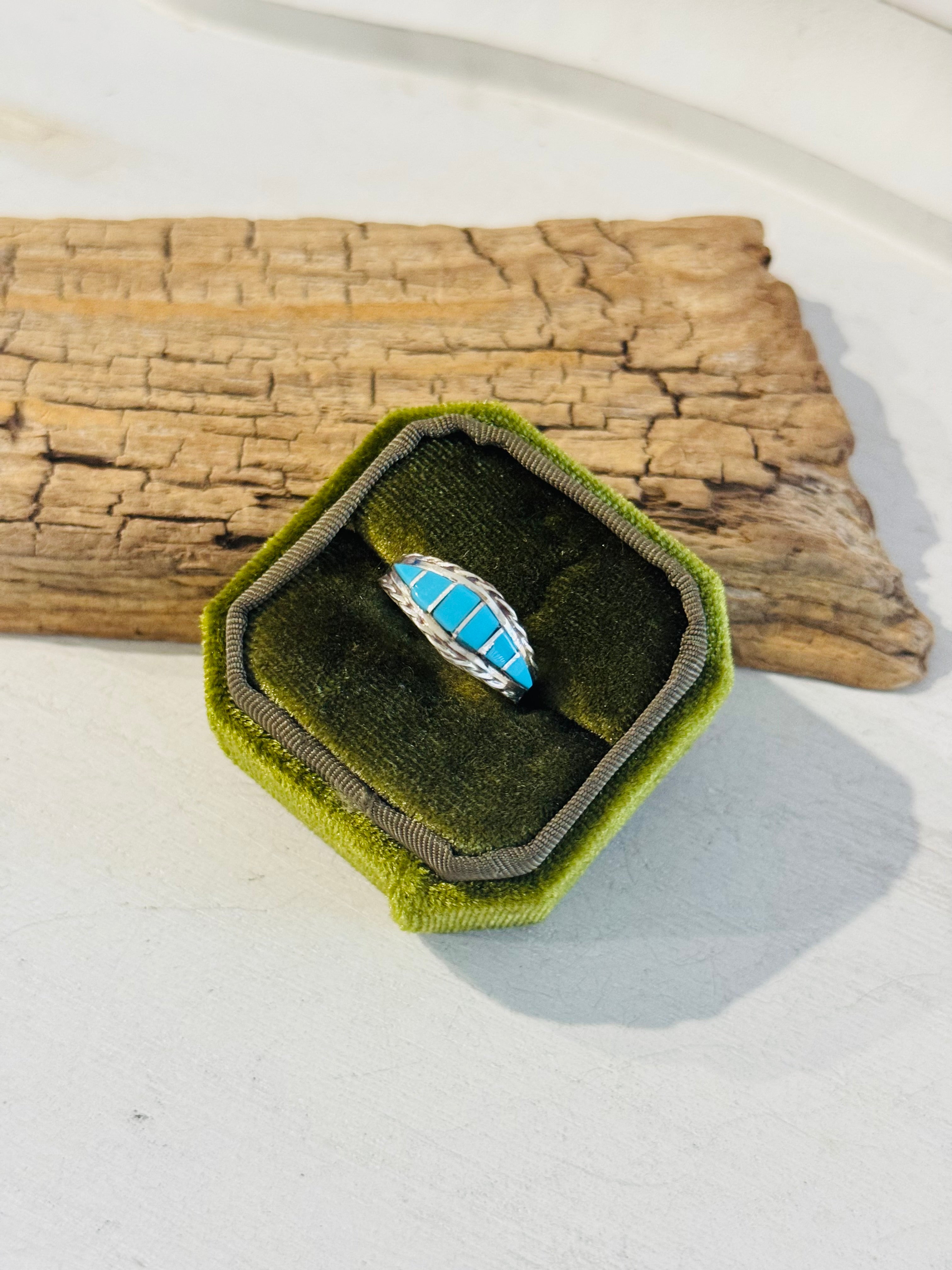 Navajo Made Kingman Turquoise & Sterling Silver Ring. It measures 1/2 of an inch long. Stamped sterling silver.