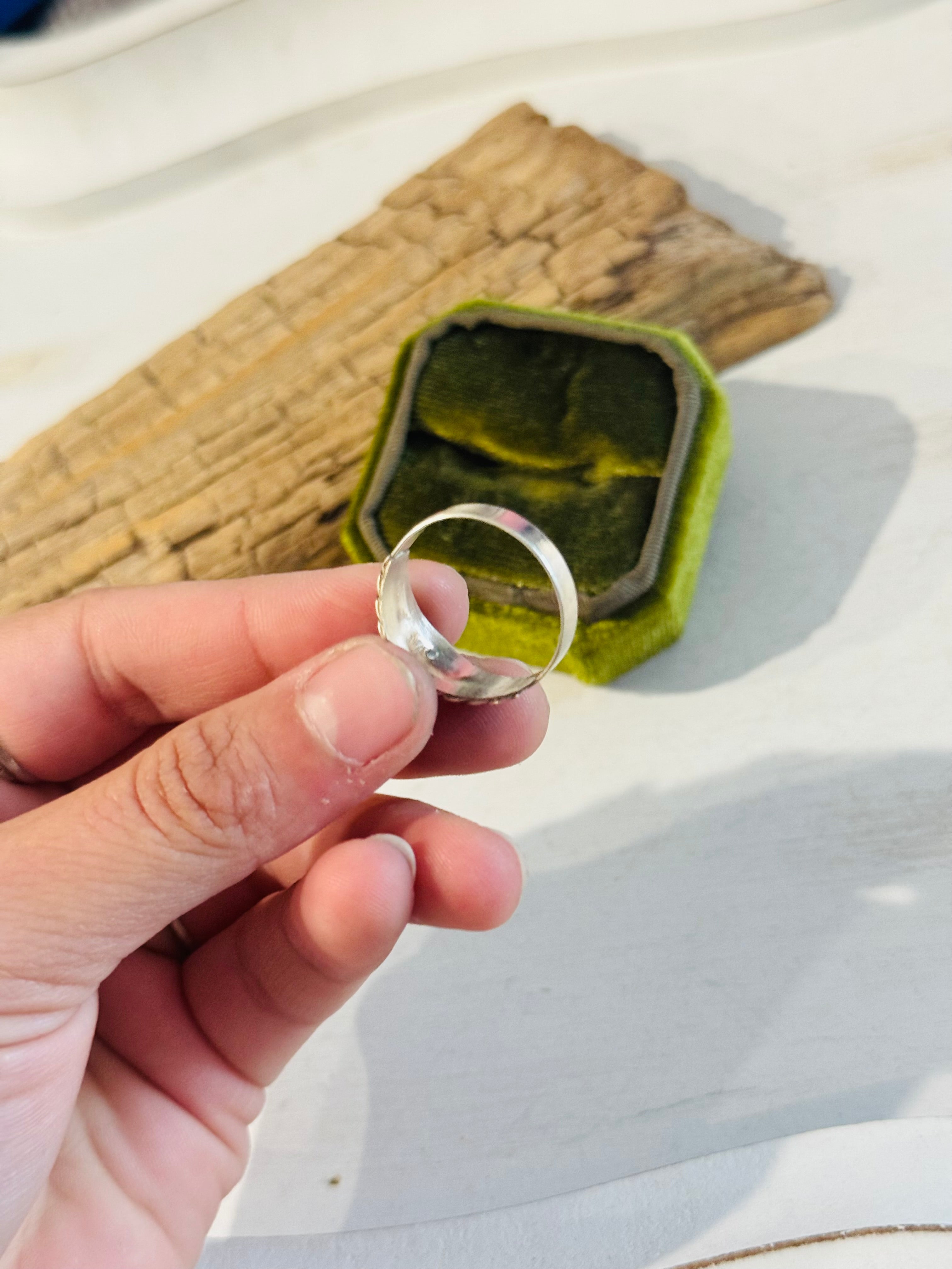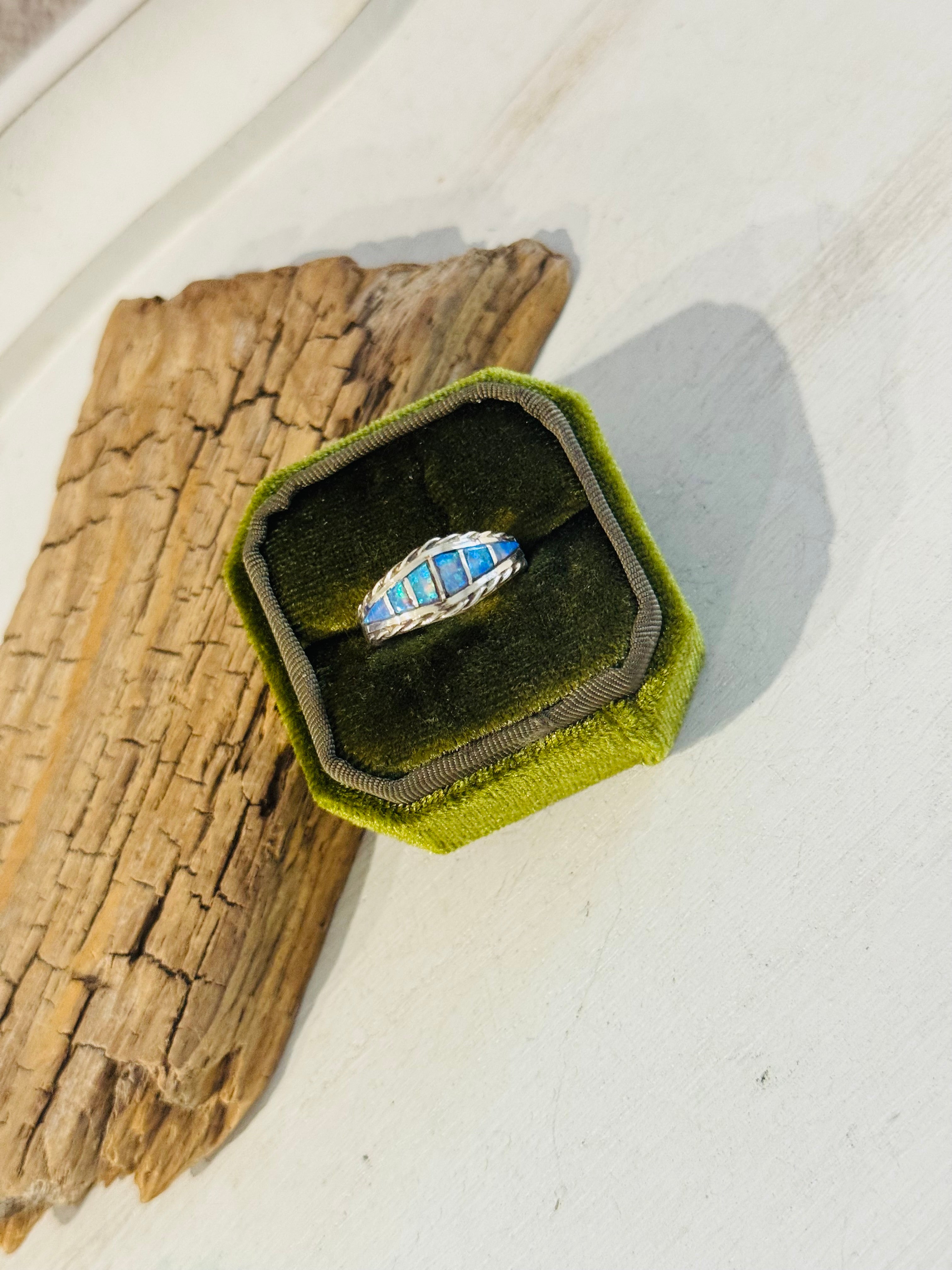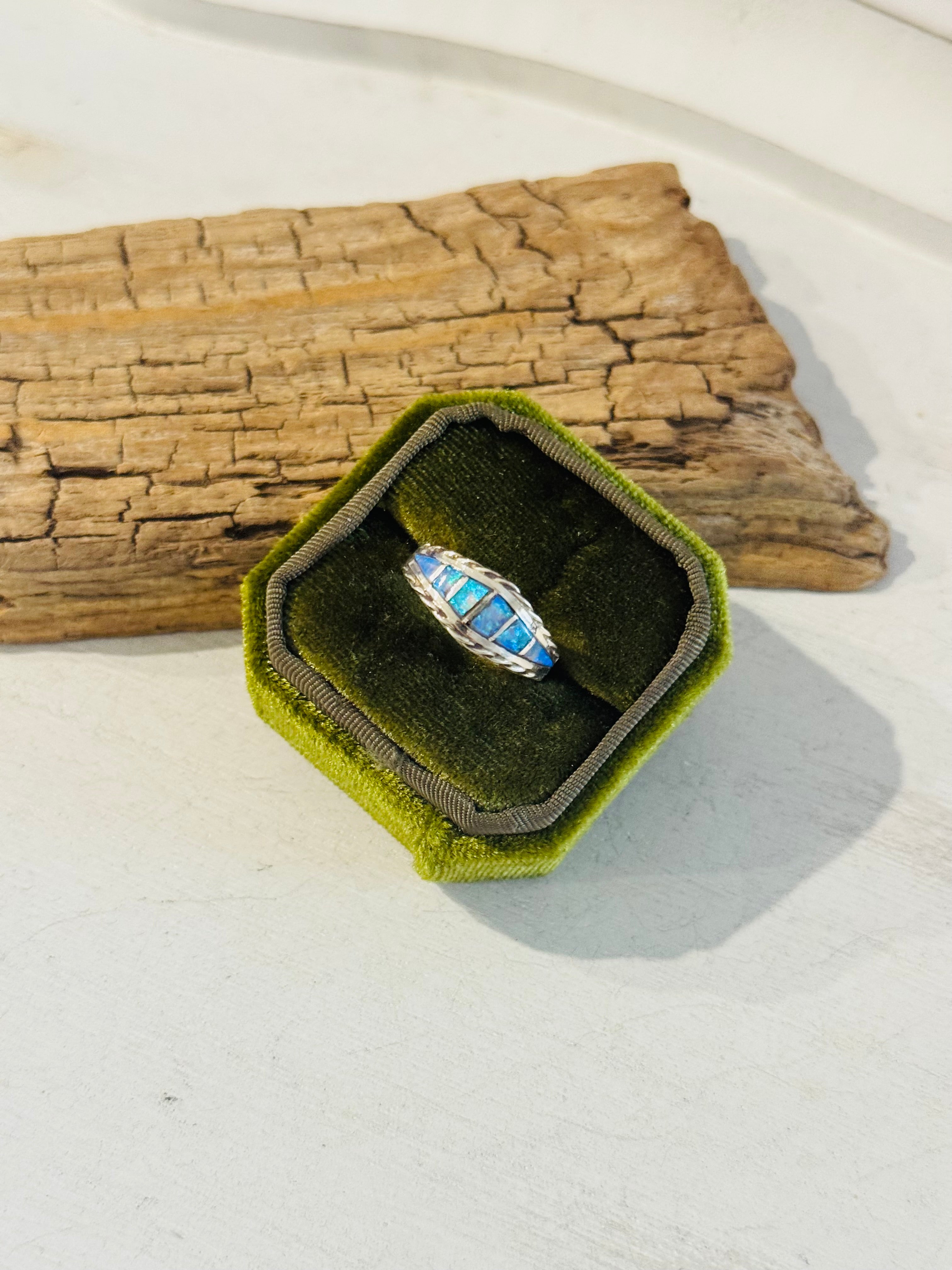 Navajo Made Blue Opal (Man Made) & Sterling Silver Ring. It measures 1/2 of an inch long. Stamped sterling silver.