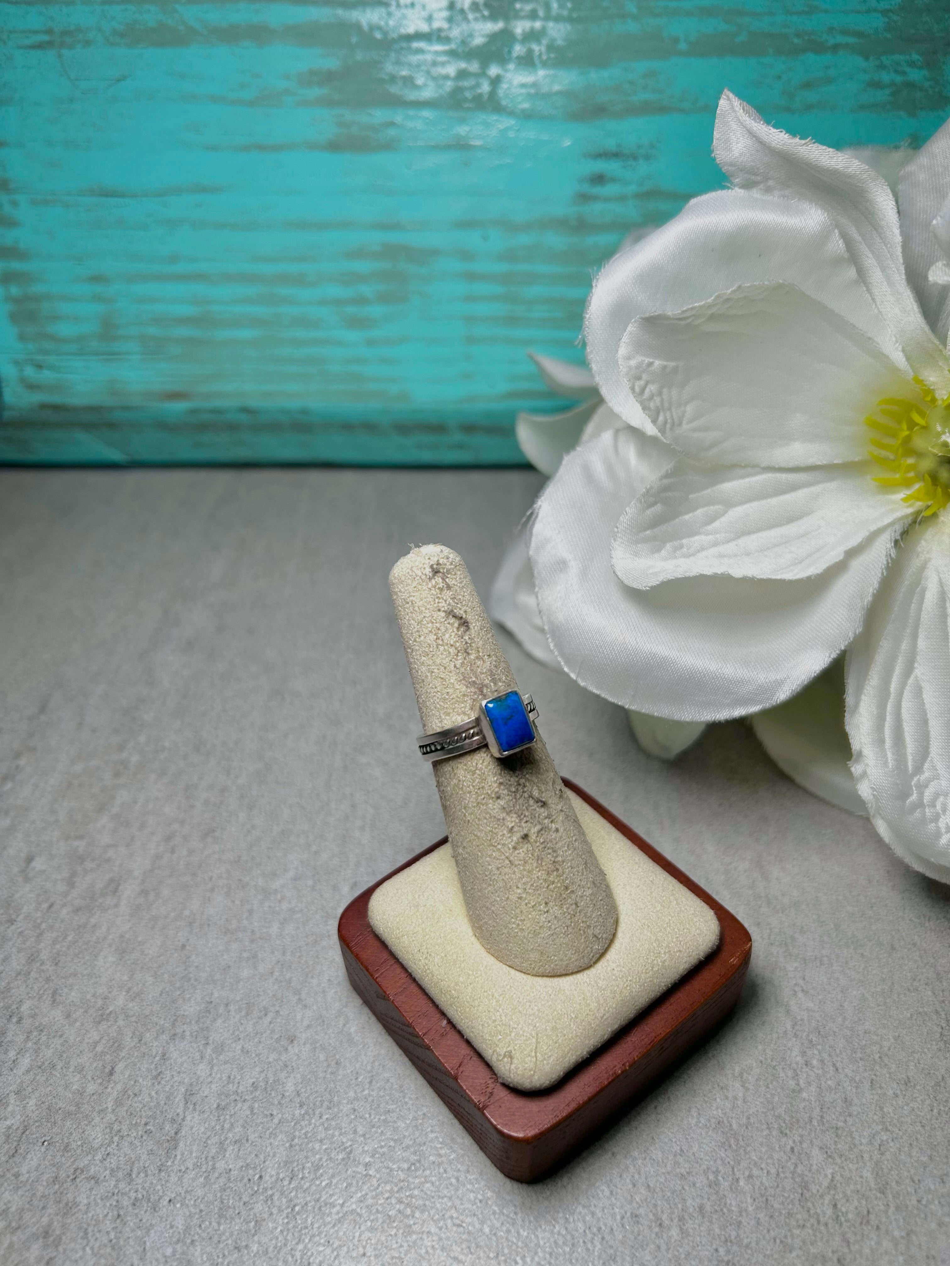 Navajo Made Lapis & Sterling Silver Ring. It measures 3/8 of an inch long and 1/4 of an inch wide. Signed by the artist and stamped sterling silver.