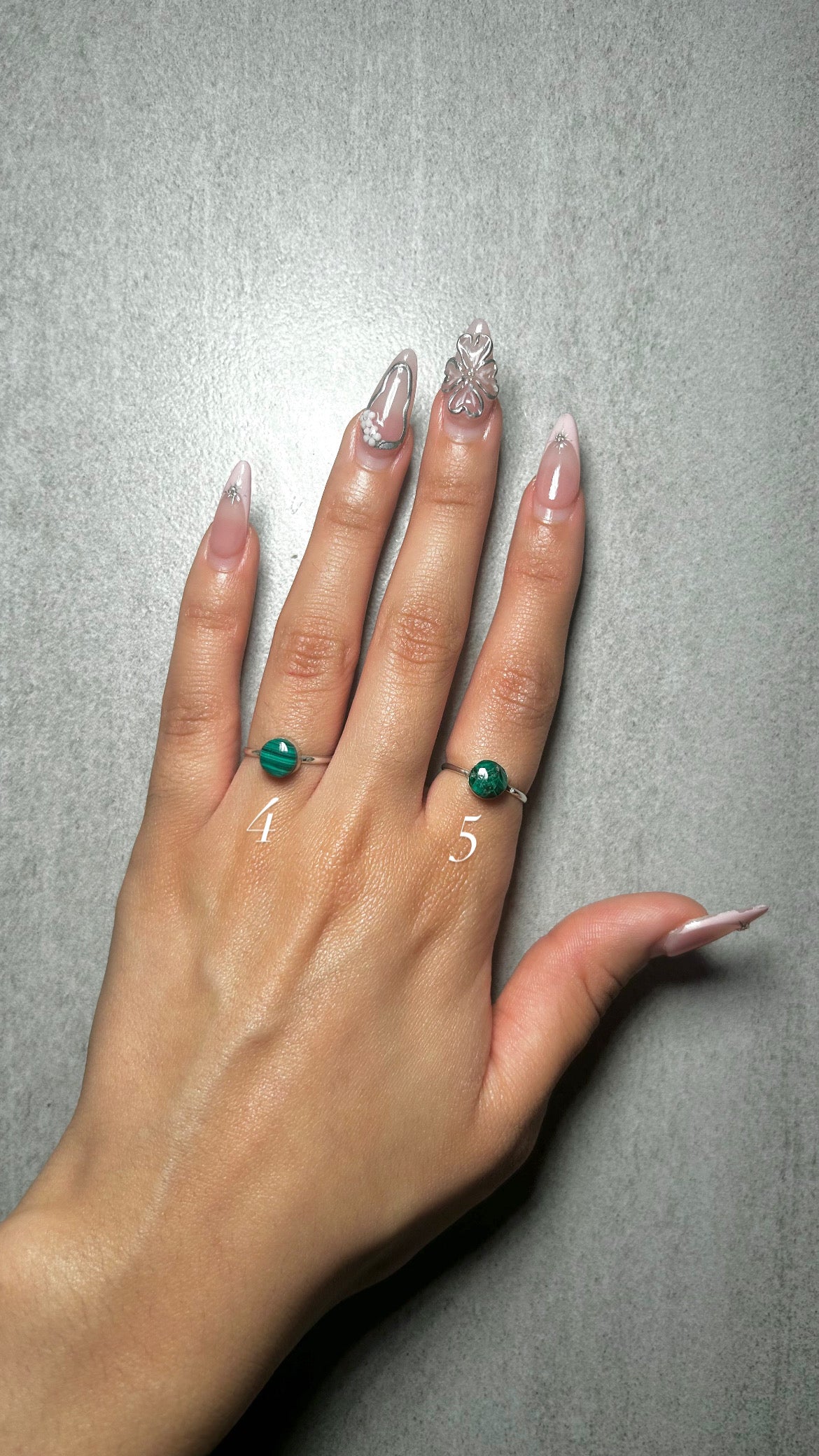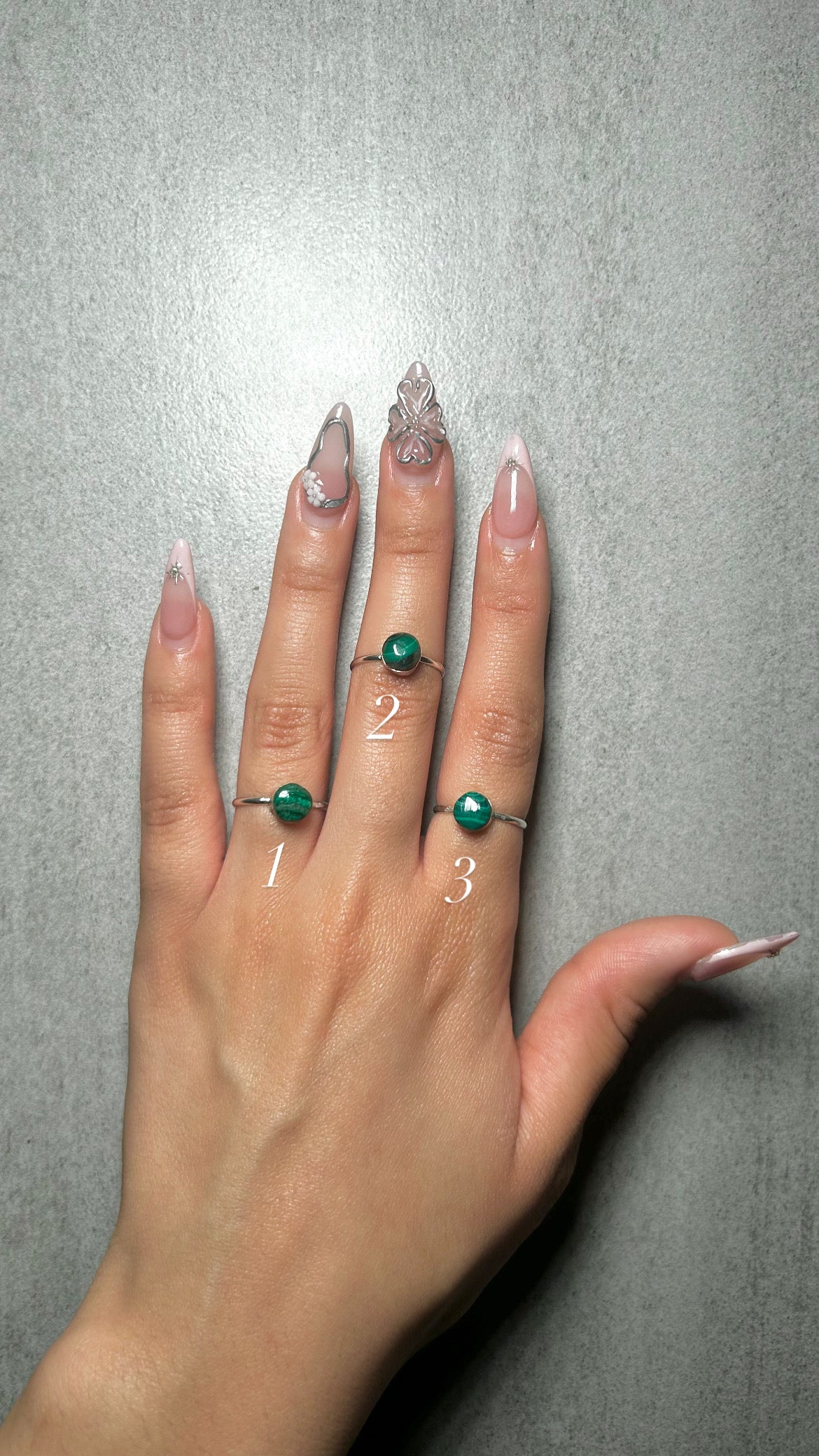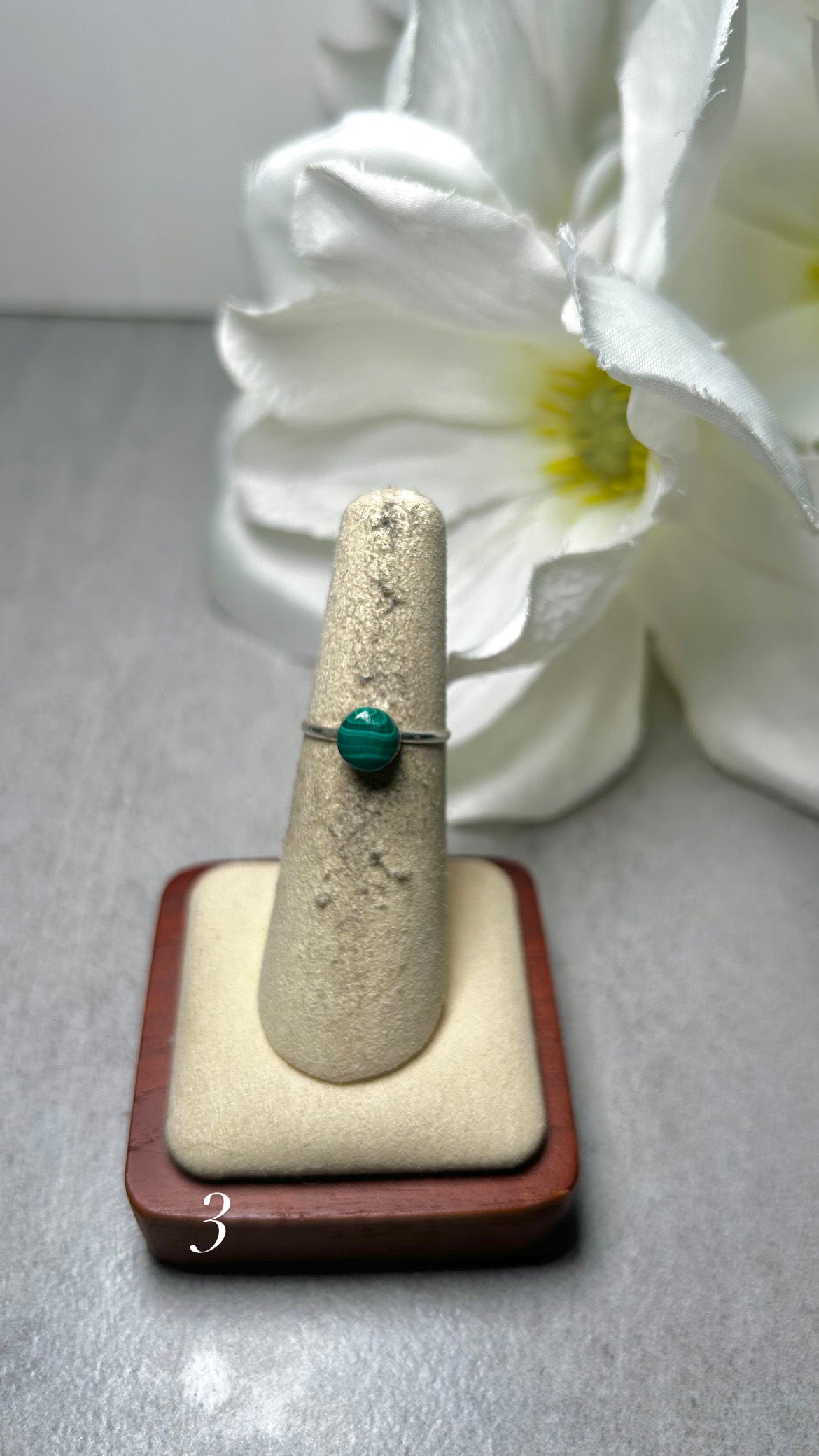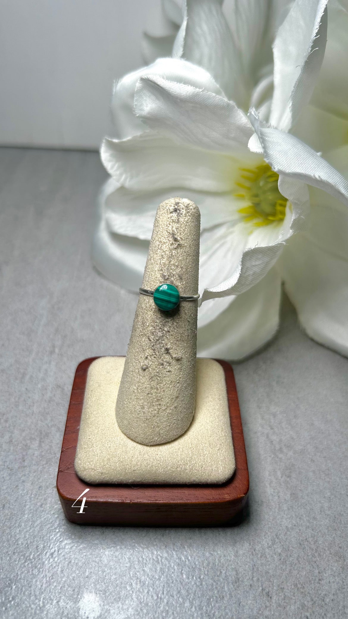 Navajo Made Malachite & Sterling Silver Ring. It measures 1/4 of an inch long and 1/4 of an inch wide. Signed by the artist and stamped sterling silver.