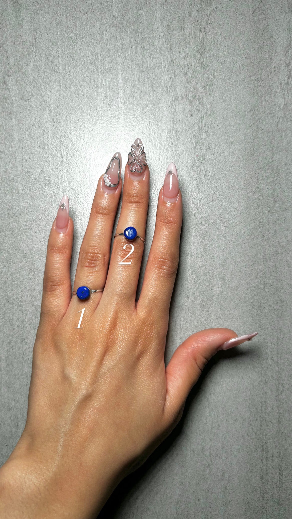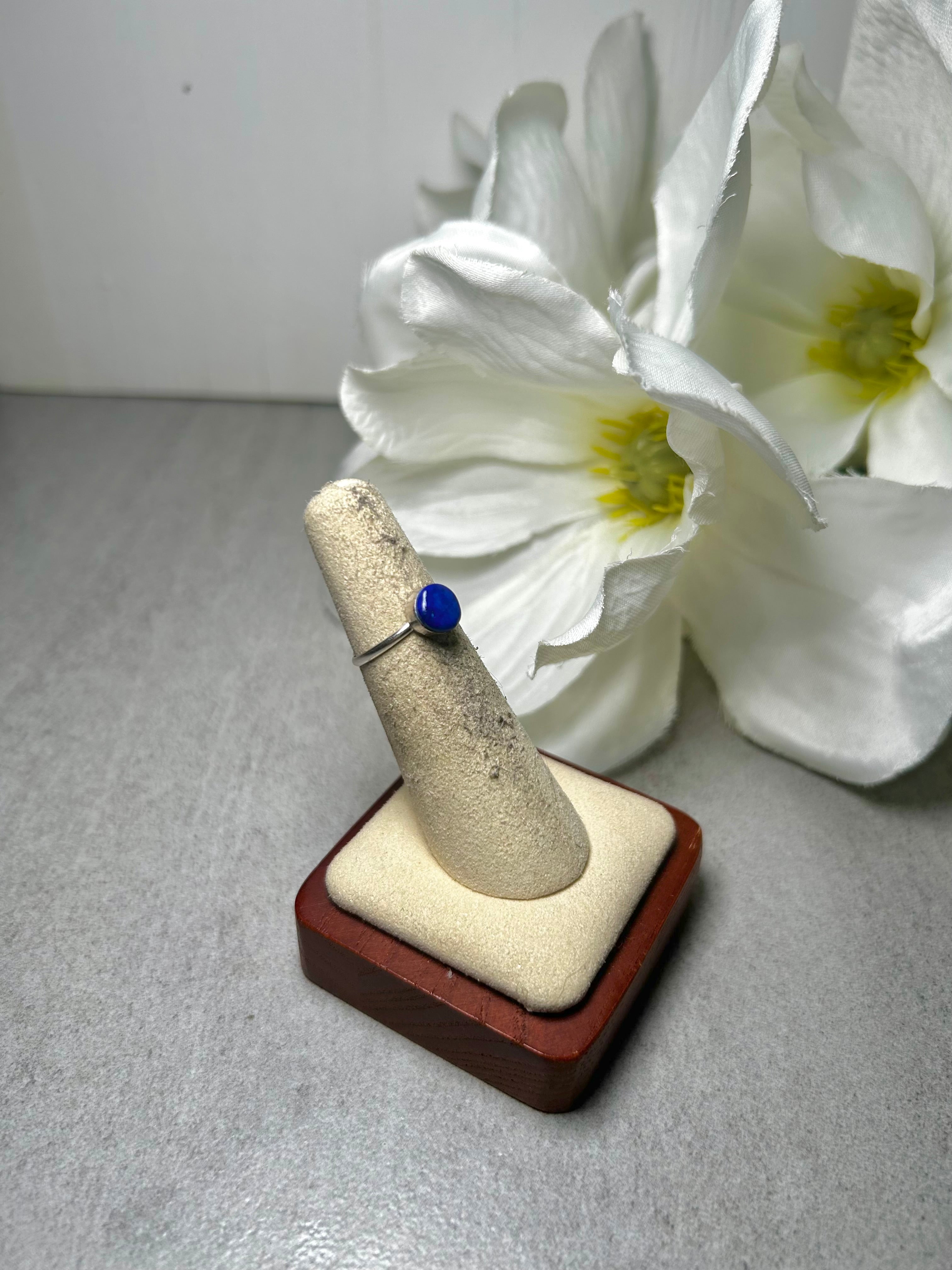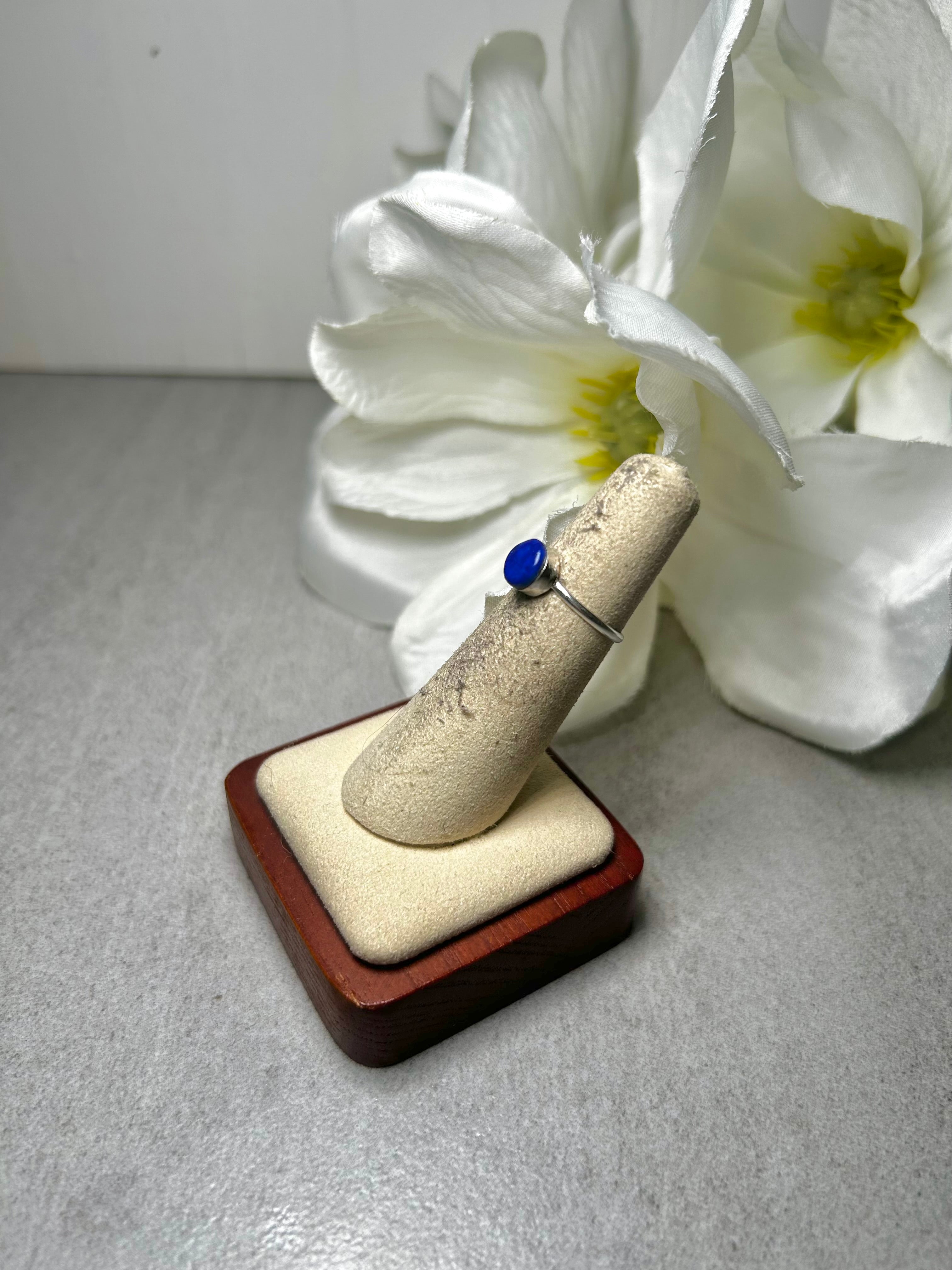 Navajo Made Lapis & Sterling Silver Ring. It measures 1/4 of an inch long and 1/4 of an inch wide. Signed by the artist and stamped sterling silver.