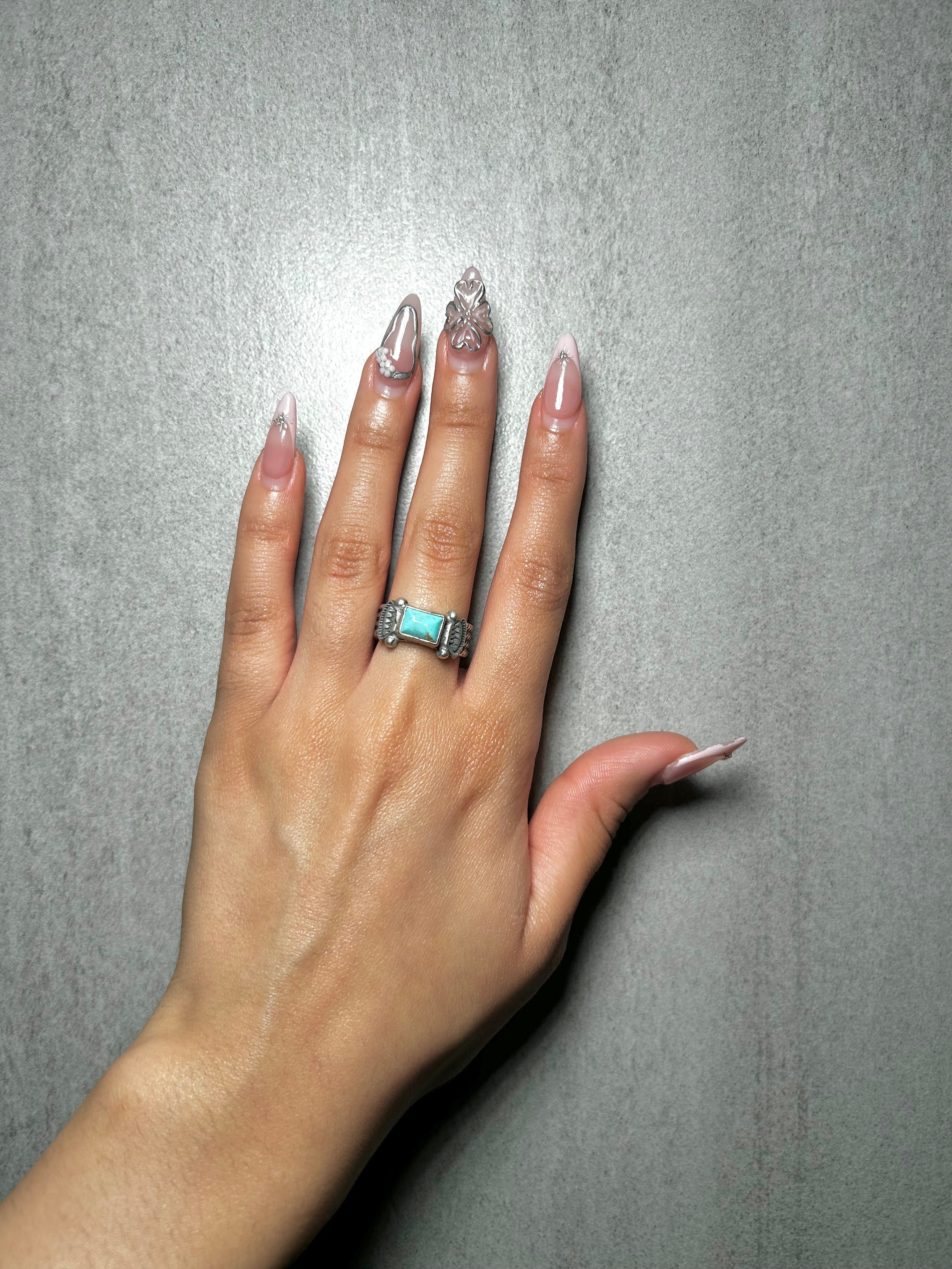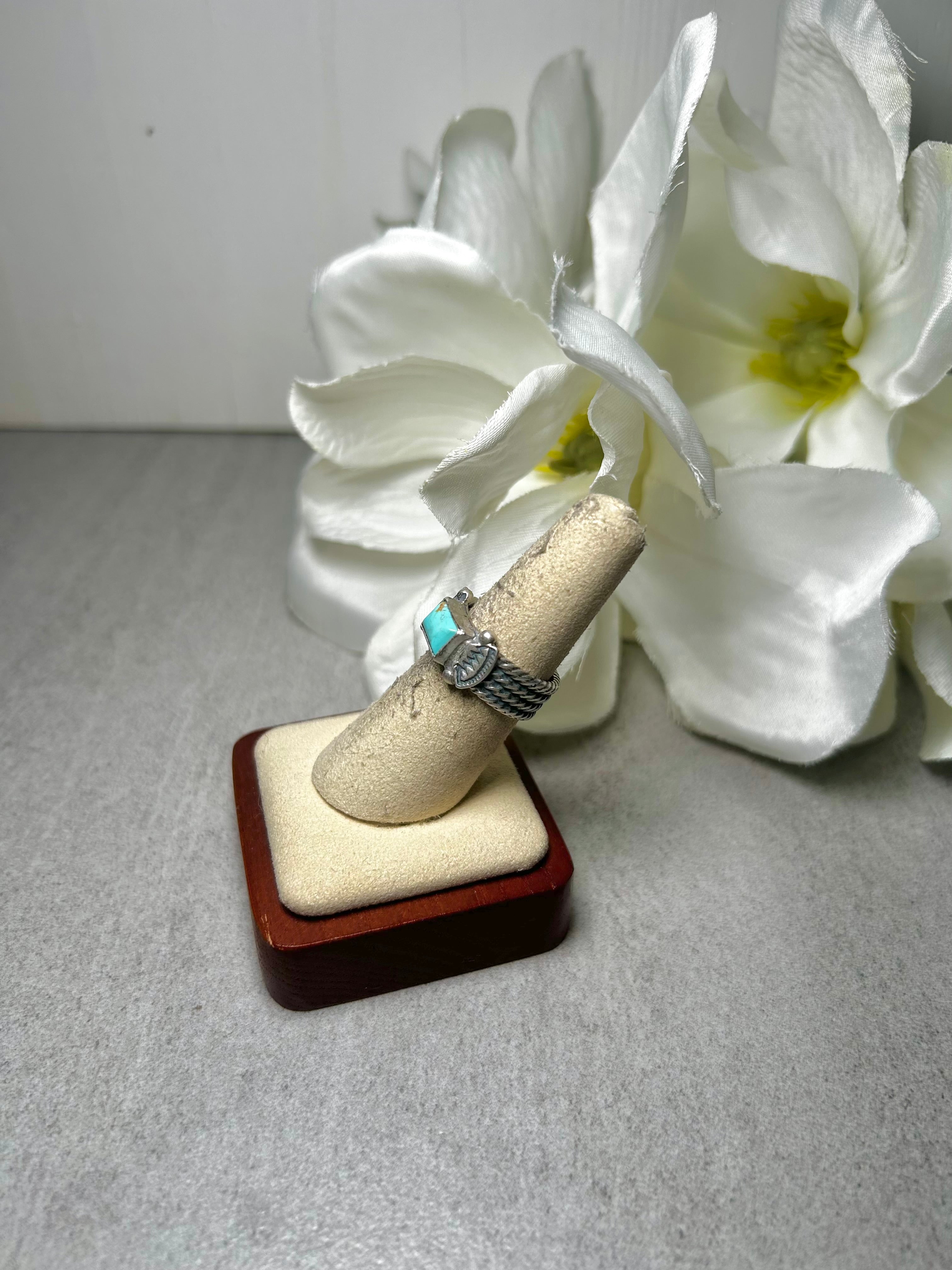 Navajo Made Kingman Turquoise & Sterling Silver Ring. It measures 1/2 of an inch long and 3/8 inch wide. Signed by the artist and stamped sterling silver.