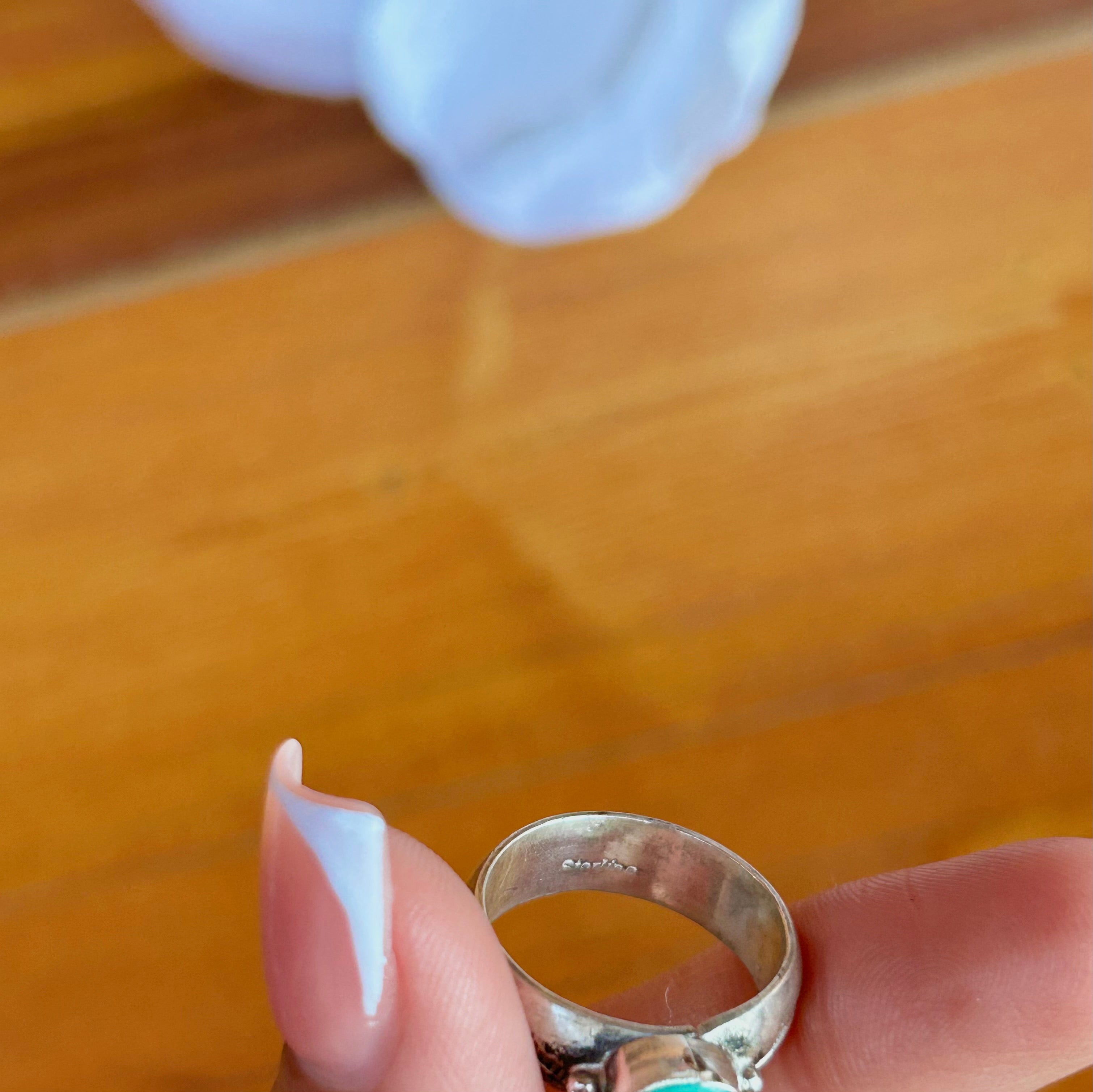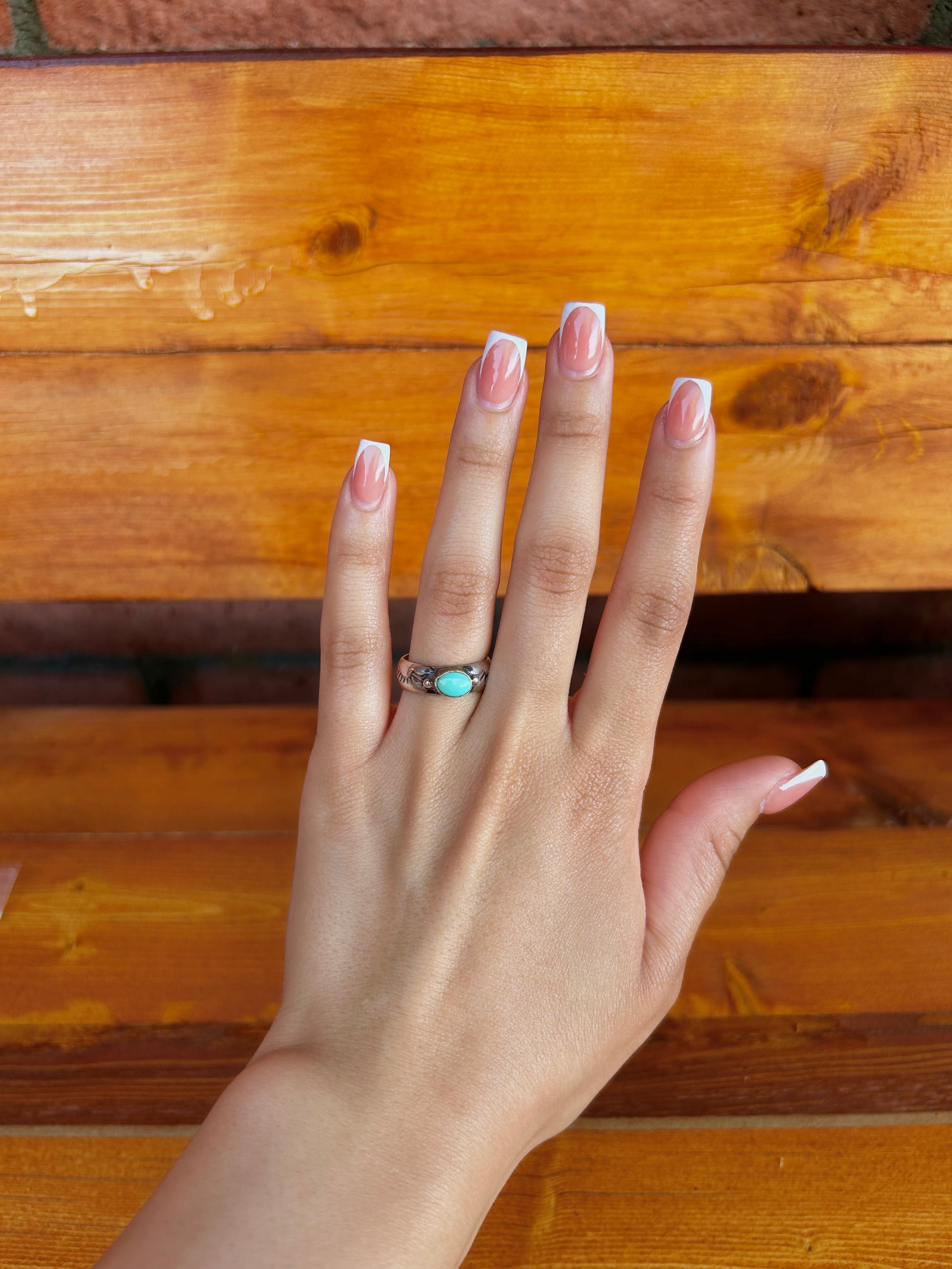 Navajo Made Kingman Turquoise & Sterling Silver Ring Size 6.5. It measures 1/2 of an inch long and 1/4 of an inch wide. Signed by the artist and stamped sterling silver.