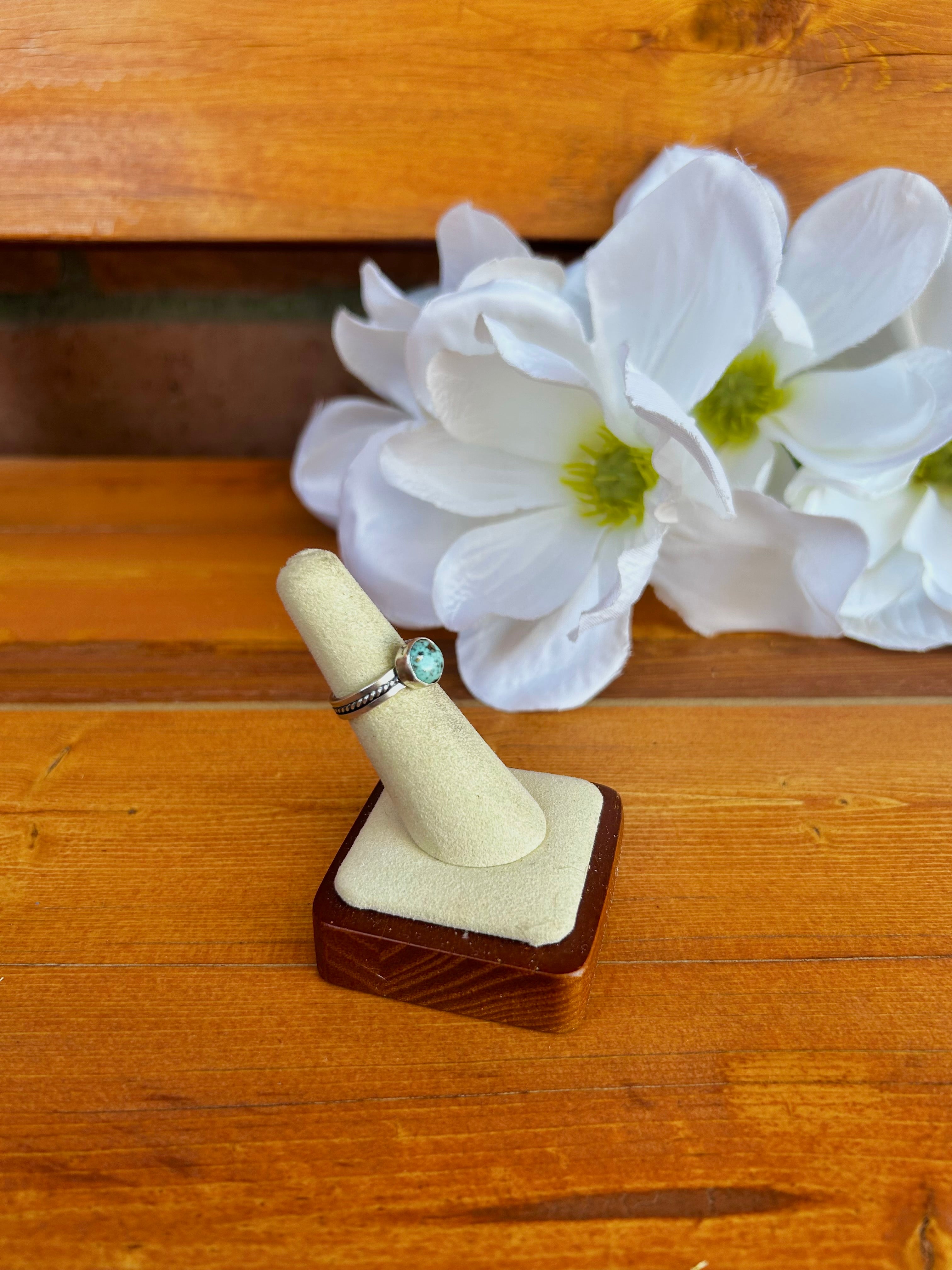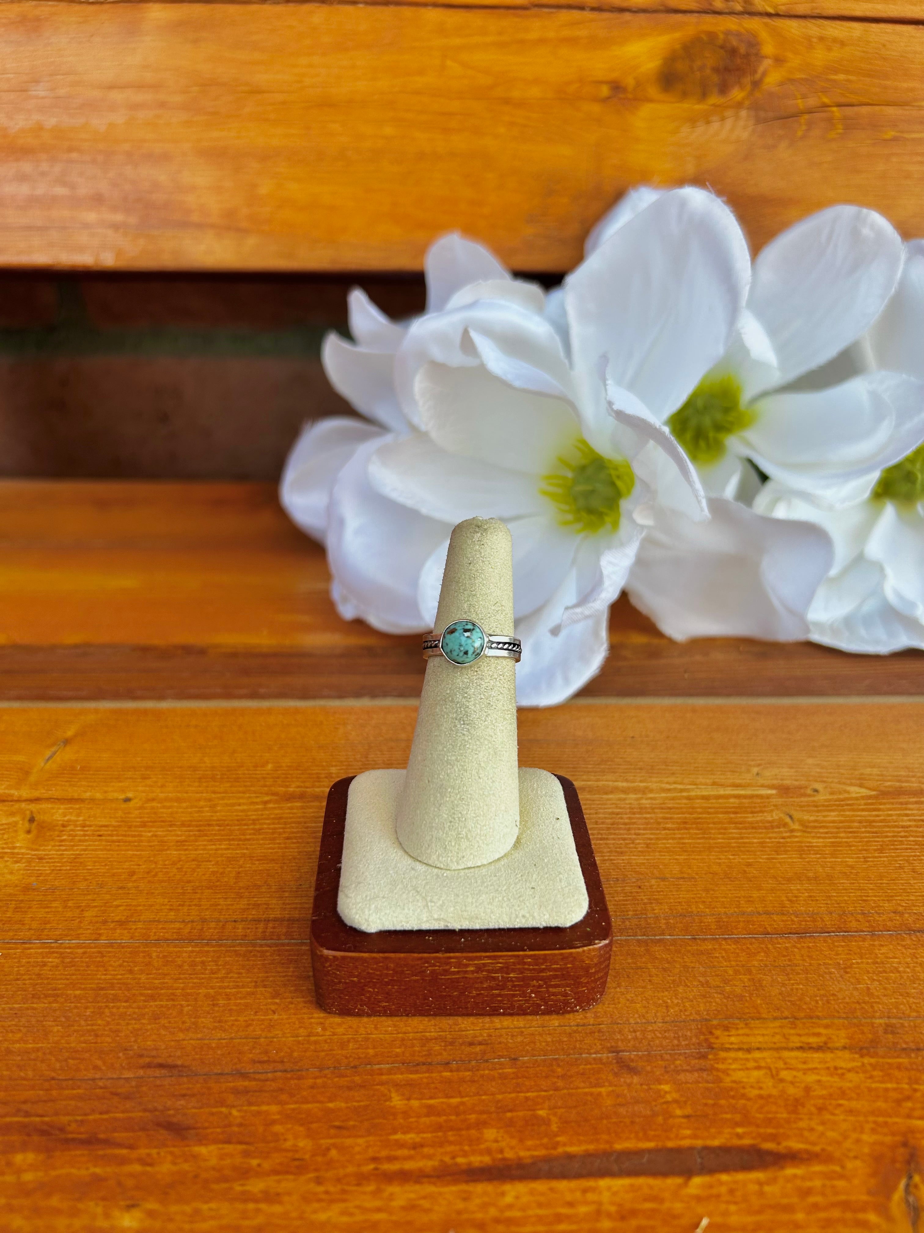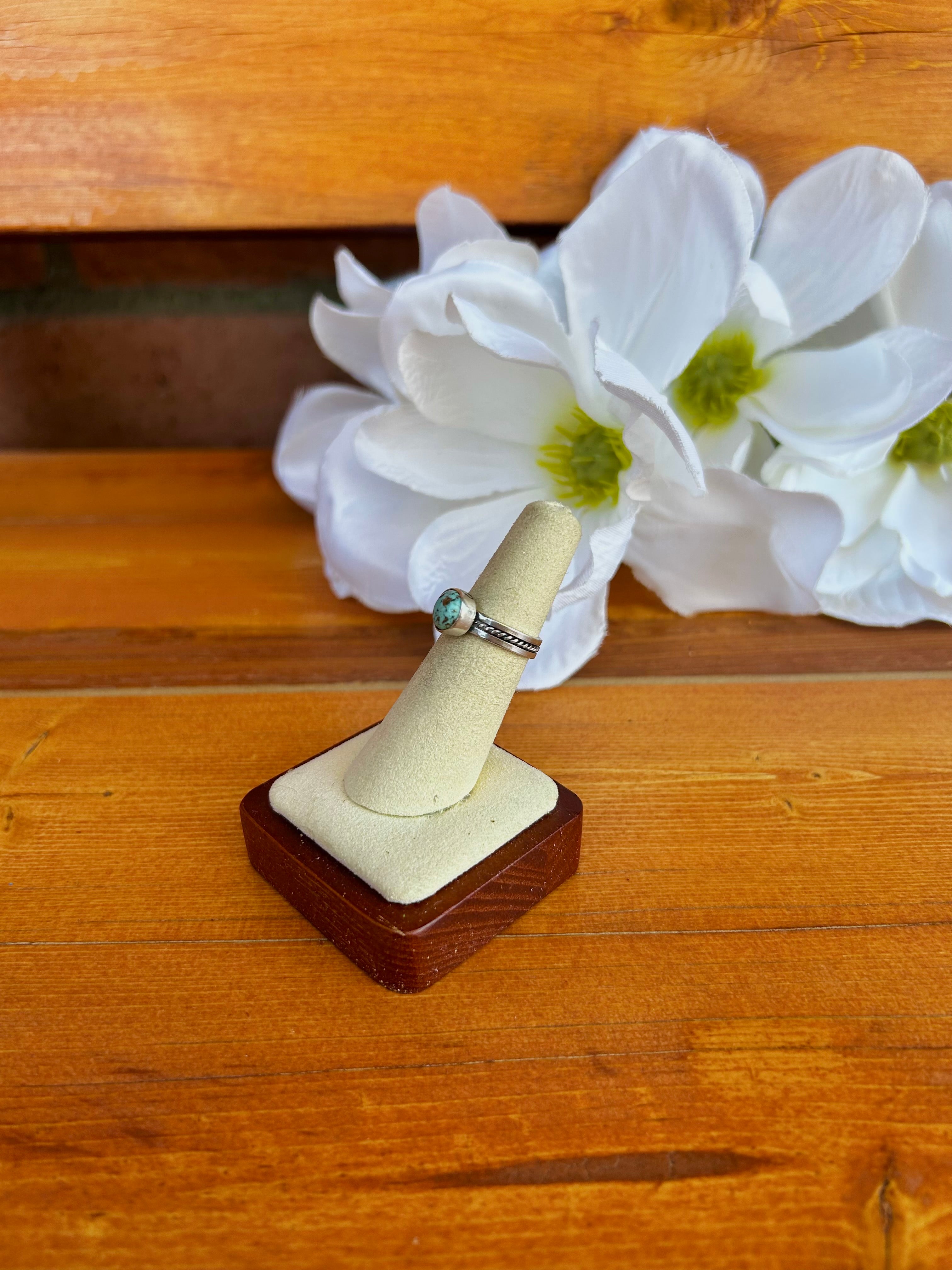 Navajo Made Kingman Turquoise & Sterling Silver Ring Size 5. It measures 1/4 of an inch long and 1/4 of an inch wide. Signed by the artist and stamped sterling silver.