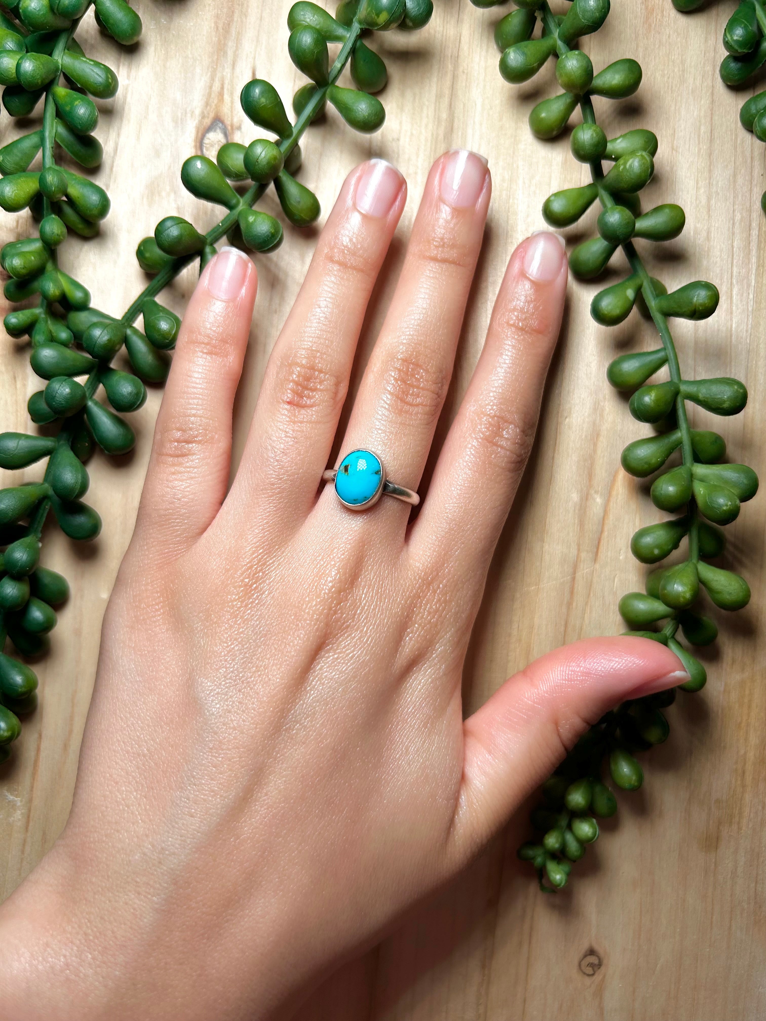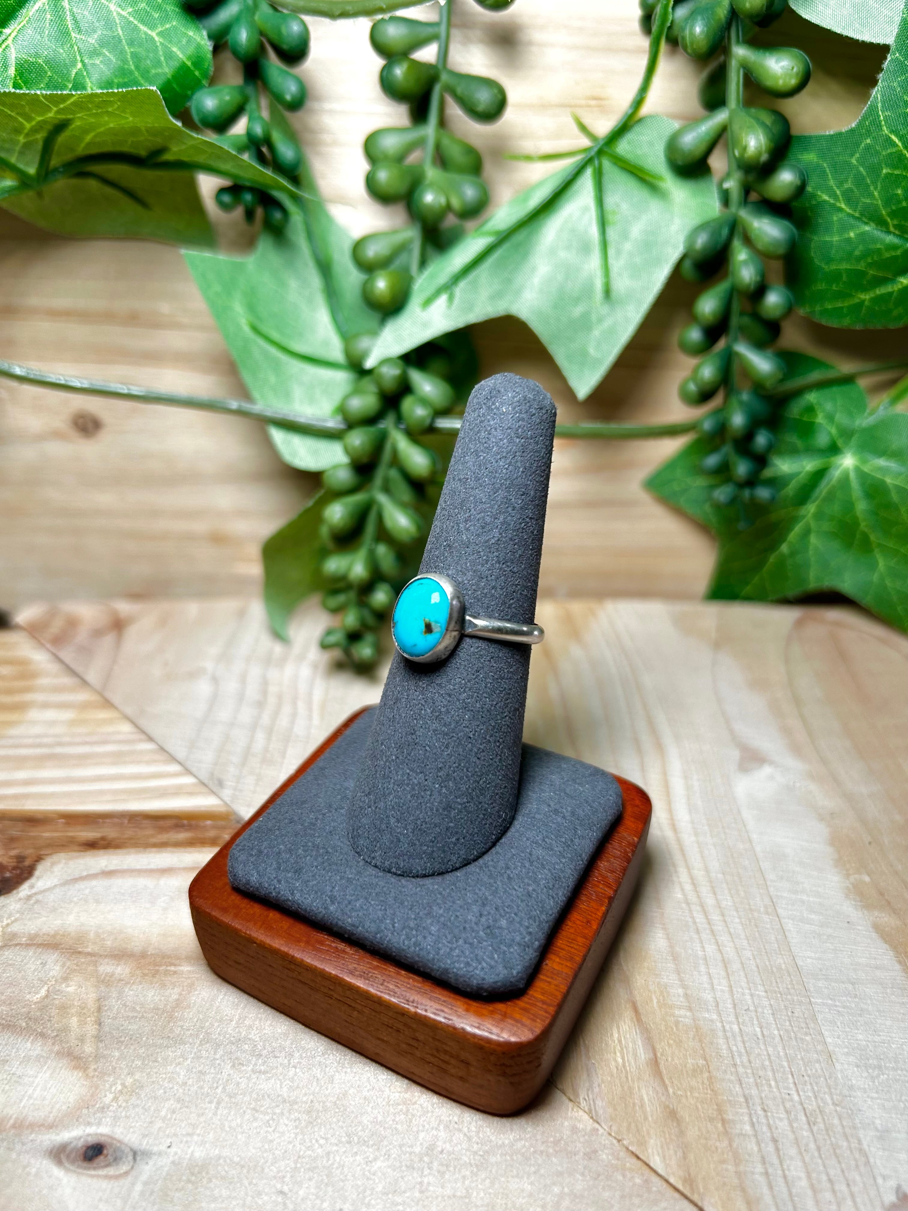 Navajo Made Kingman Turquoise & Sterling Silver  Ring Size 7. It measures 1/2 of an inch long and 3/8 of an inch wide. Signed by the artist and stamped sterling silver.