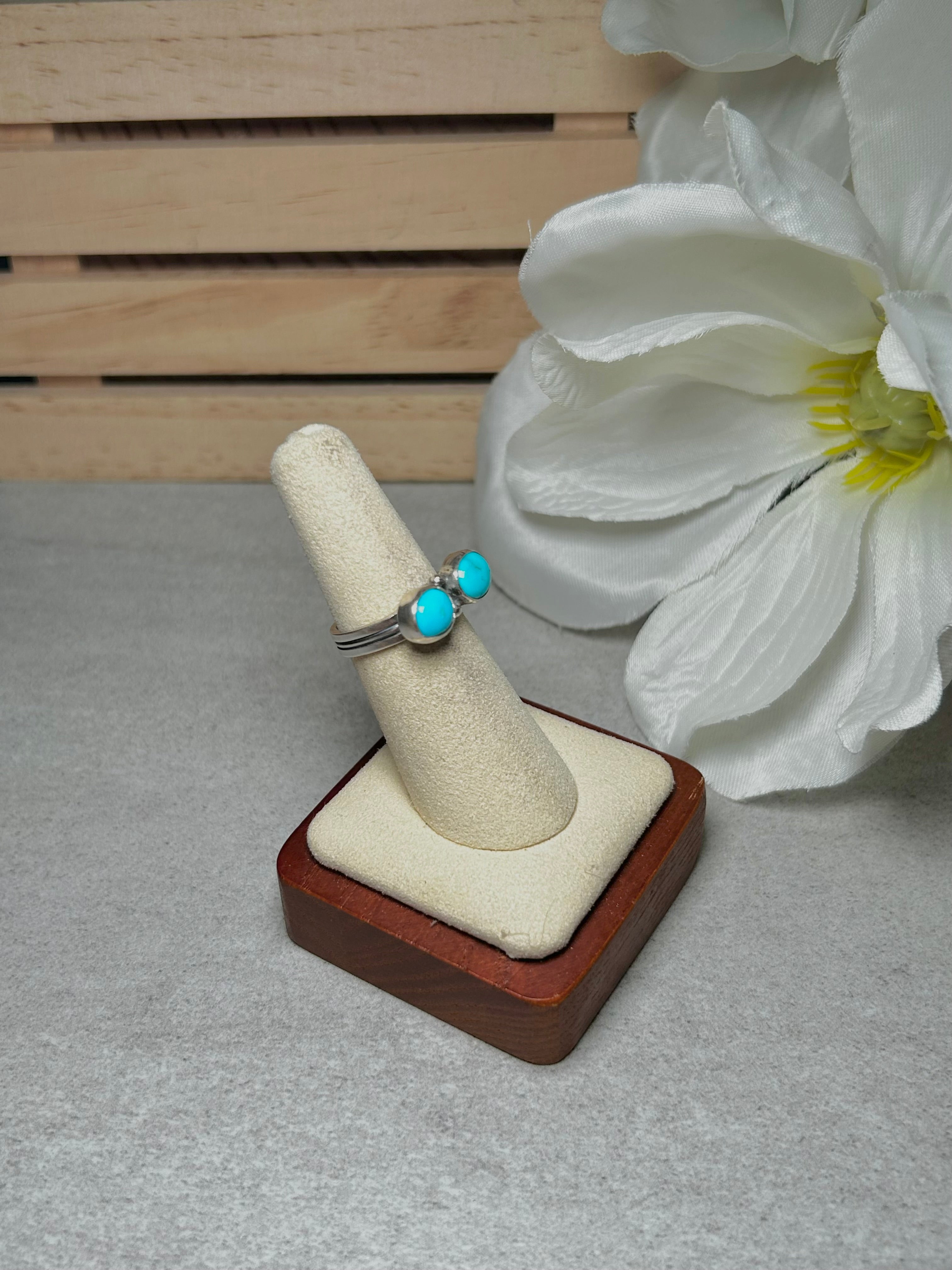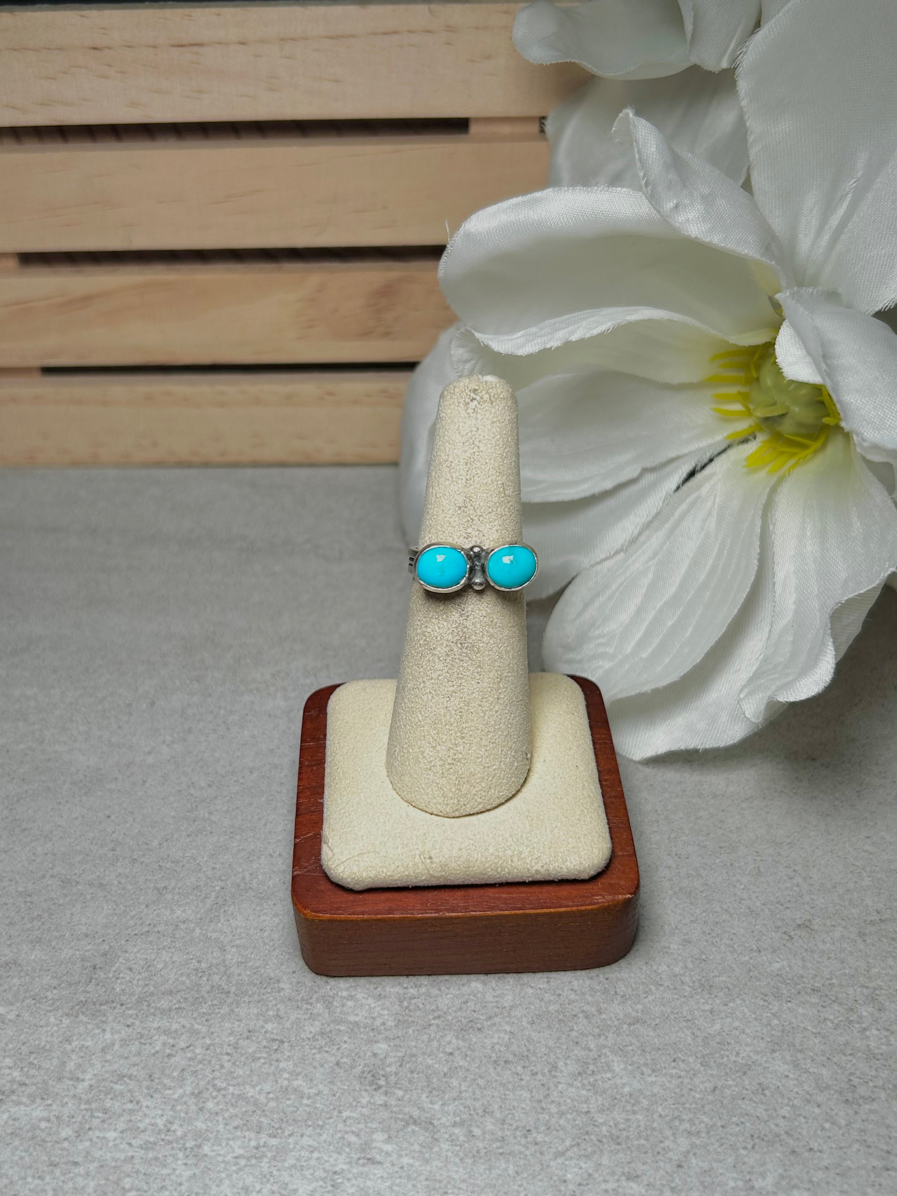 Navajo Made Kingman Turquoise & Sterling Silver Ring. It measures 5/8 of an inch long and 1/4 of an inch wide. Signed by the artist and stamped sterling silver. Stones may vary due to natural stones