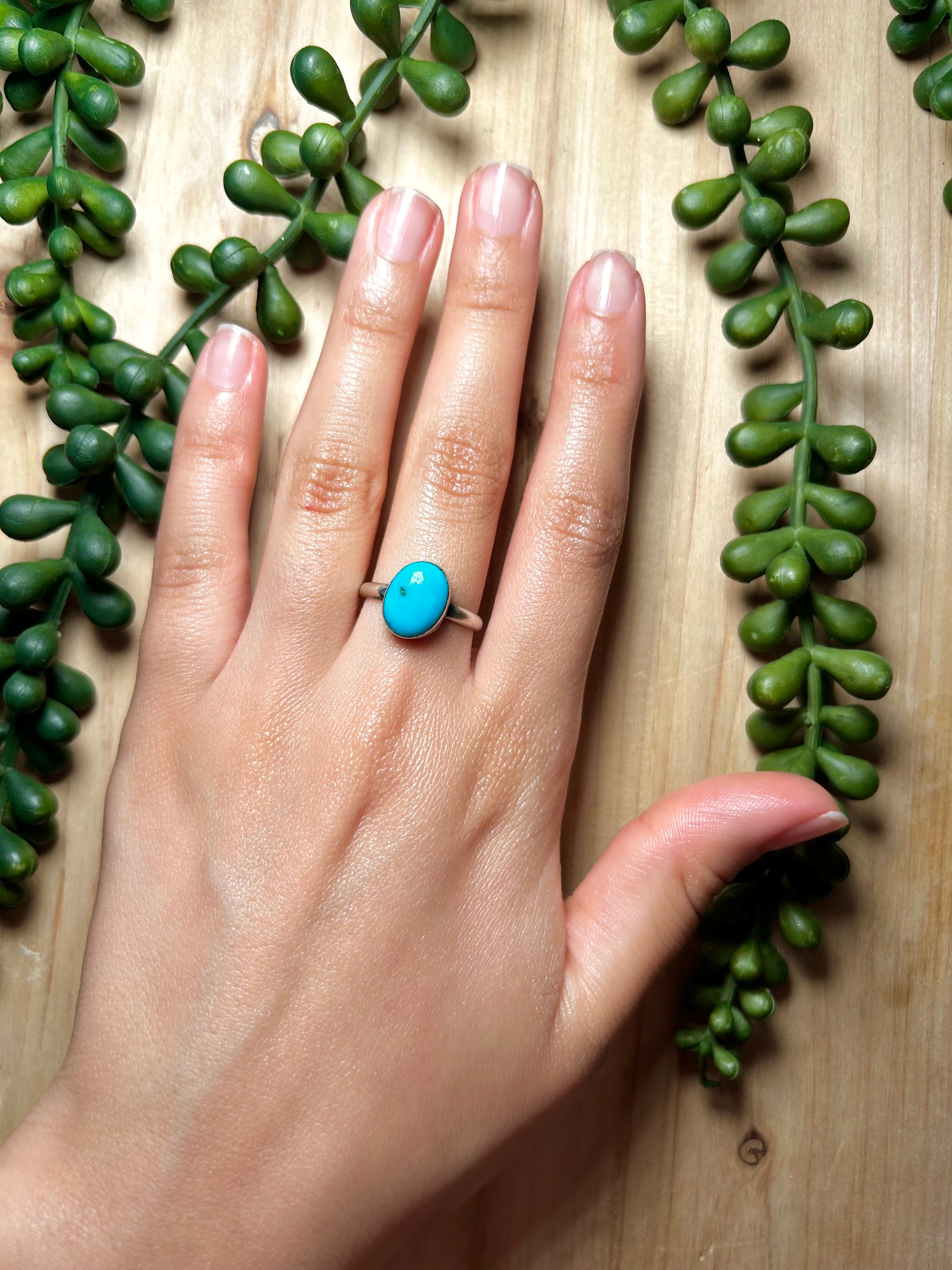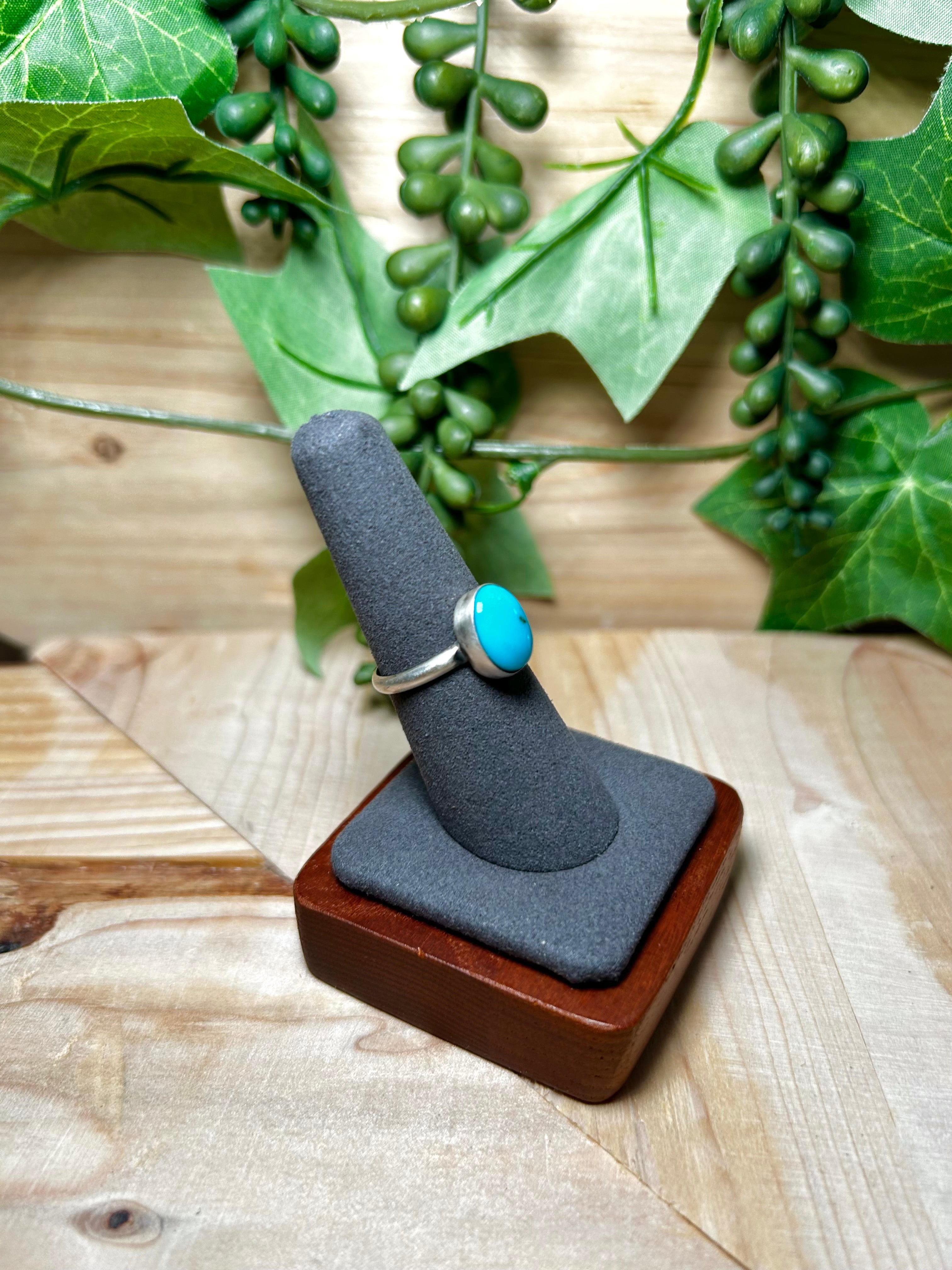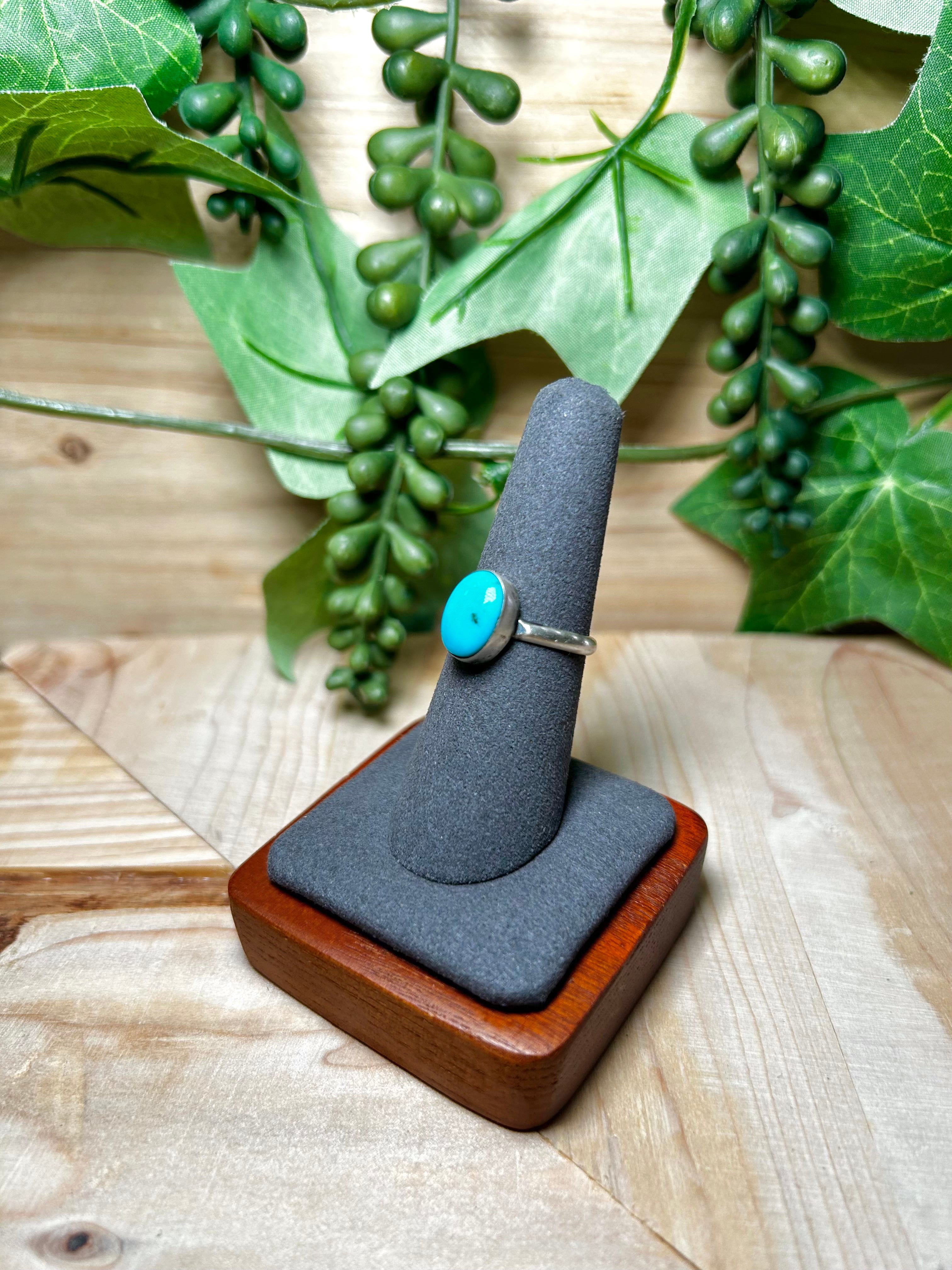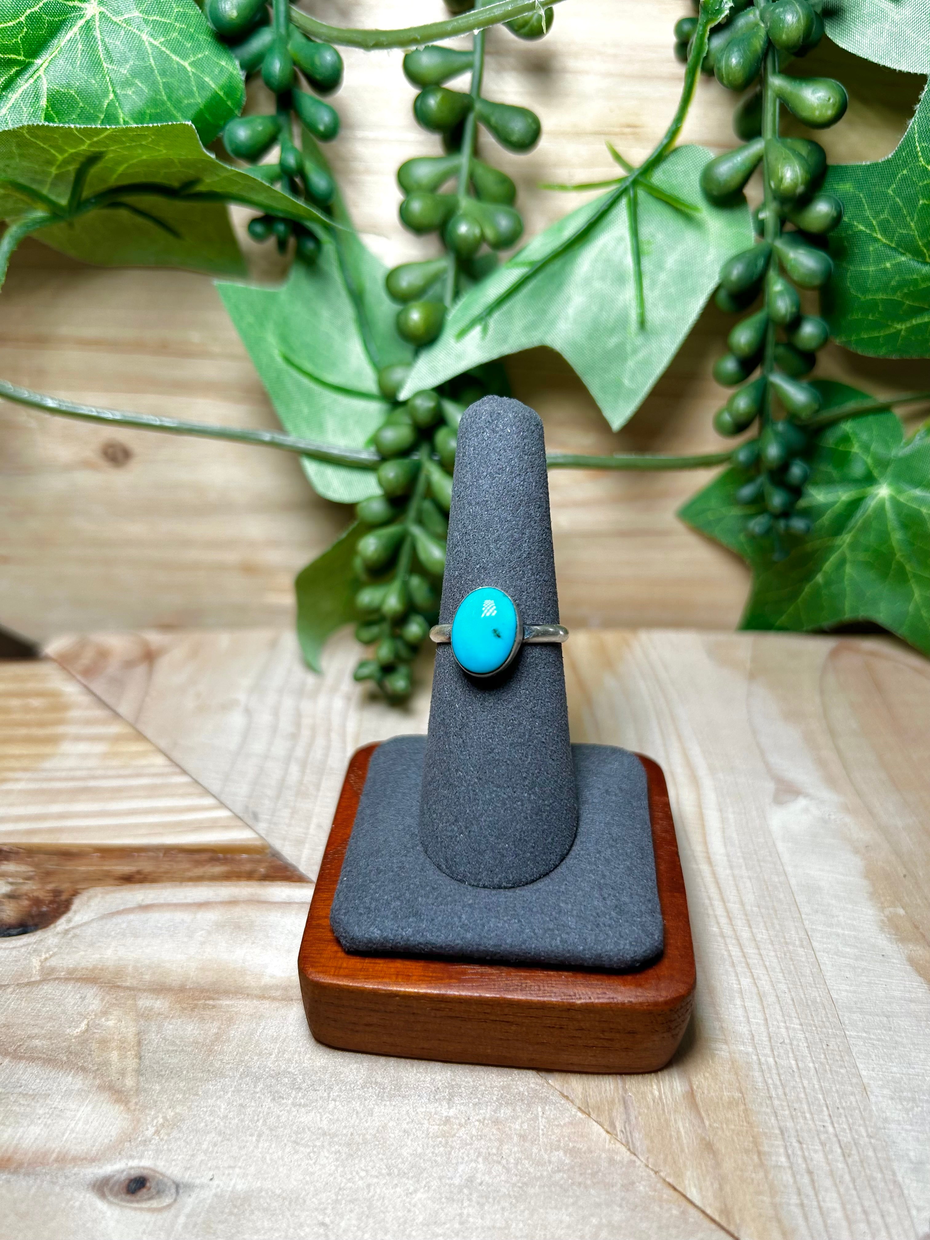Navajo Made Kingman Turquoise & Sterling Silver Ring Size 7. It measures 1/2 of an inch long and 3/8 of an inch wide. Signed by the artist and stamped sterling silver.