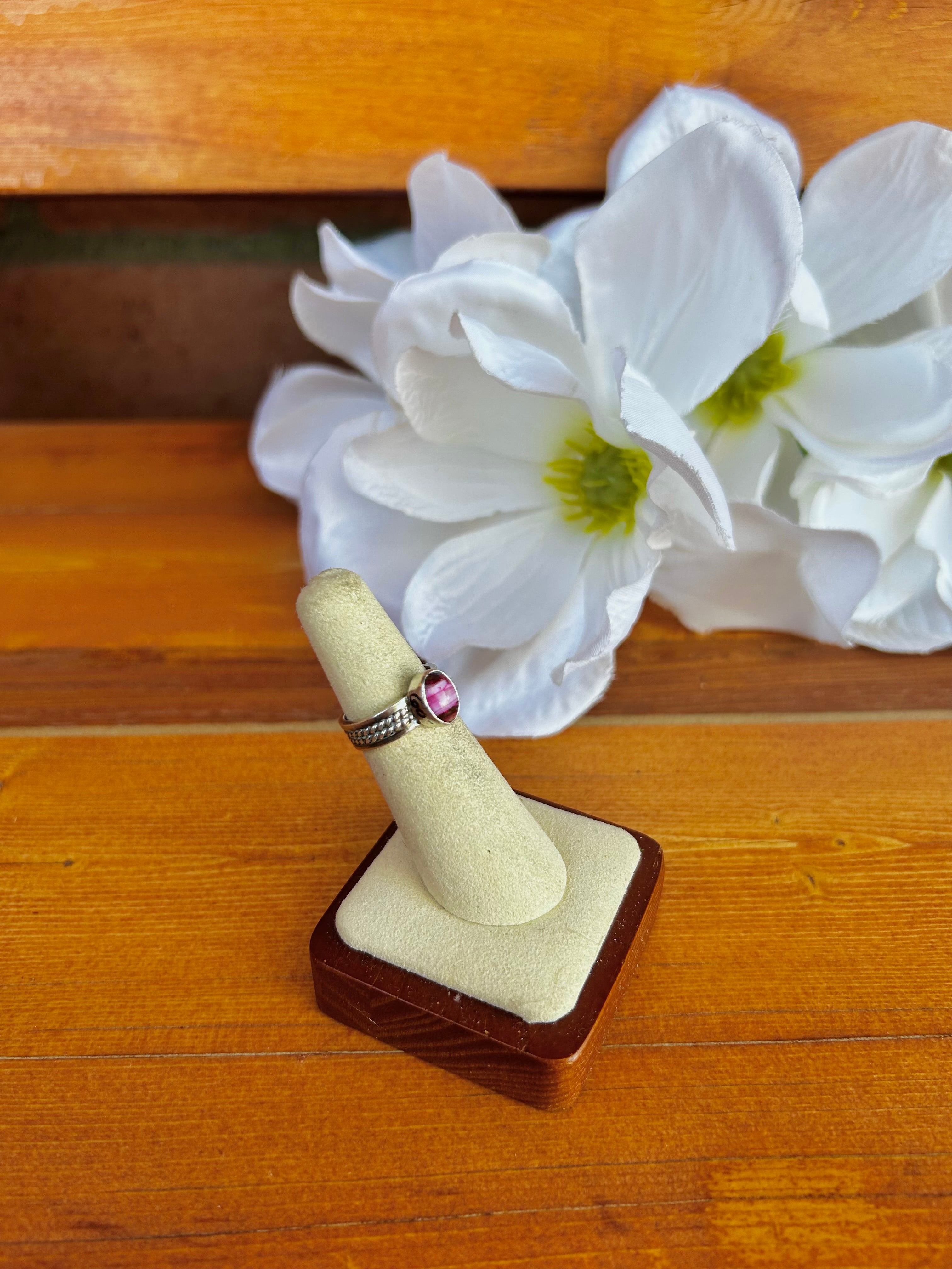 Navajo Made Pink Mohave & Sterling Silver Ring Size 5. It measures 1/4 of an inch long and 3/8 of an inch wide. Signed by the artist and stamped sterling silver.