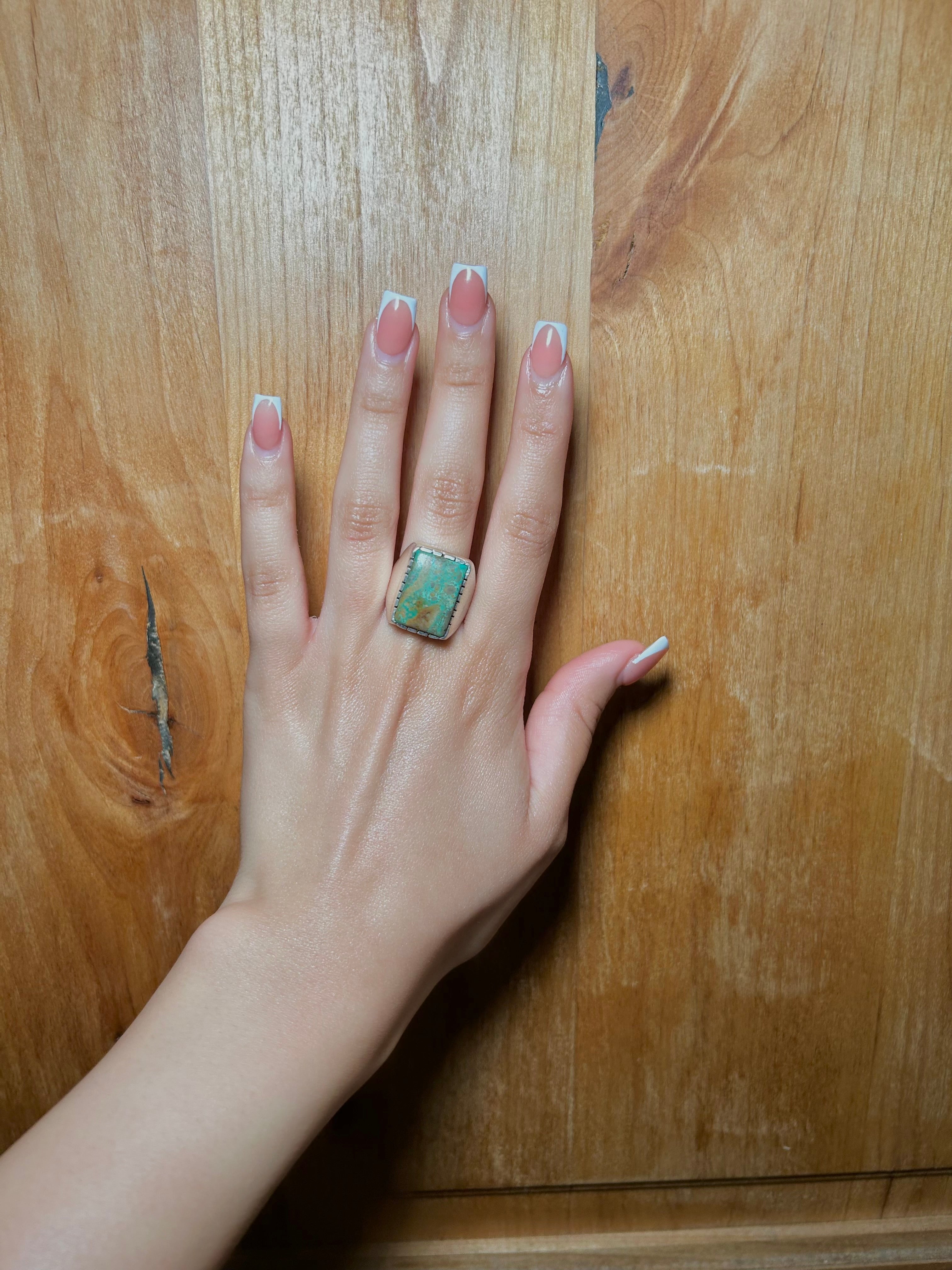 Navajo Made Kingman Turquoise & Sterling Silver Ring Size 6. It measures 7/8 of an inch long and 1/2 of an inch wide. Signed by the artist and stamped sterling silver.