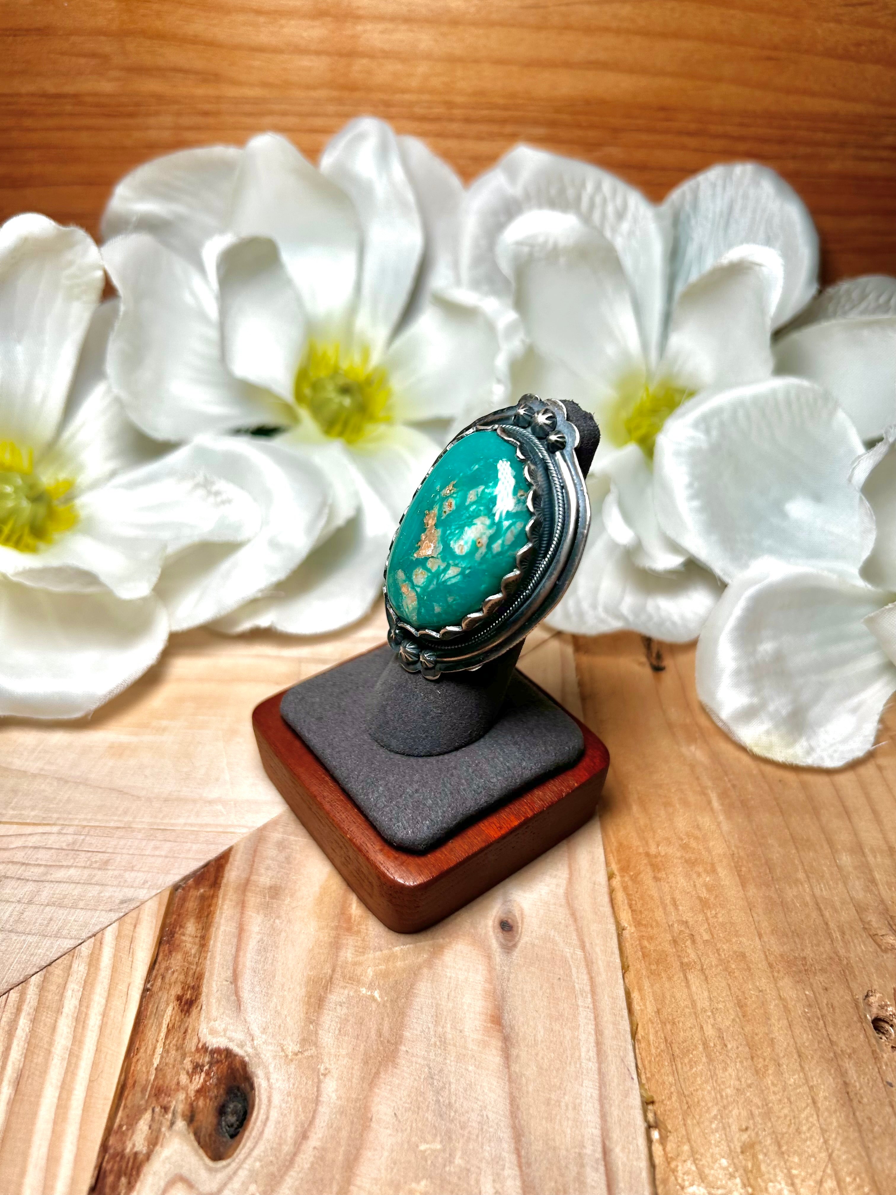 Scott Skeets Royston Turquoise & Sterling Silver Ring Size 6.5. It measures 2 inches long and 1 3/8 inches wide. Signed by the artist and stamped sterling silver.