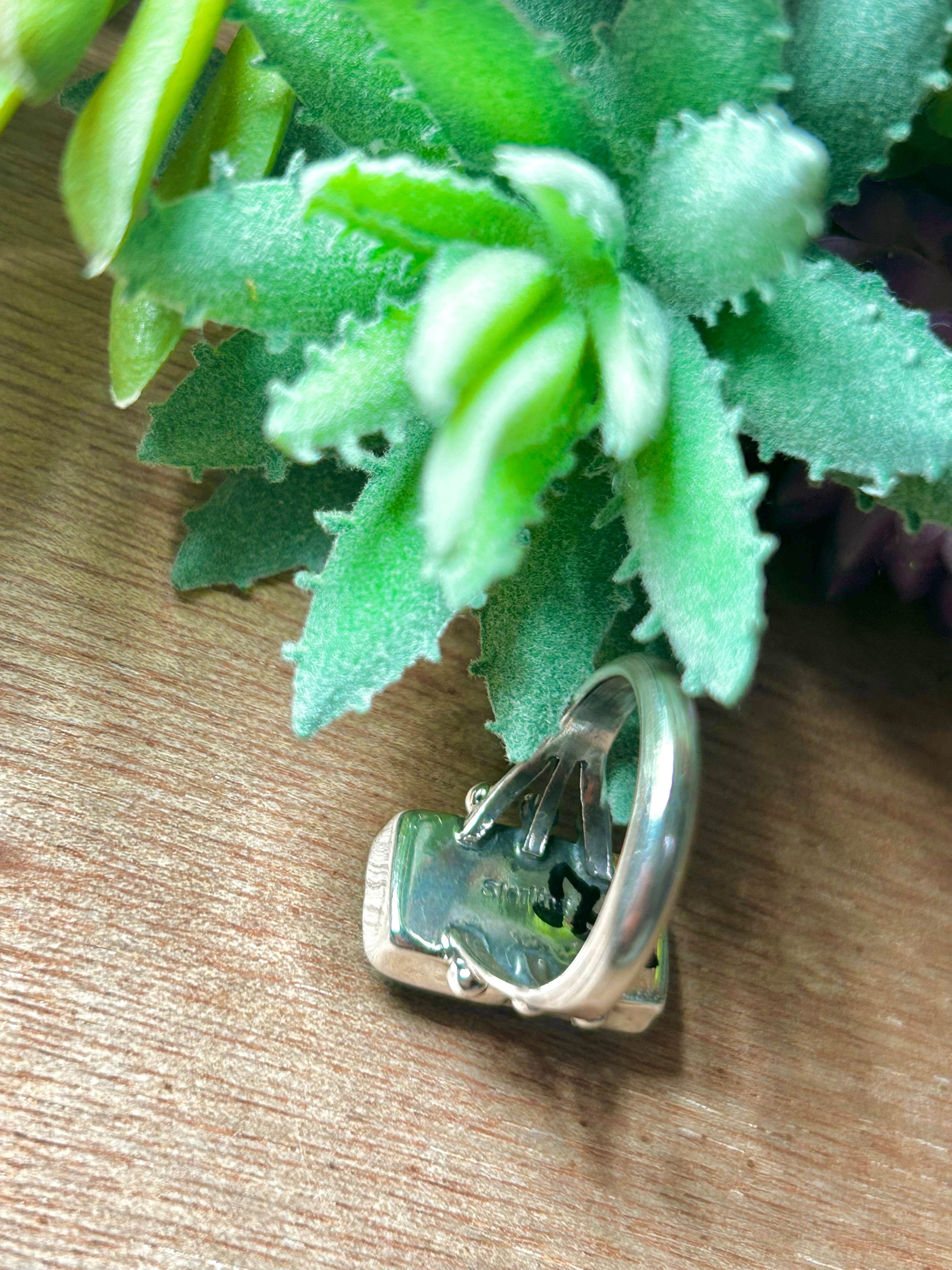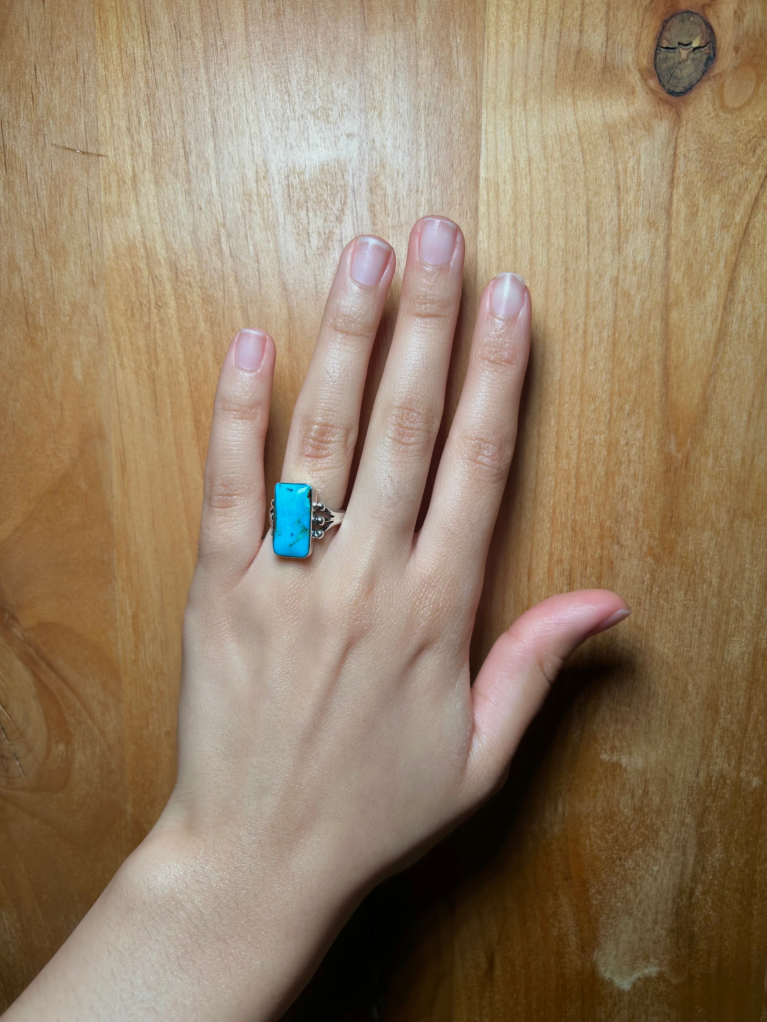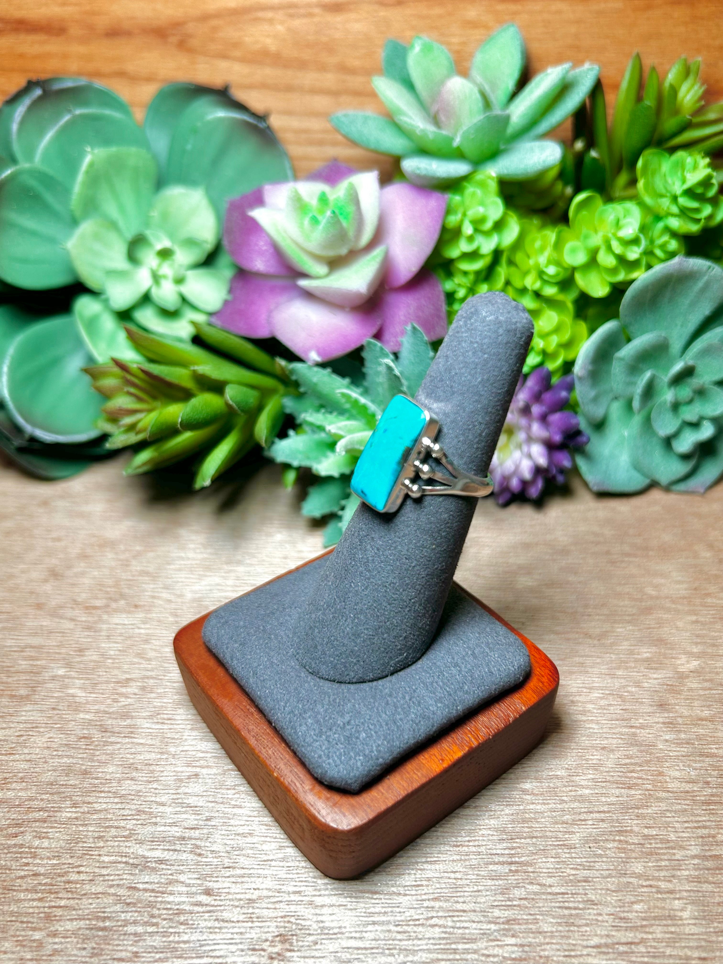 Navajo Made Kingman Turquoise & Sterling Silver Ring Size 5.75. It measures 3/4 of an inch long and 1/2 of an inch wide. Signed by the artist and stamped sterling silver.