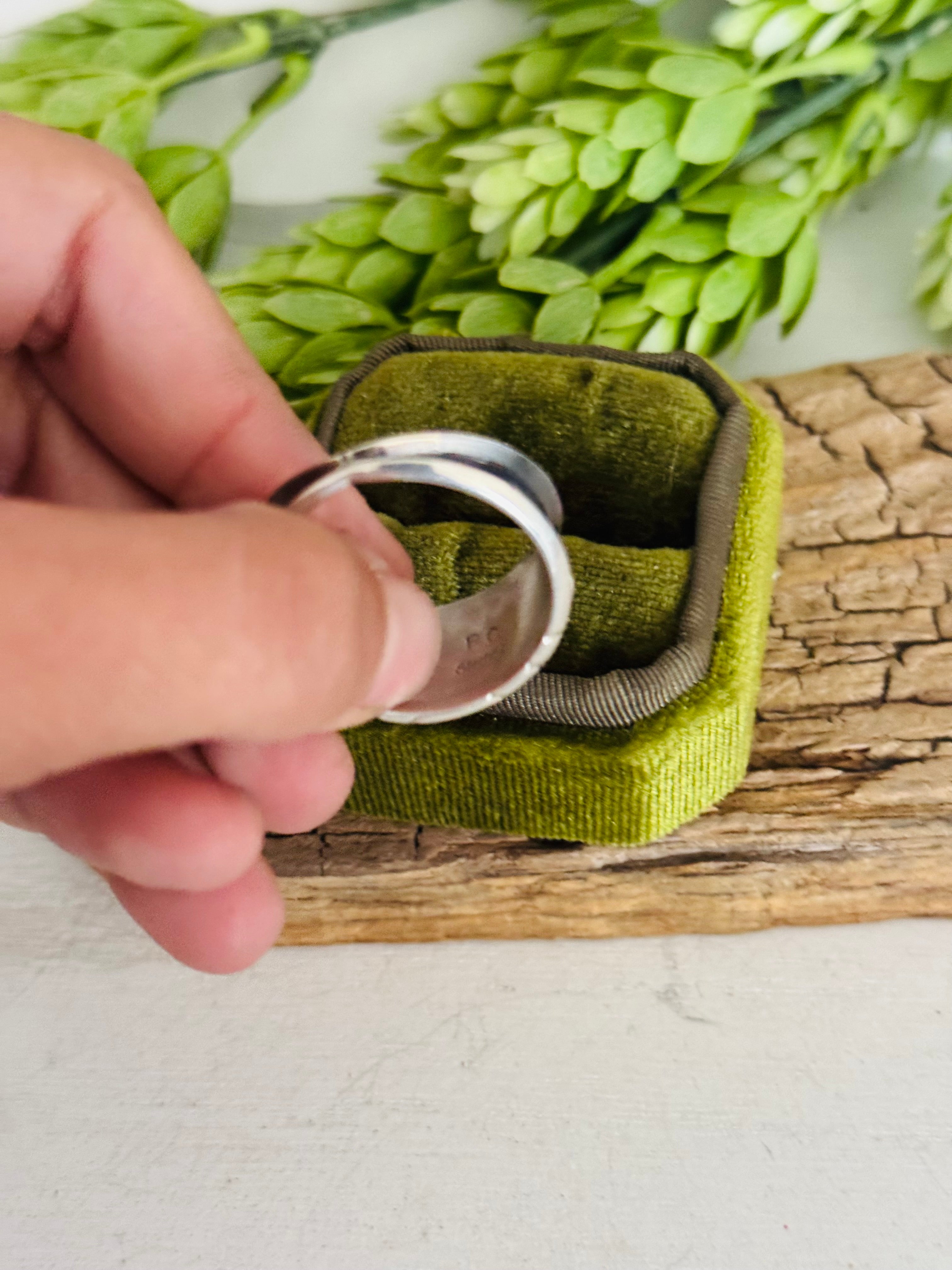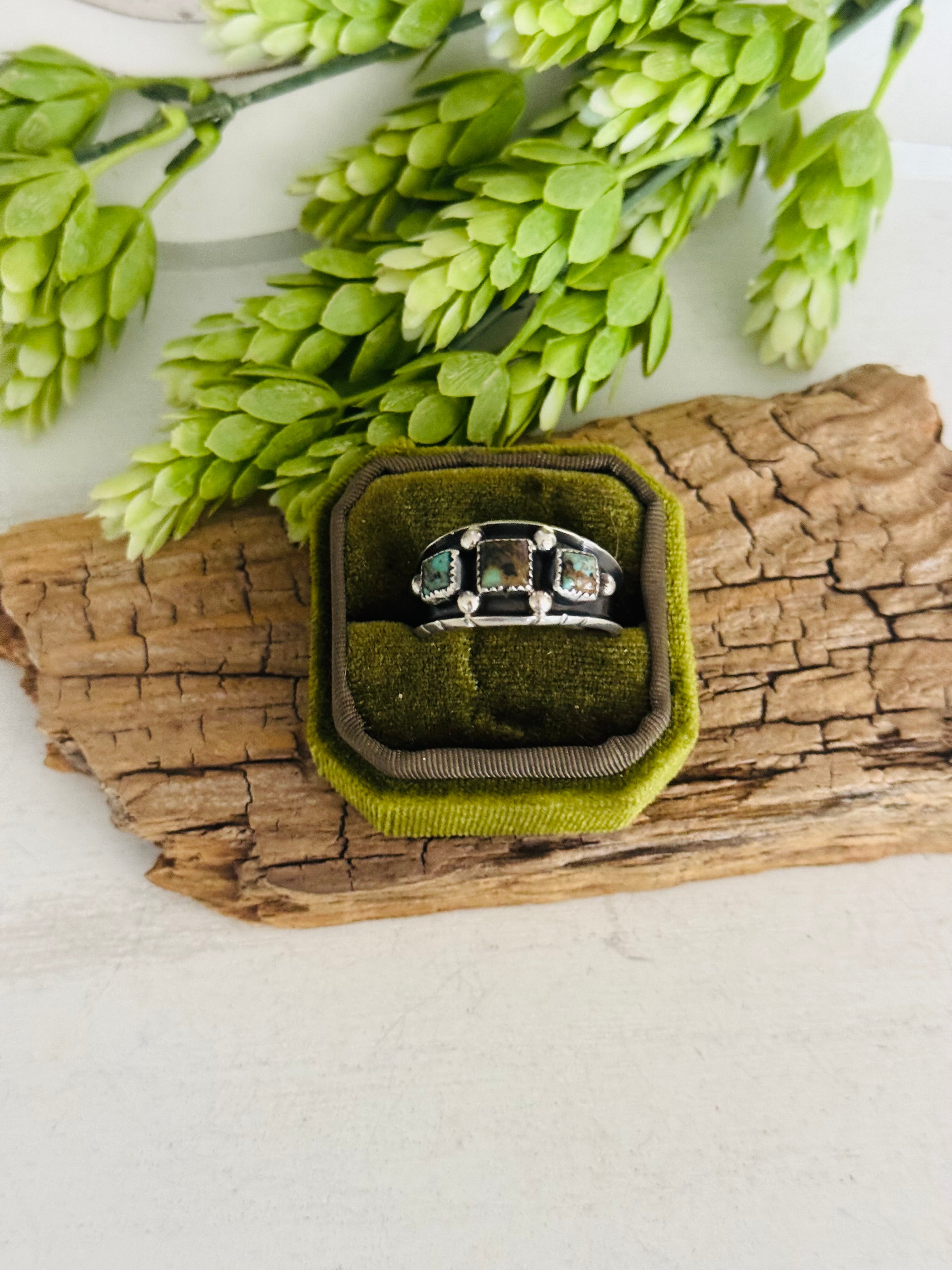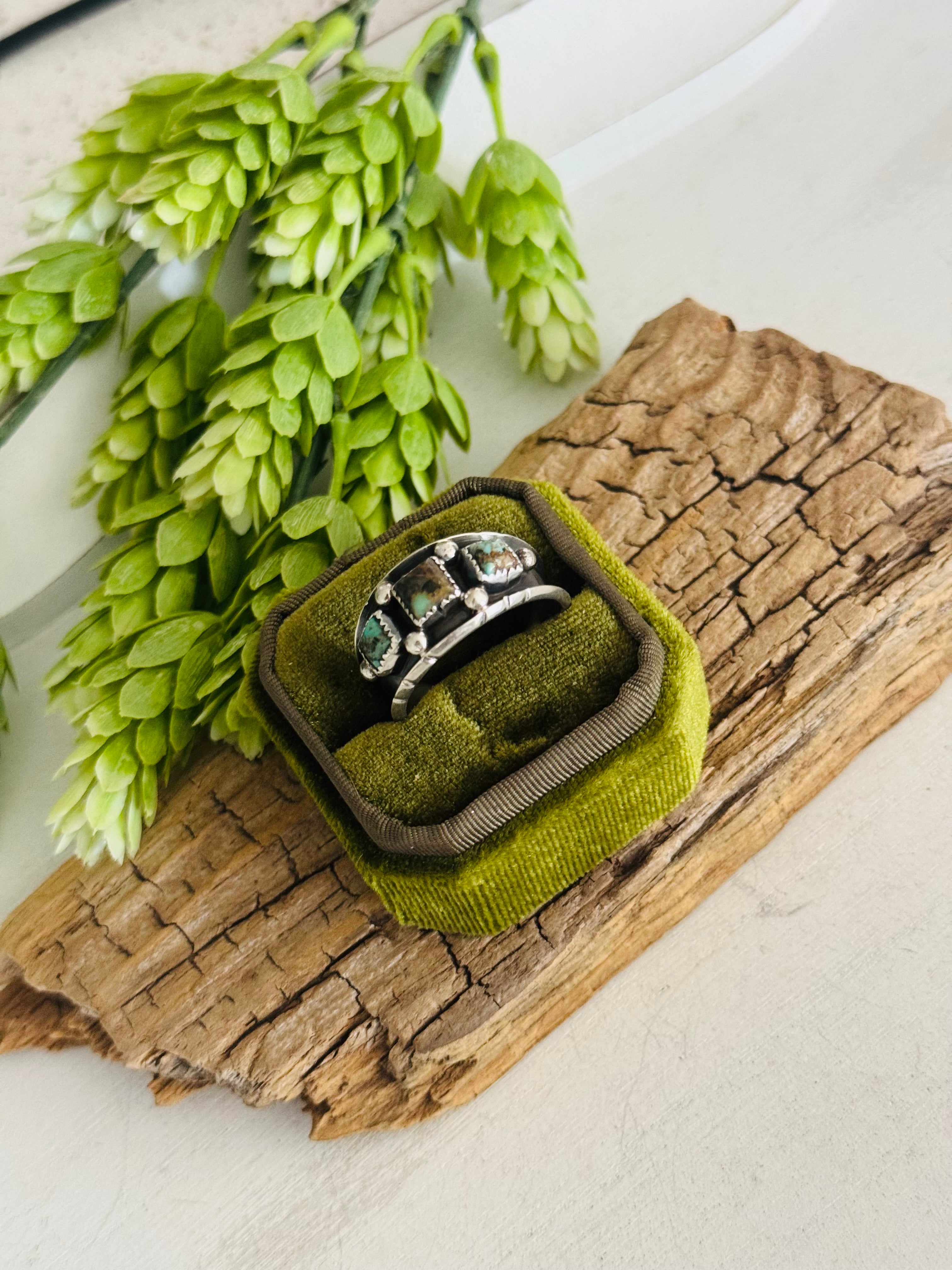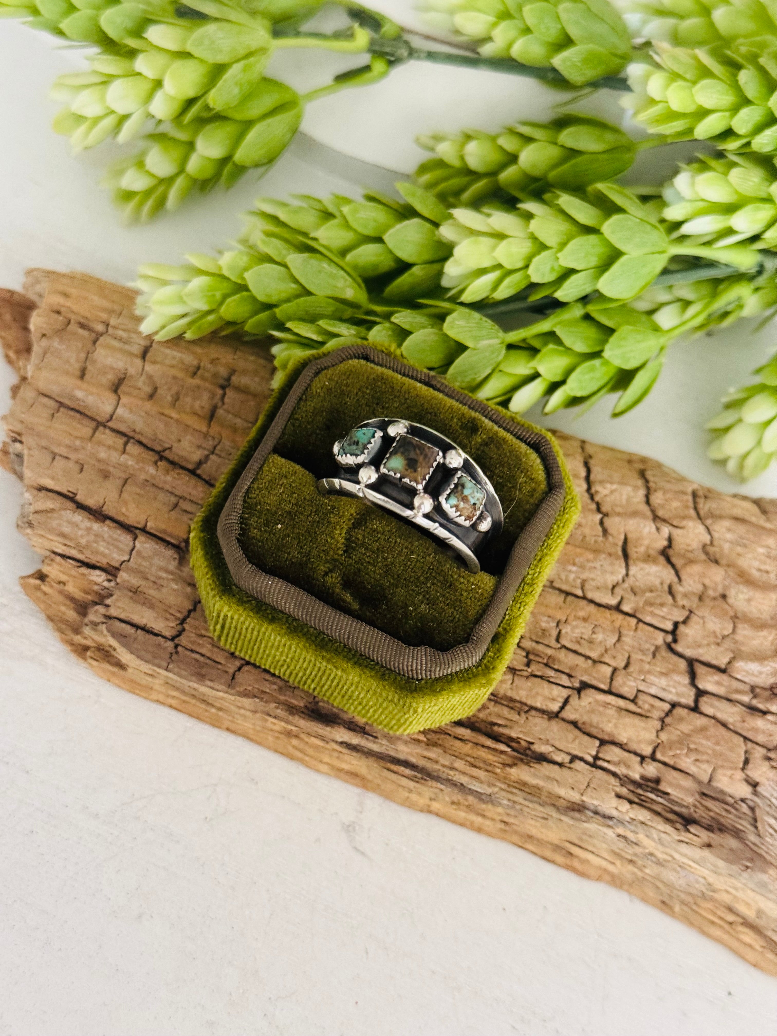 Navajo Made Kingman Turquoise & Sterling Silver Ring. It measures 1/2 of an inch long. Signed by the artist and stamped sterling silver. Stones will differ due to natural stones.