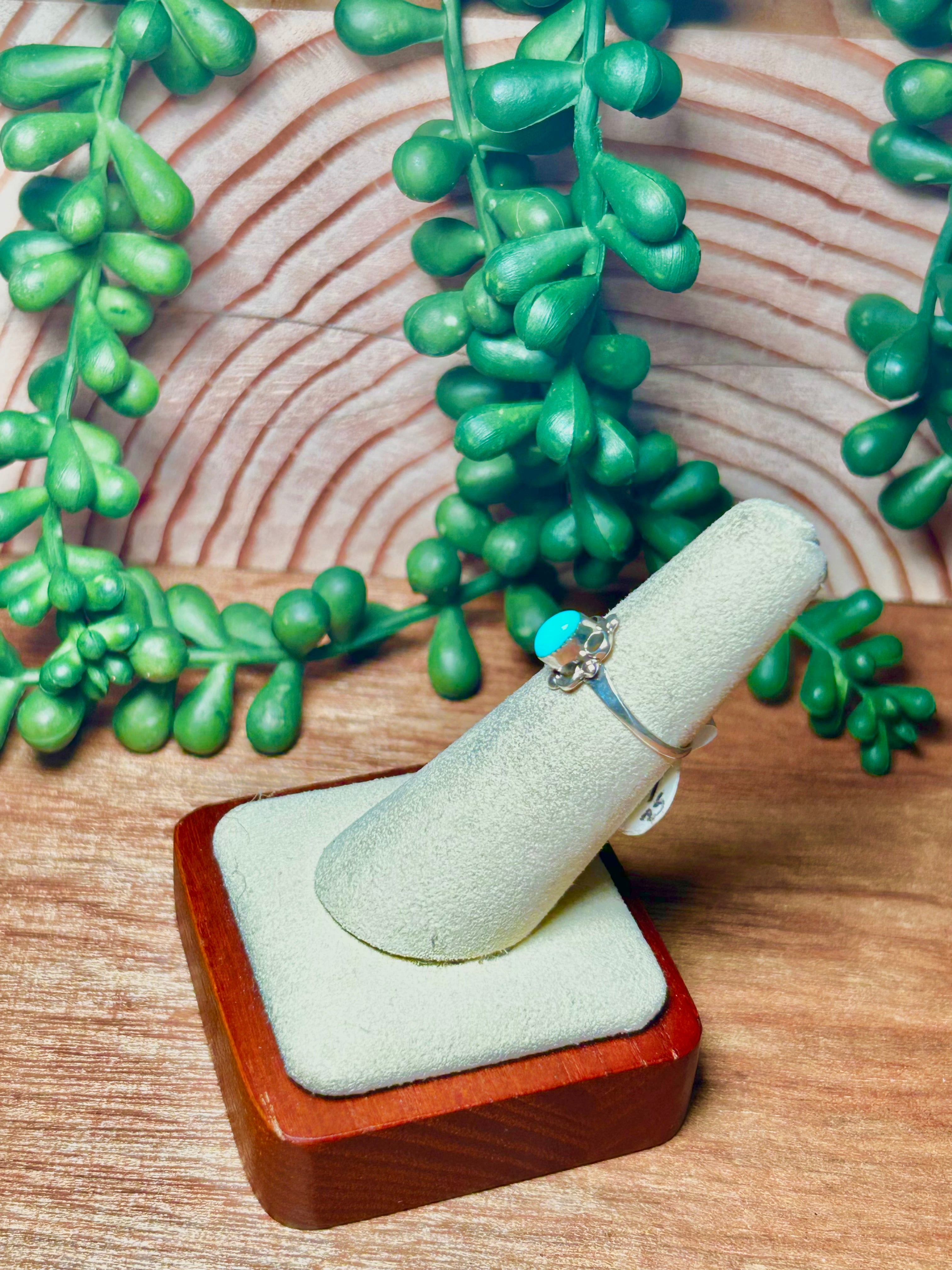 Navajo Made Kingman Turquoise & Sterling Silver Ring Size 5.5. It measures 1/2 of an inch long and just over 1/4 of an inch wide. Signed by the artist and stamped sterling silver.