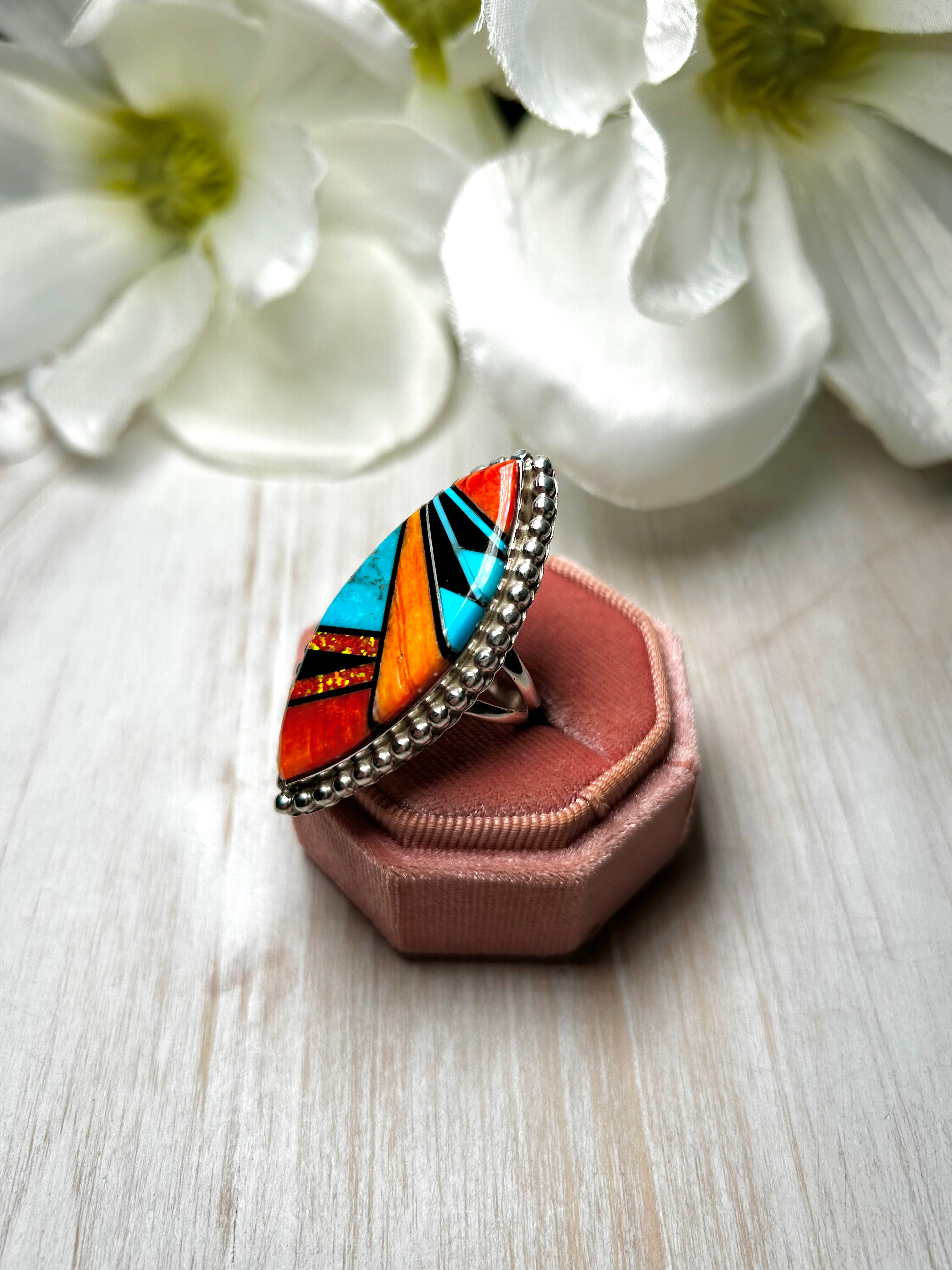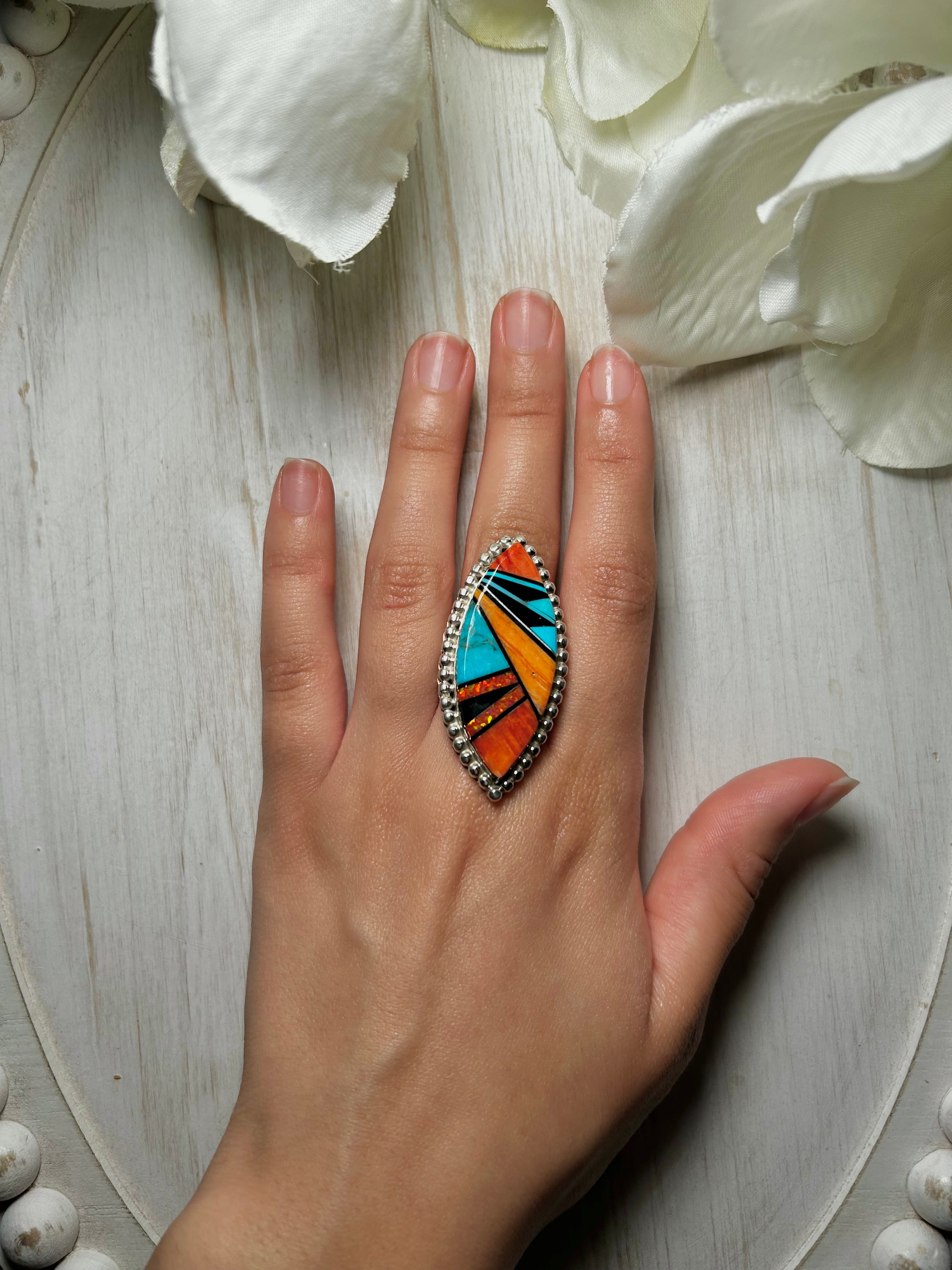 Navajo Made Multi Stone & Sterling Silver Ring Size 9.5. It measures 2 inches long and 7/8 of an inch wide. Signed by the artist and stamped sterling silver.