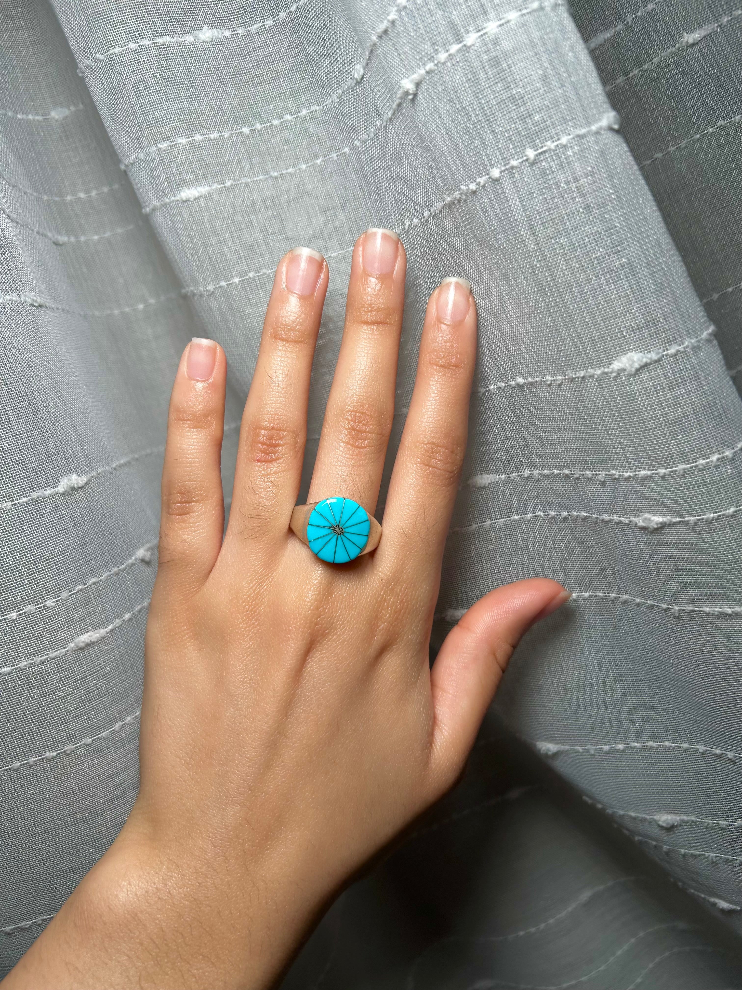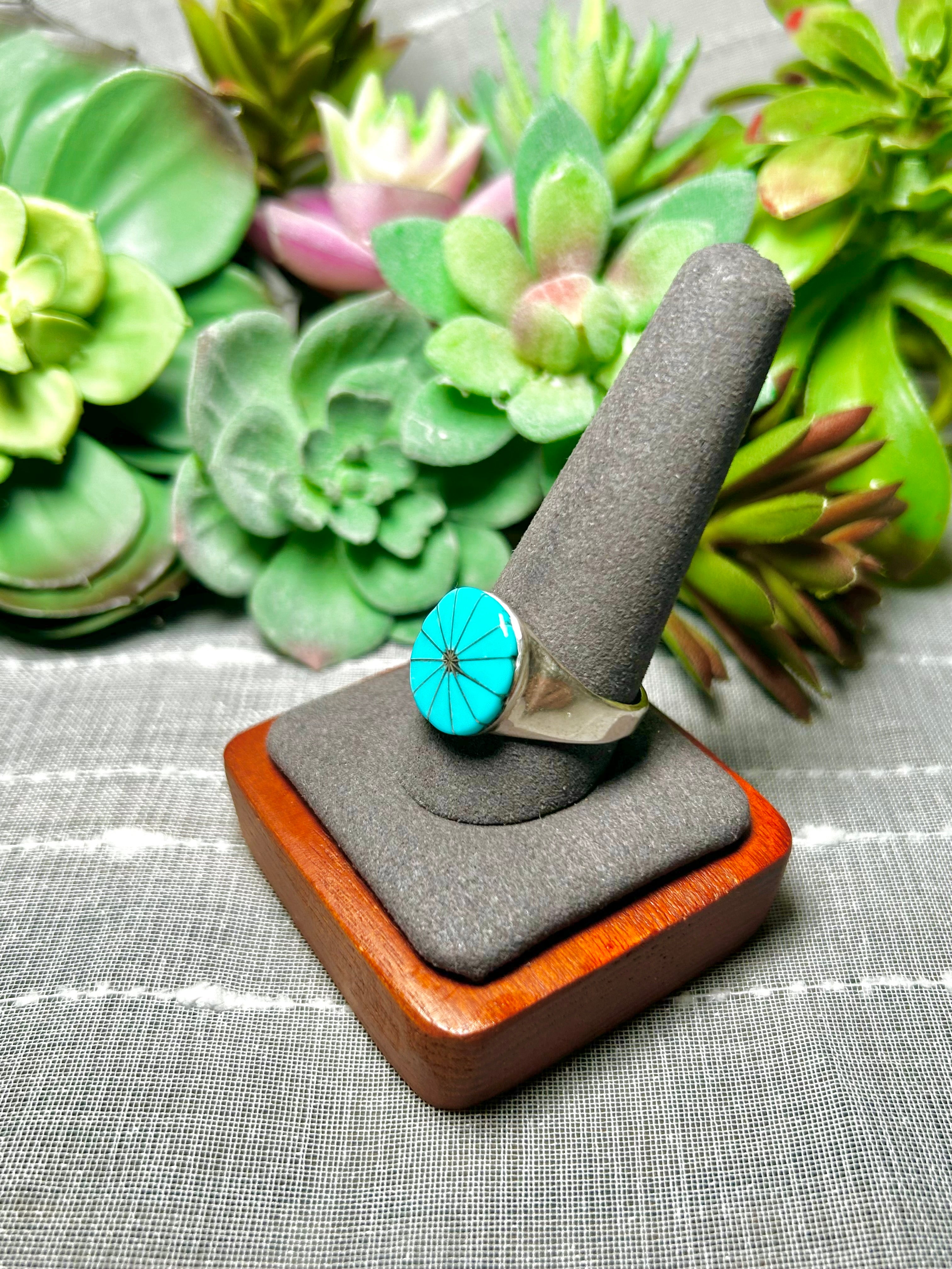Navajo Made Kingman Turquoise & Sterling Silver Ring Size 11.25. It measures 5/8 of an inch long and 5/8 of an inch wide. Signed by the artist and stamped sterling silver.