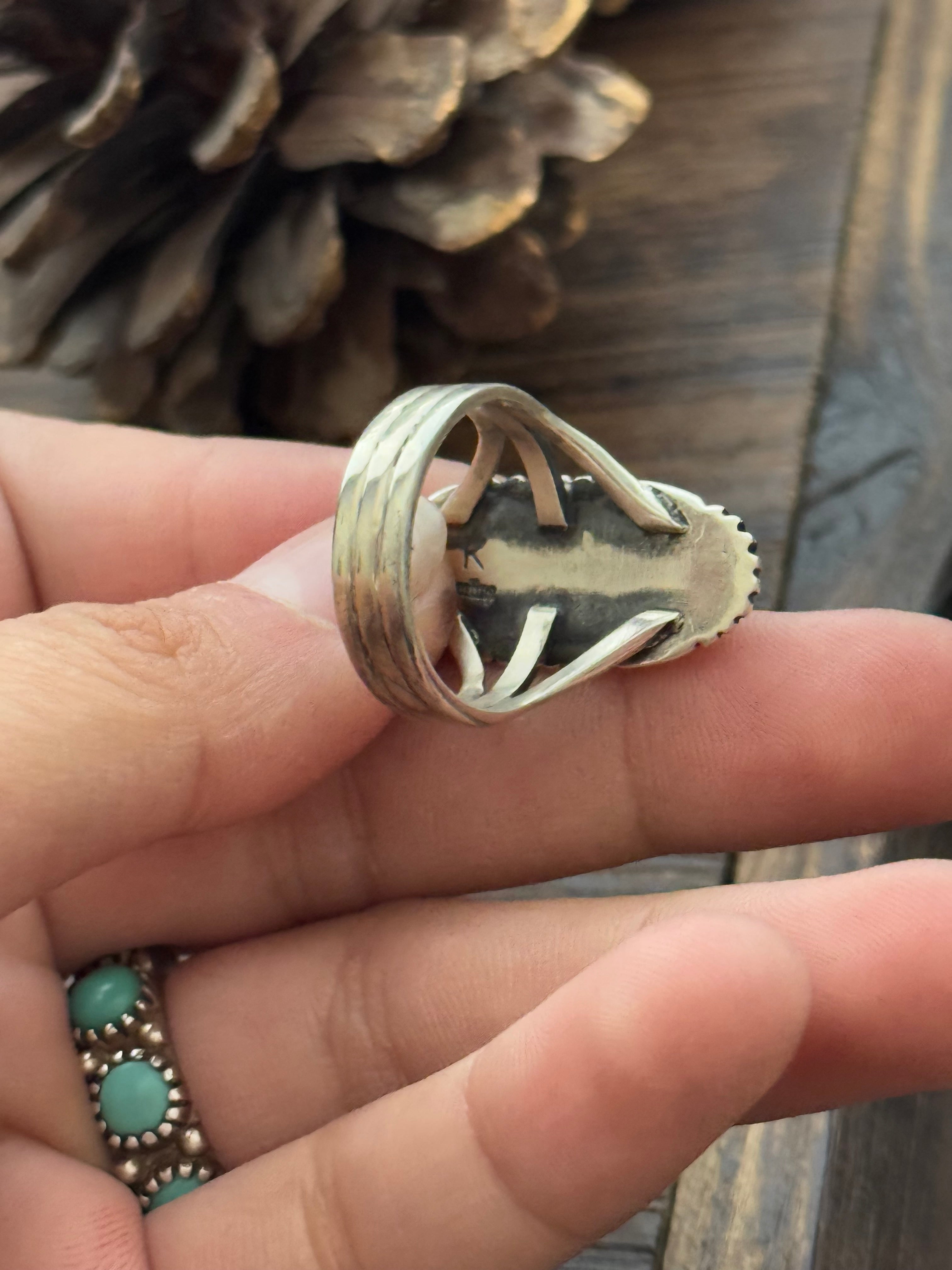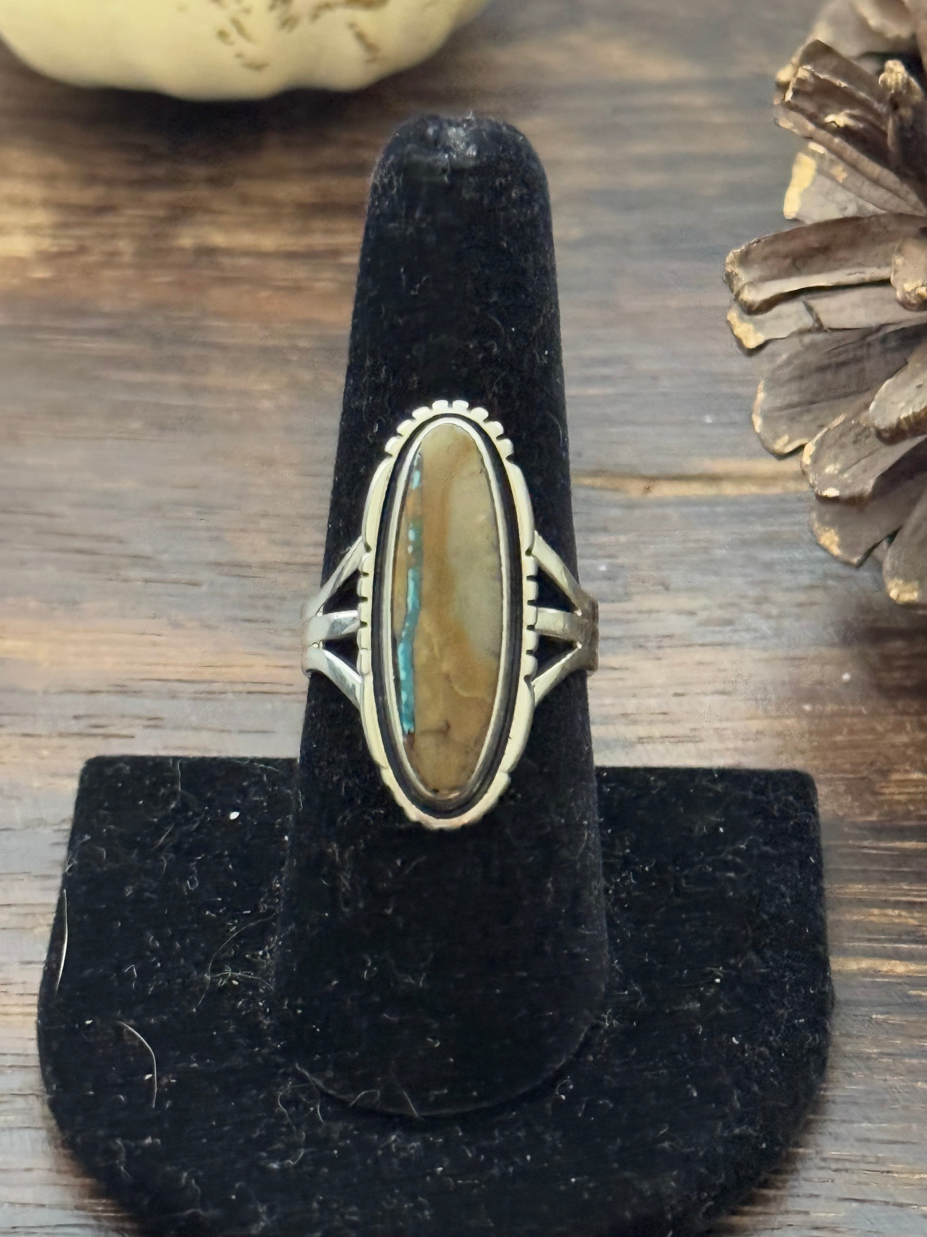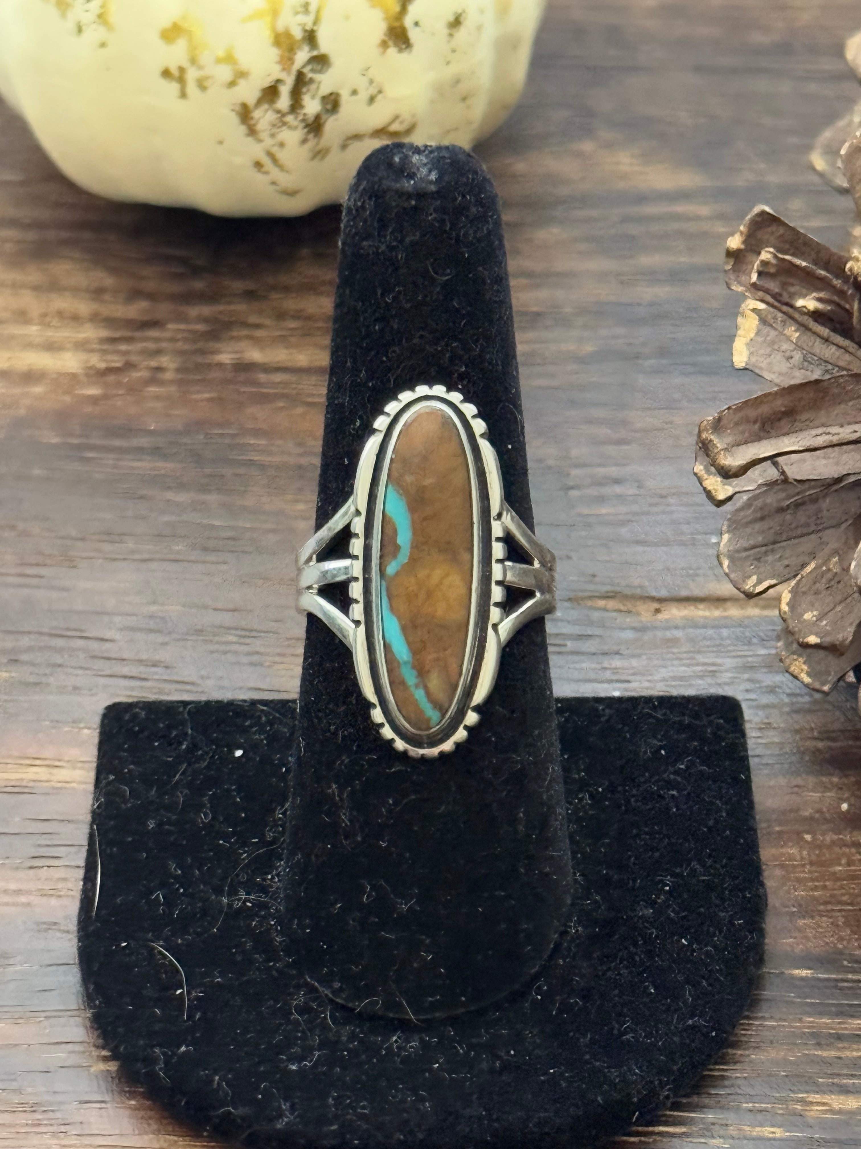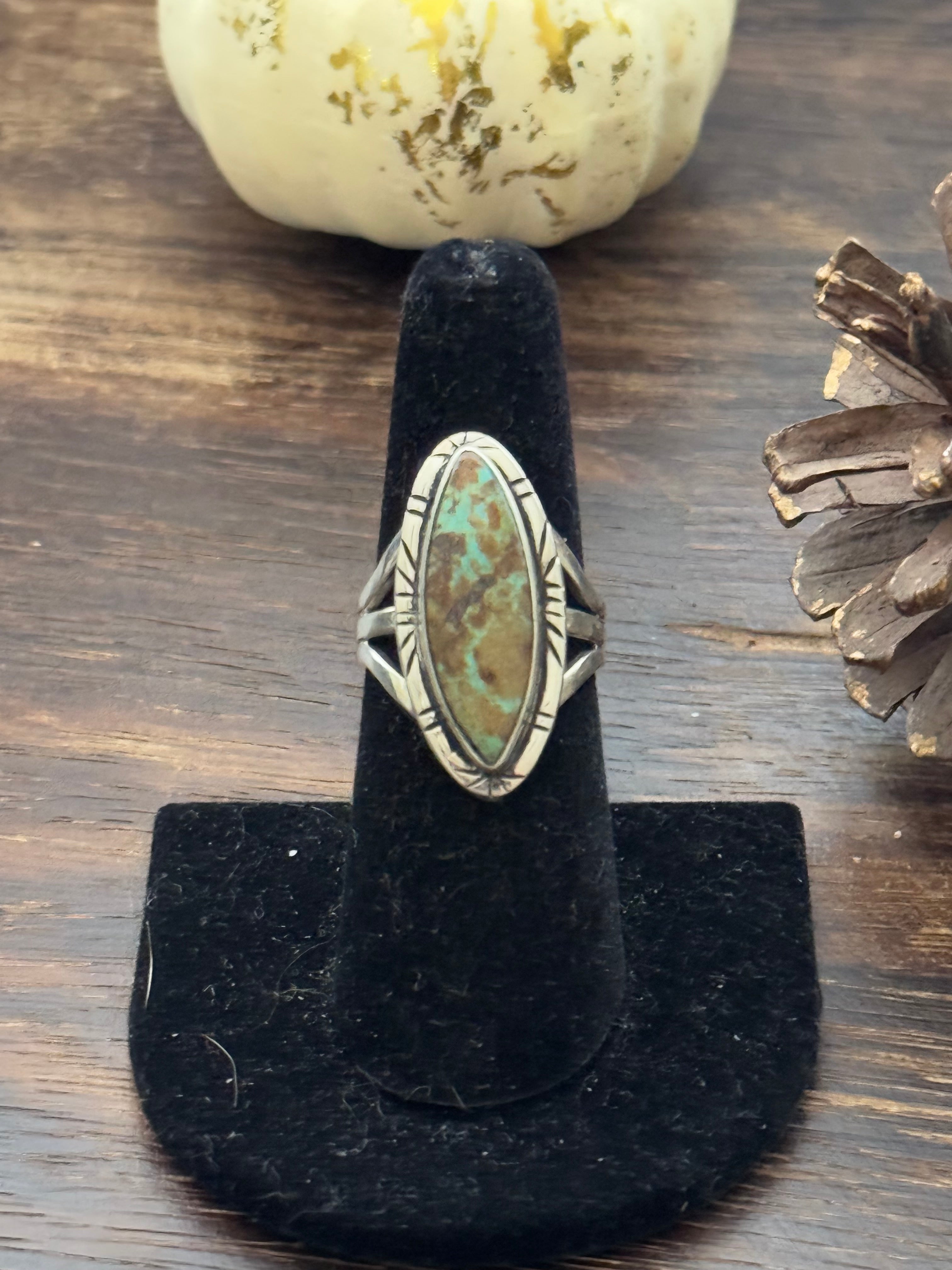 Beautiful ring. Navajo Made Turquoise & Sterling Silver Ring. It measures 1 1/4 inches long. Stamped sterling silver.