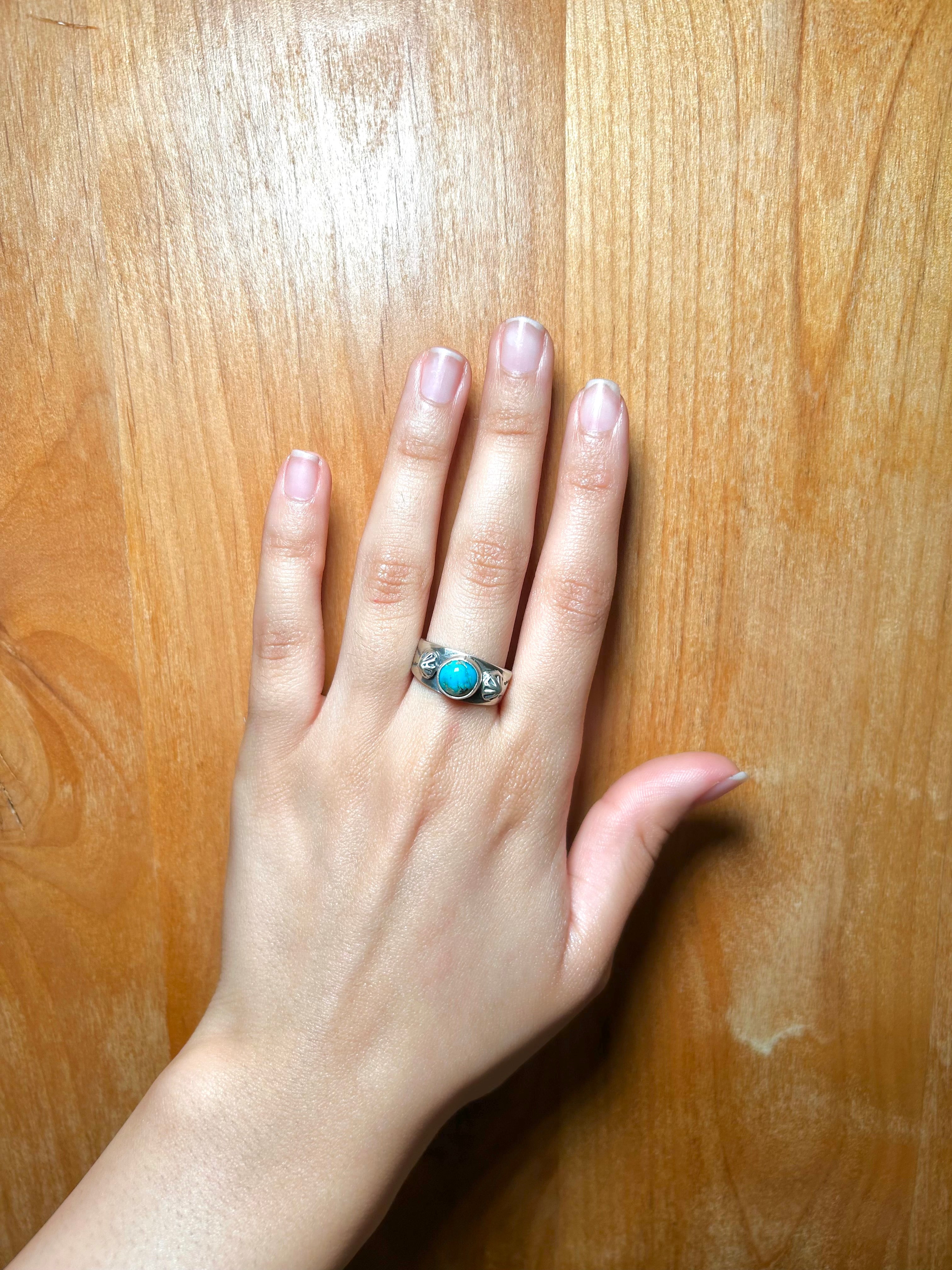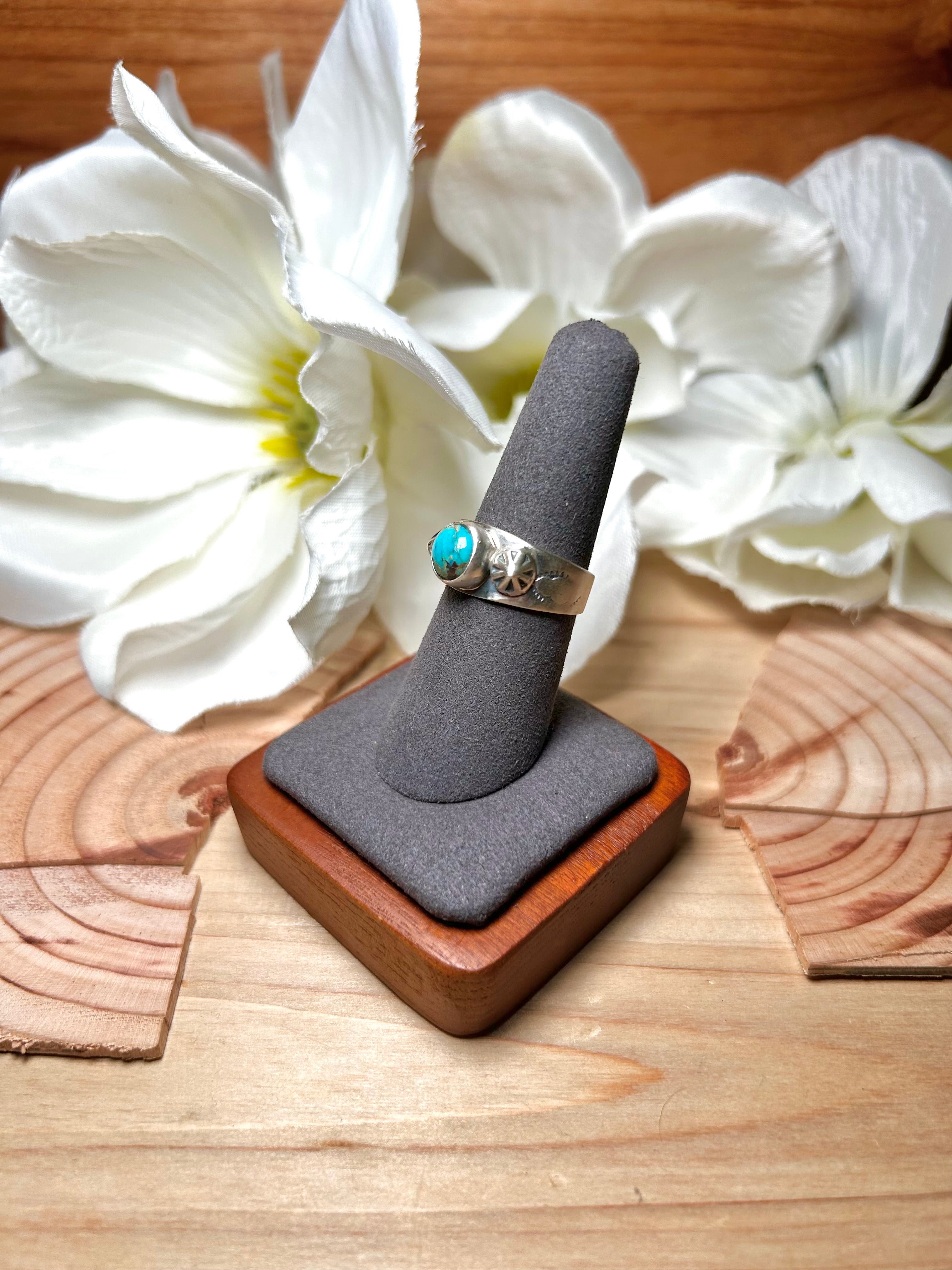 Navajo Made Kingman Turquoise & Sterling Silver Ring. It measures 3/8 of an inch long and 3/4 of an inch wide. Signed by the artist and stamped sterling silver. Stones will vary due to natural stone.