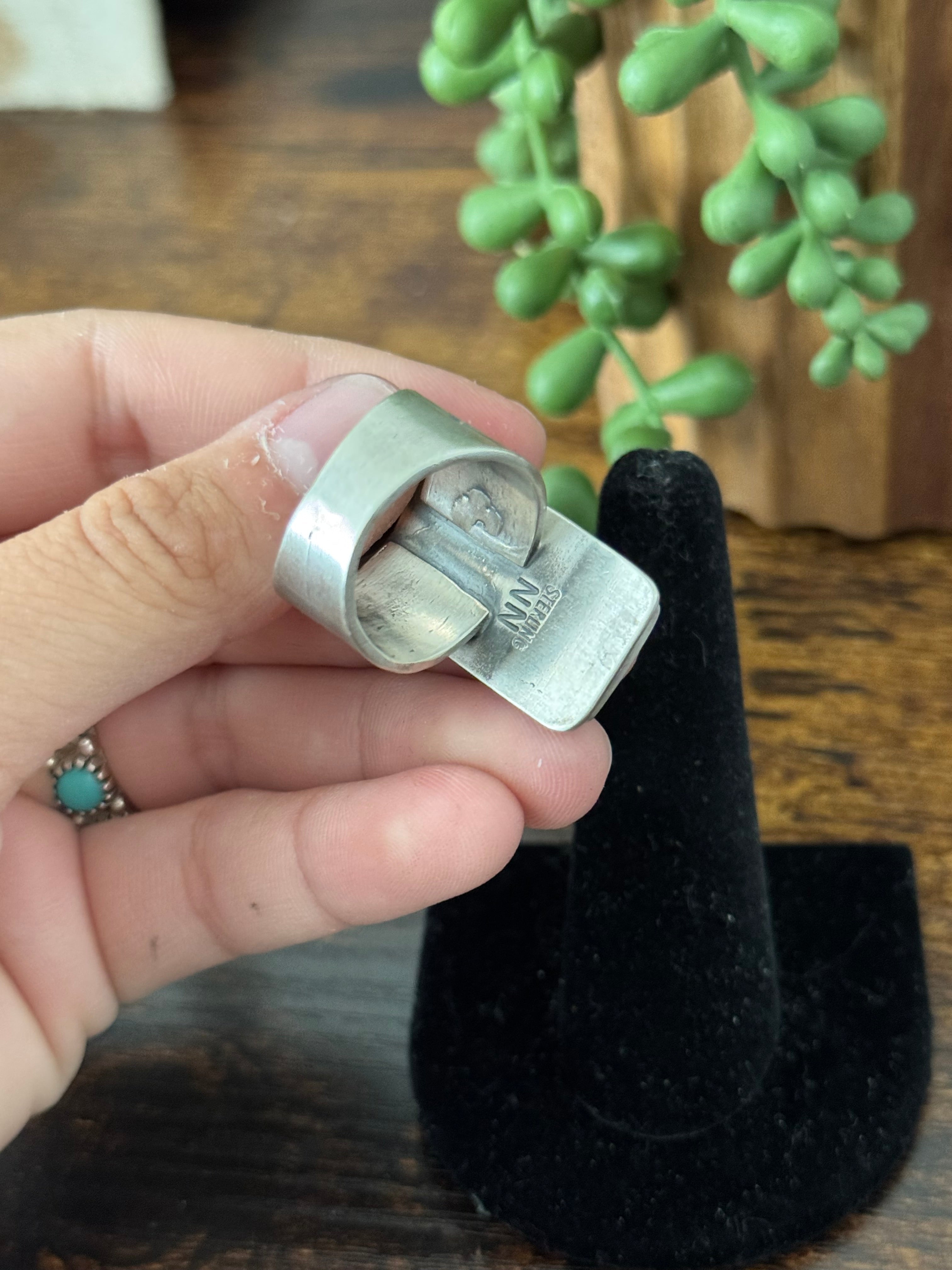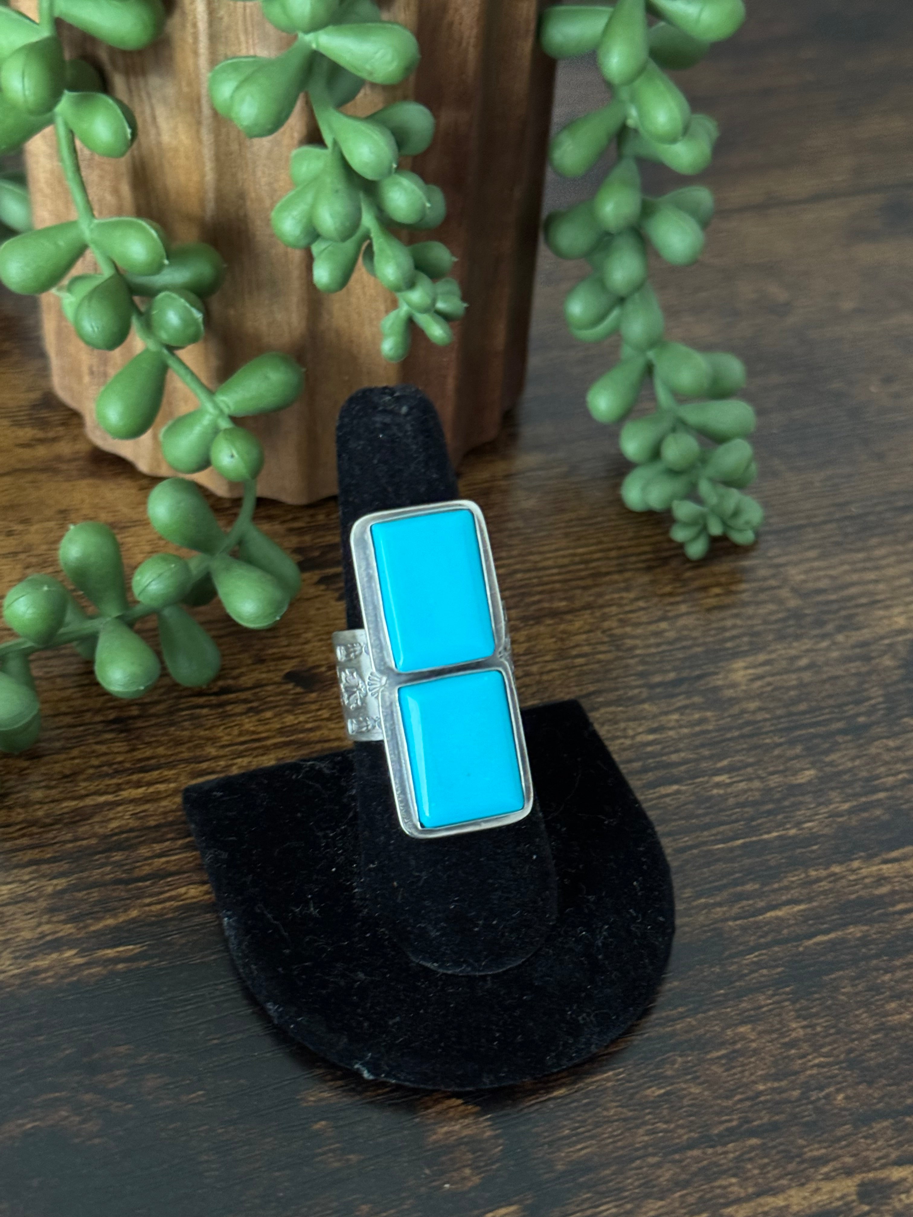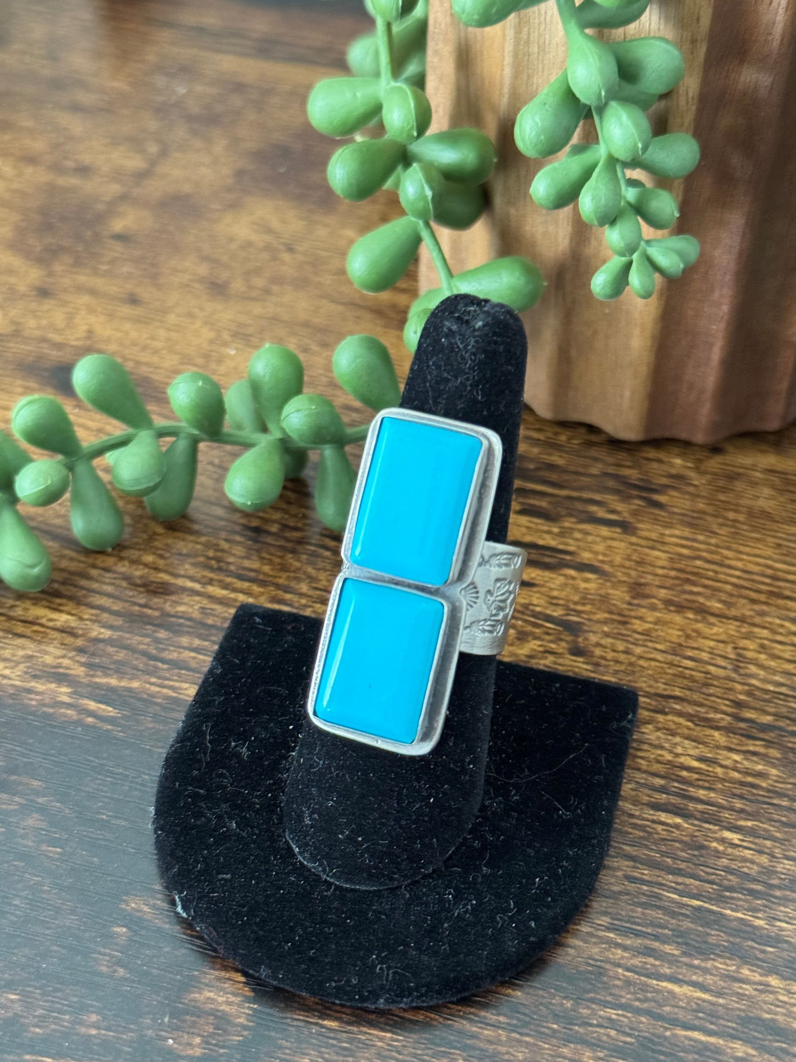 Beautiful ring. Ned Nez Kingman Turquoise & Sterling Silver Ring. It measures 1 1/2 inches long and 5/8 of an inch wide. Stamped sterling silver and signed.