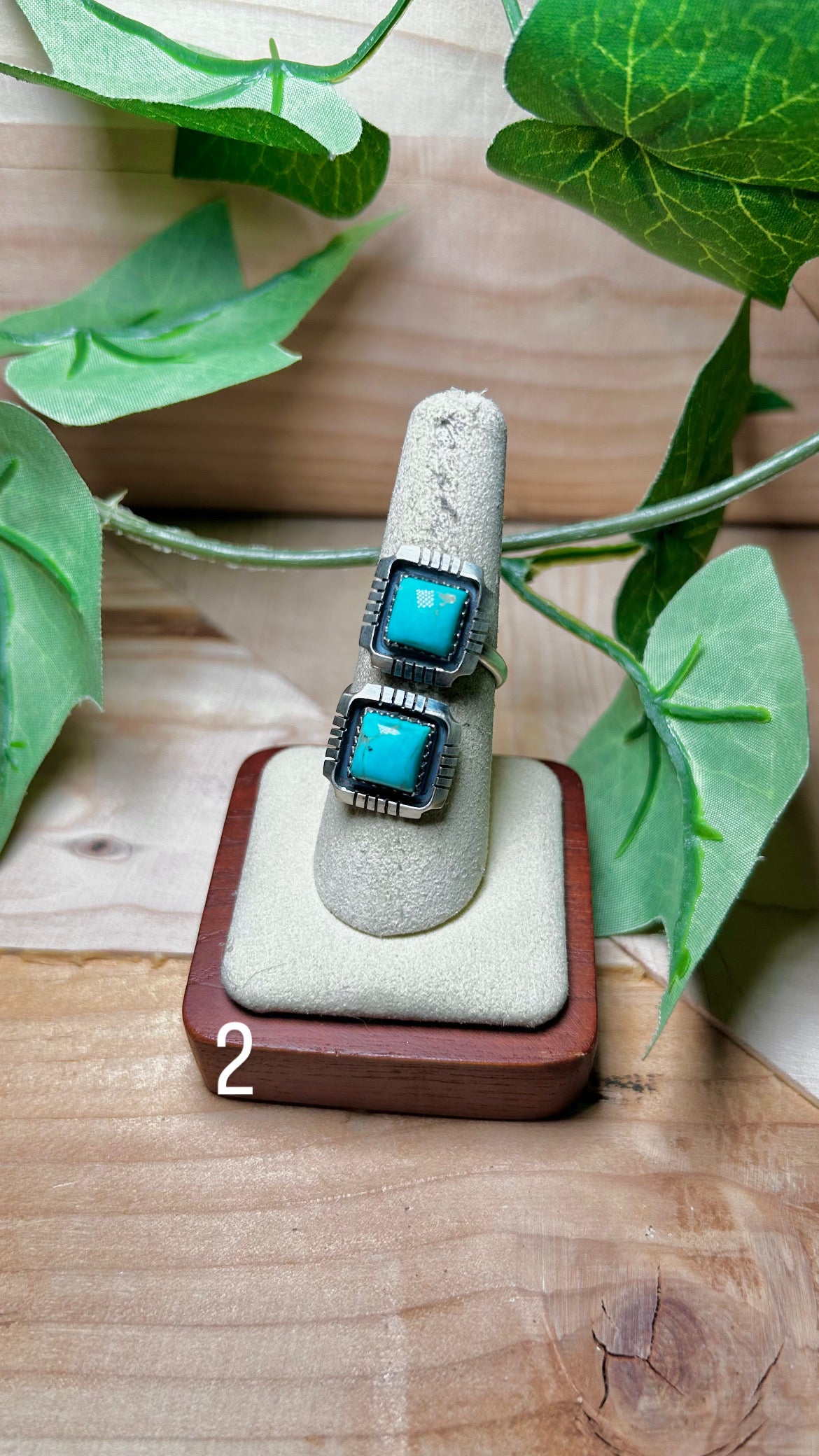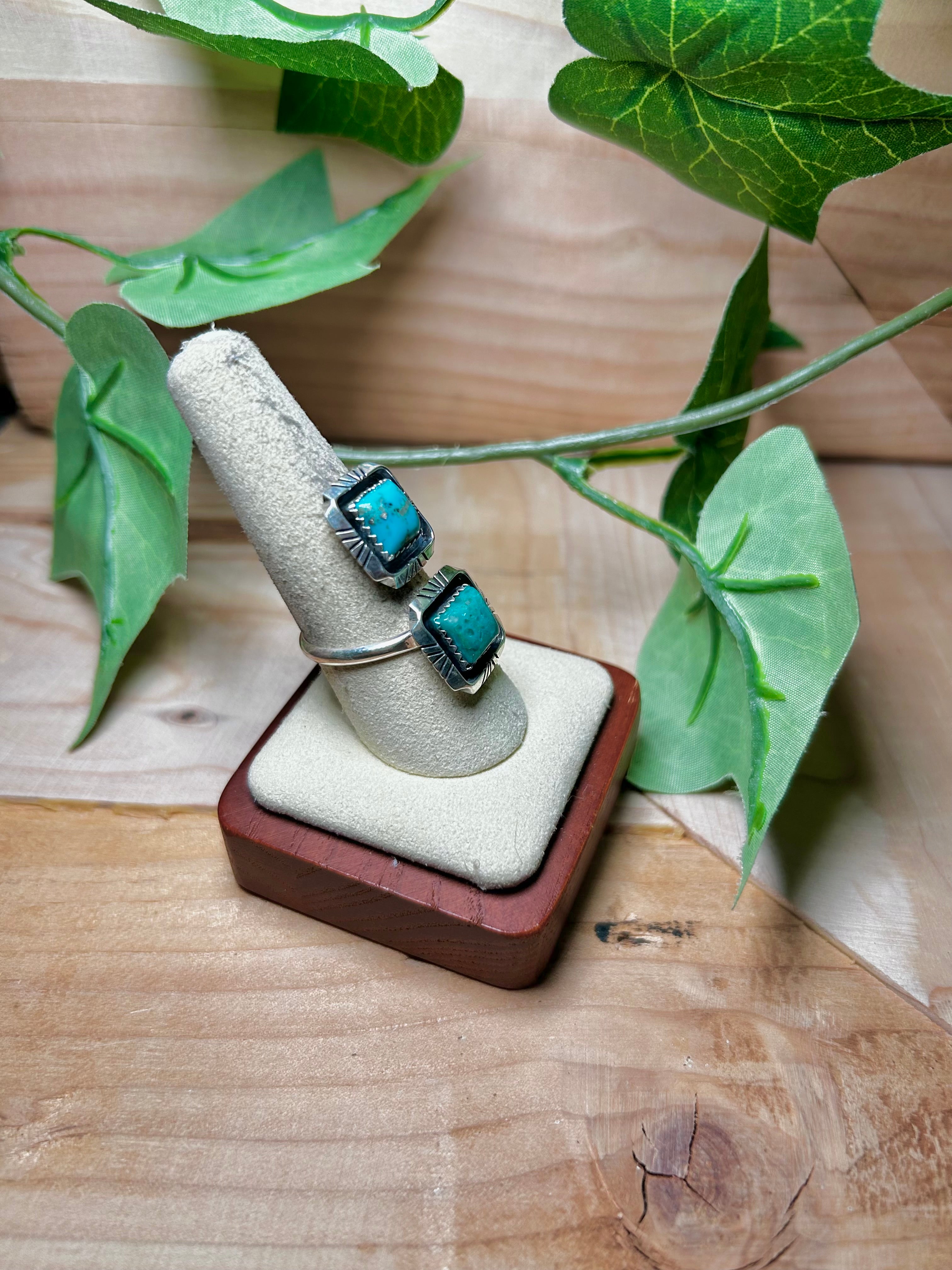 Eugene Belone Kingman Turquoise & Sterling Sliver Cluster Adjustable Ring. It measures 1 1/4 inches long and 5/8 of an inch wide. Signed by the artist and stamped sterling silver.