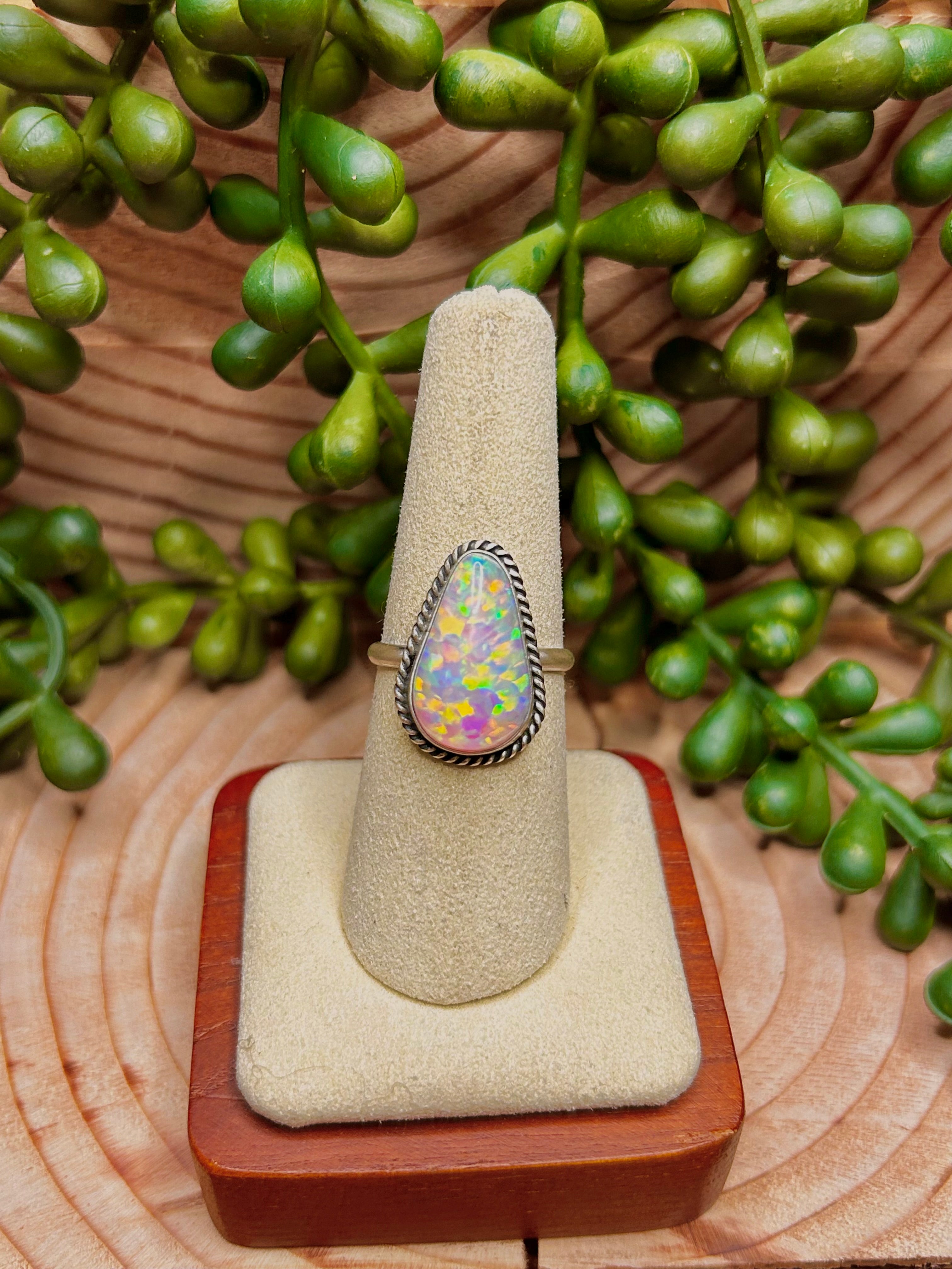 Navajo Man-Made Opal & Sterling Sliver Ring Size 8.75. It measures 1 inch long 1/2 of an inch wide and Signed by the artist and stamped sterling silver.