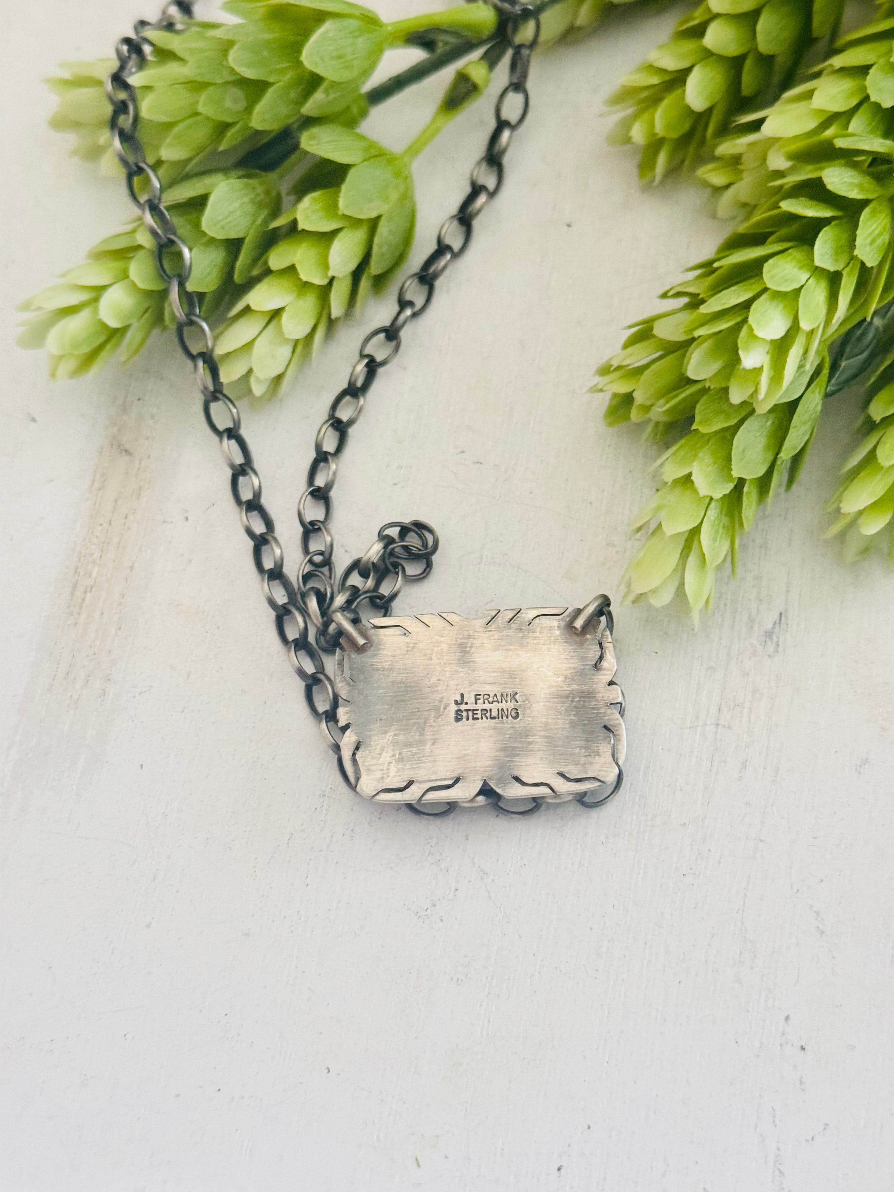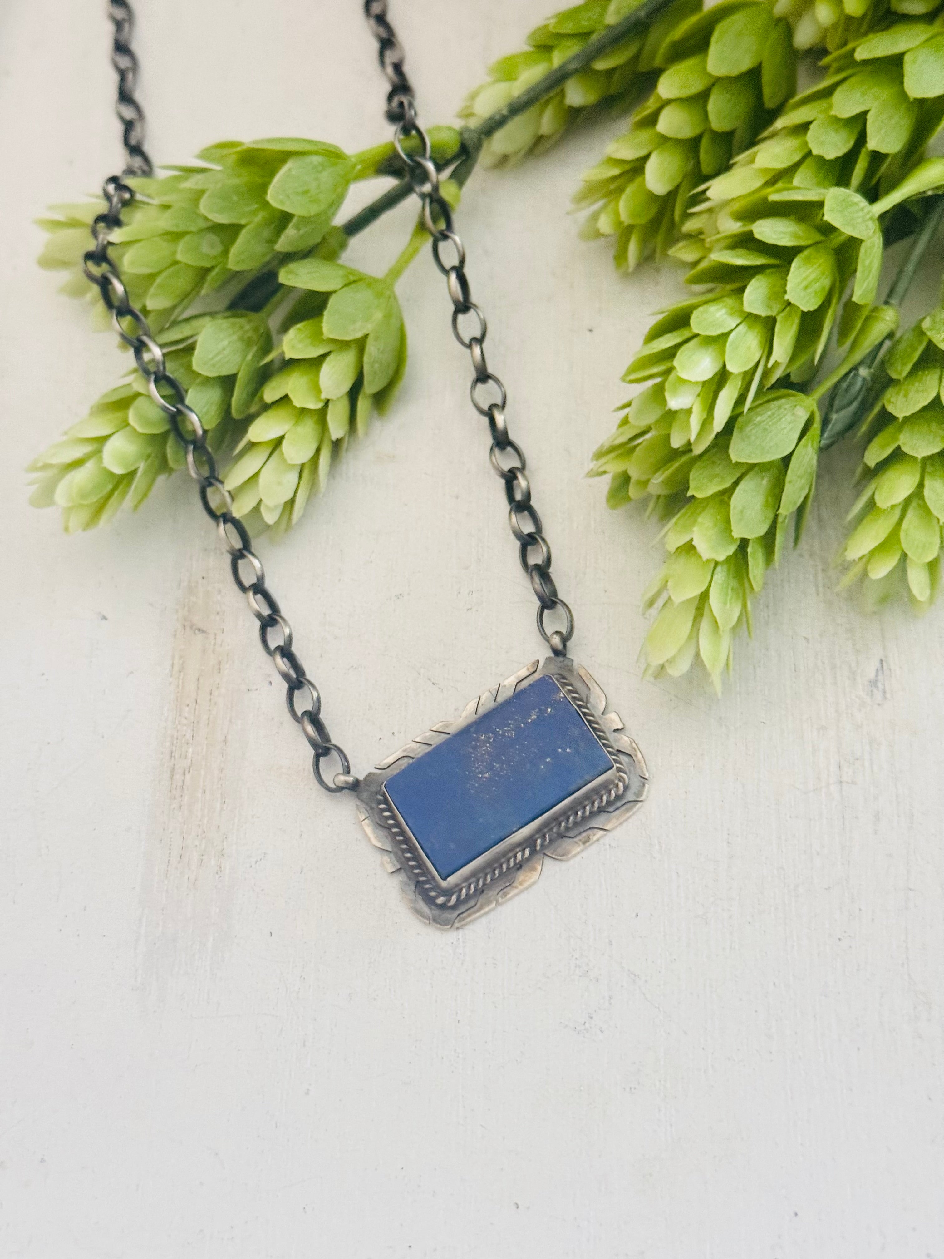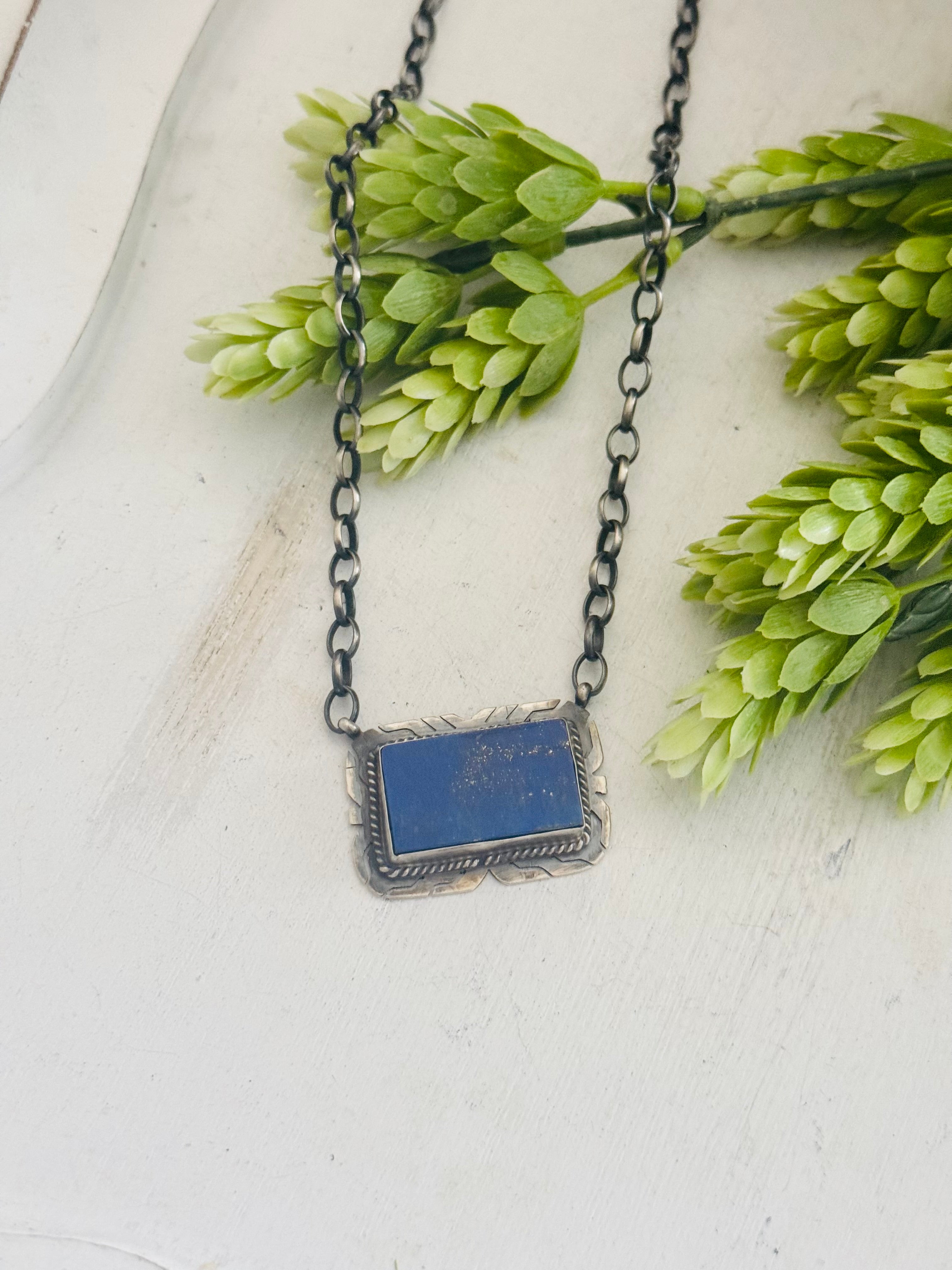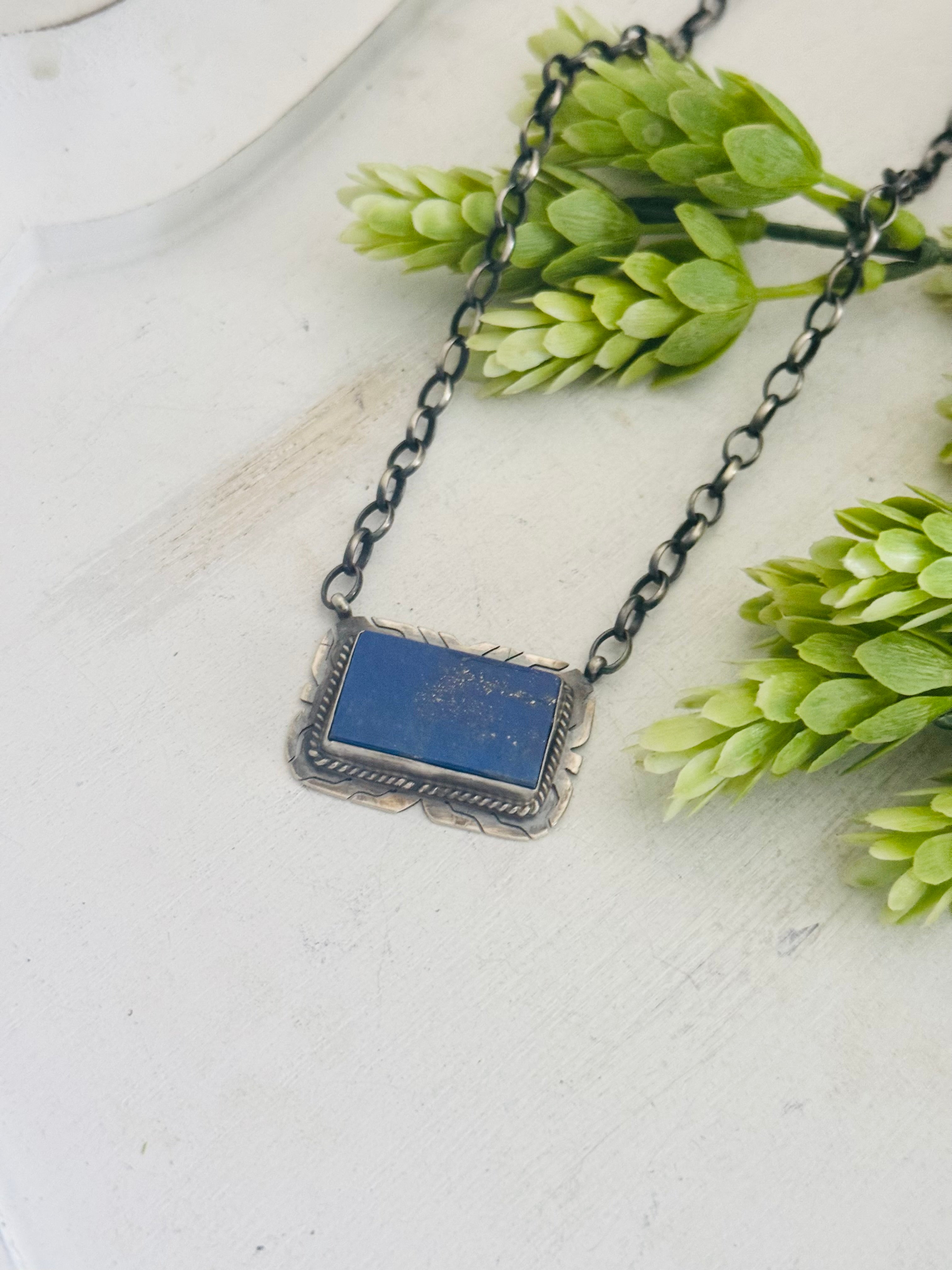 Navajo Made Lapis & Sterling Silver Necklace. It measures 19 inches long with hang but can adjust down to just over 17 inches long. Stamped sterling silver and signed by the artist,