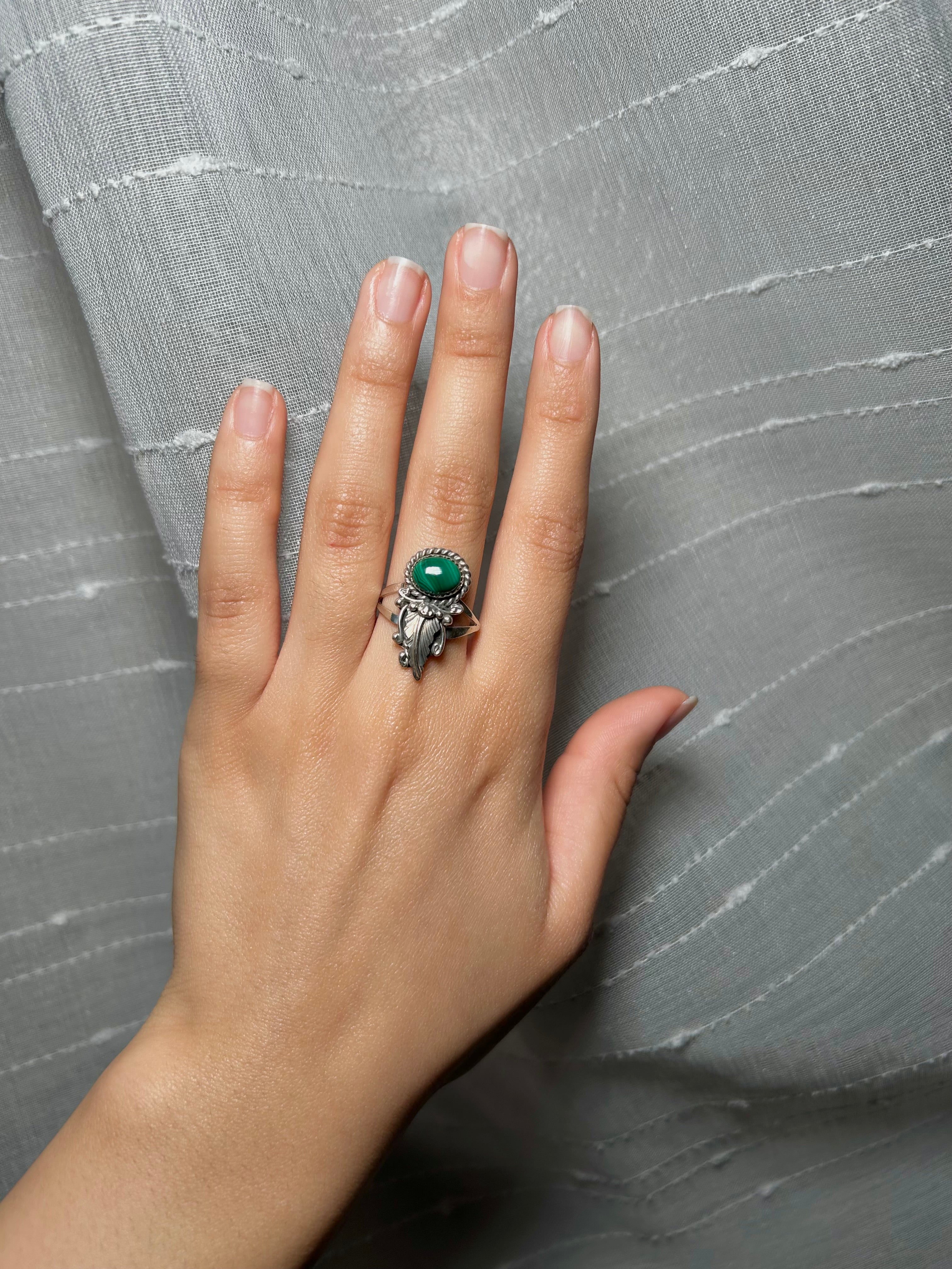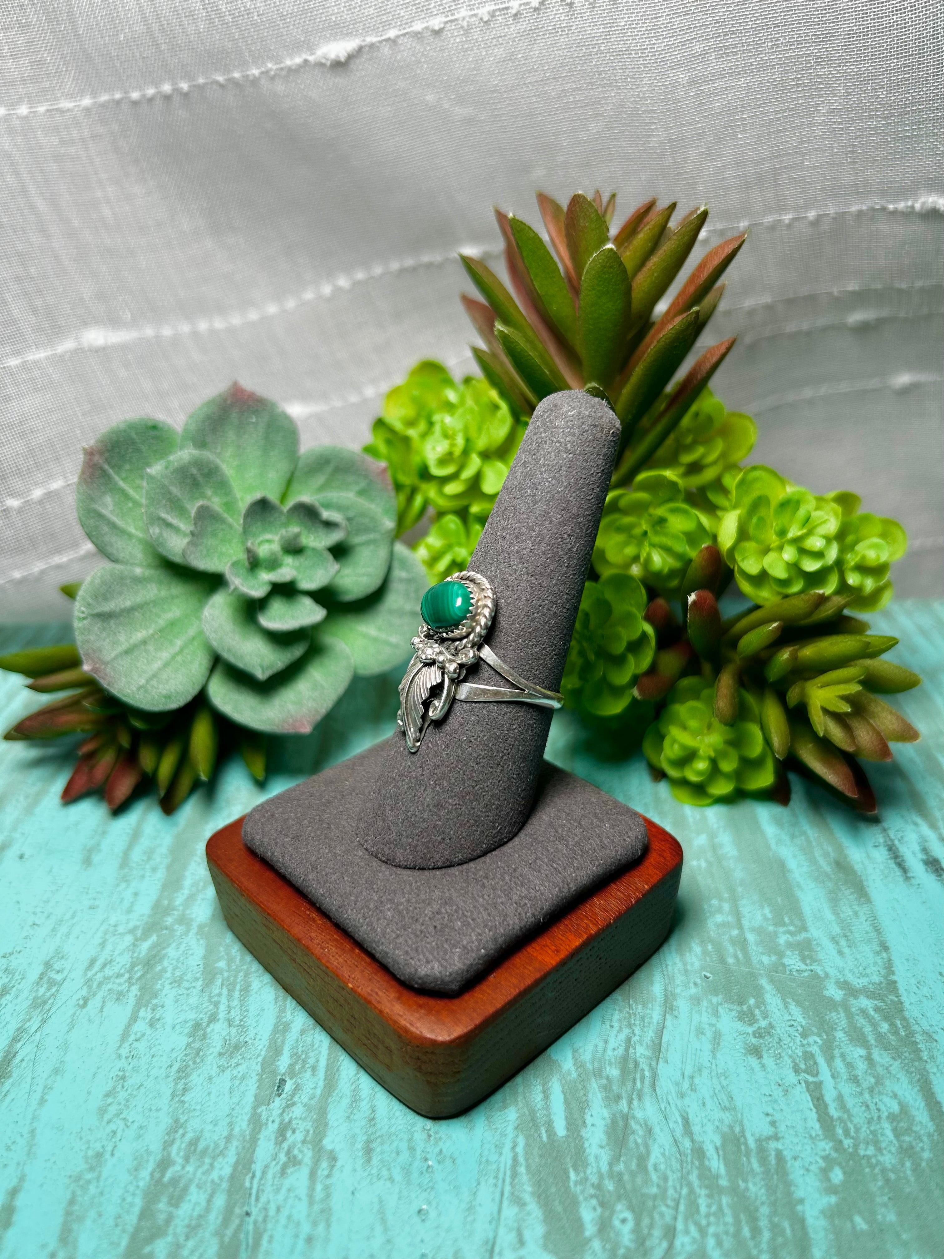 Navajo Made Malachite & Sterling Sliver Ring. It measures 7/8 of an inch long and 5/8 of an inch wide. Signed by the artist and stamped sterling silver. stones will vary due to natural stones.