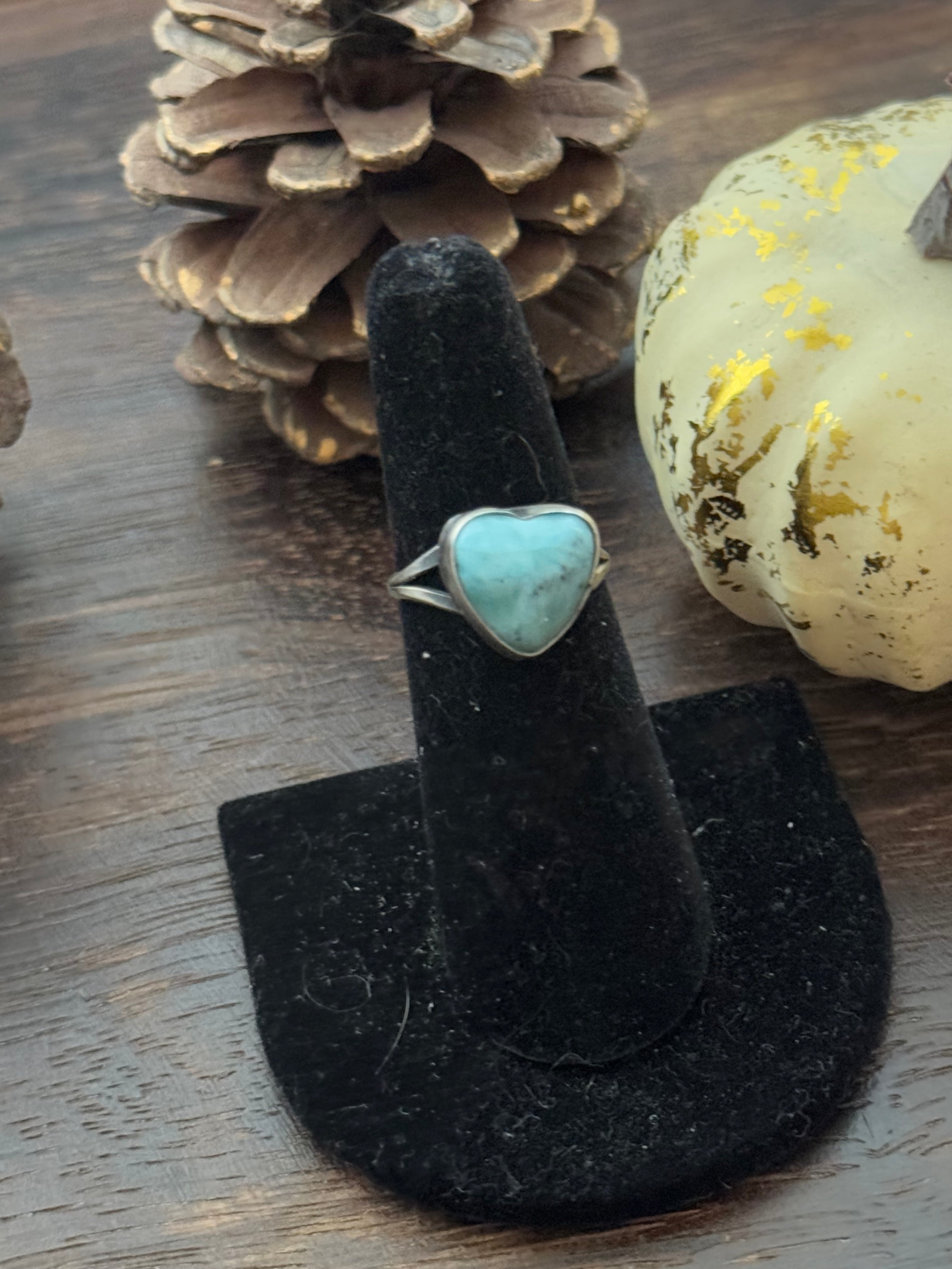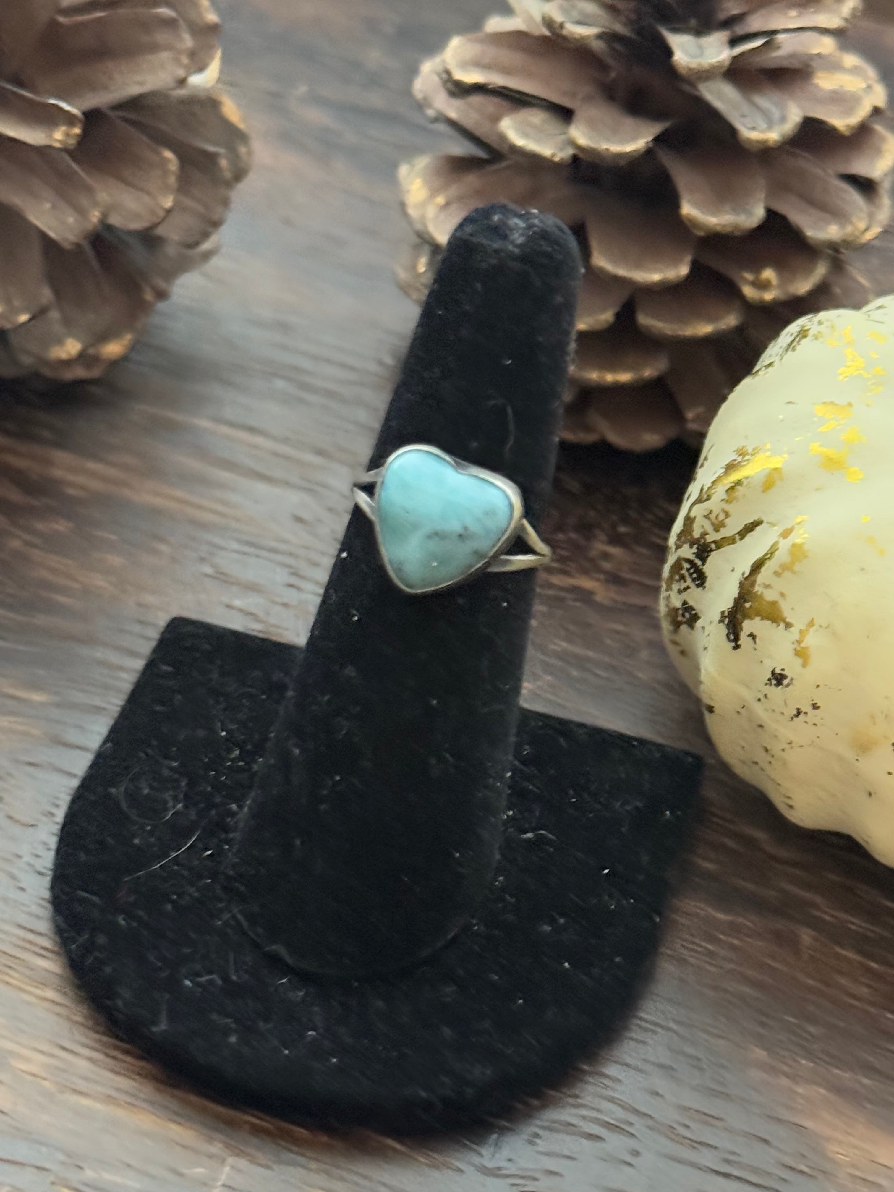Navajo Made Larimar & Sterling Silver Heart Ring Size 5.75. It measures 1/2 of an inch long and 1/2 of an inch wide. Signed by artist and stamped sterling silver.