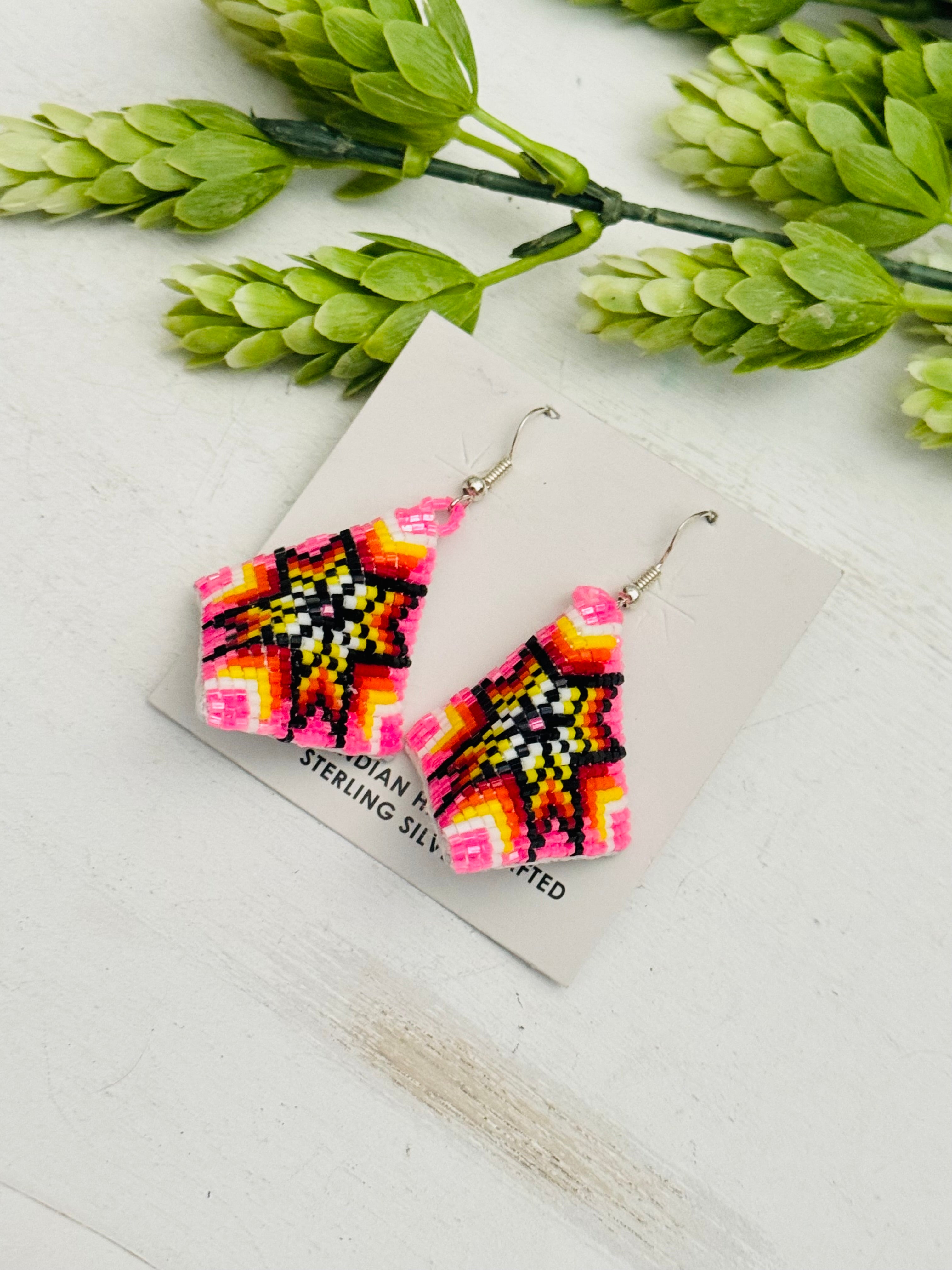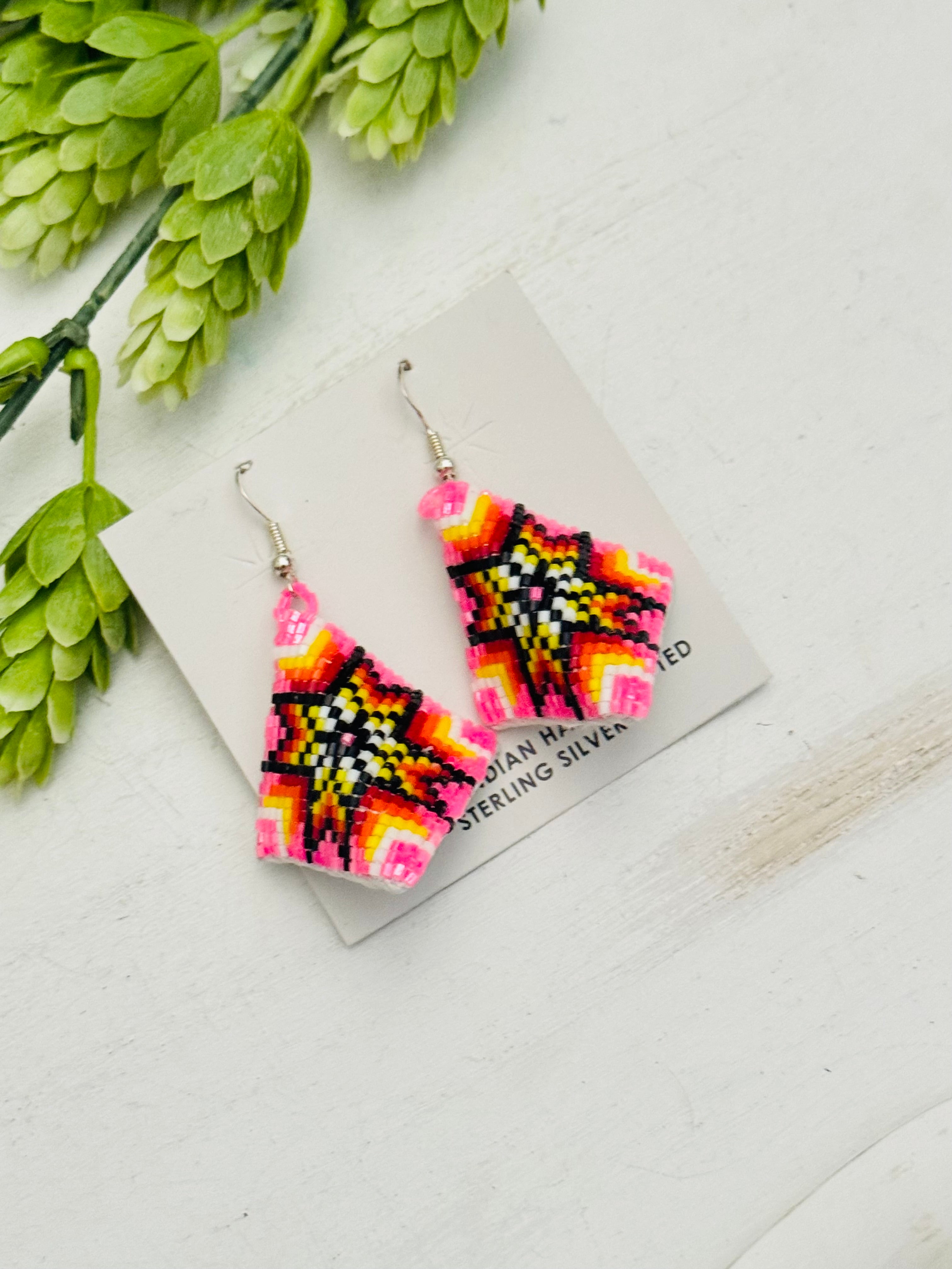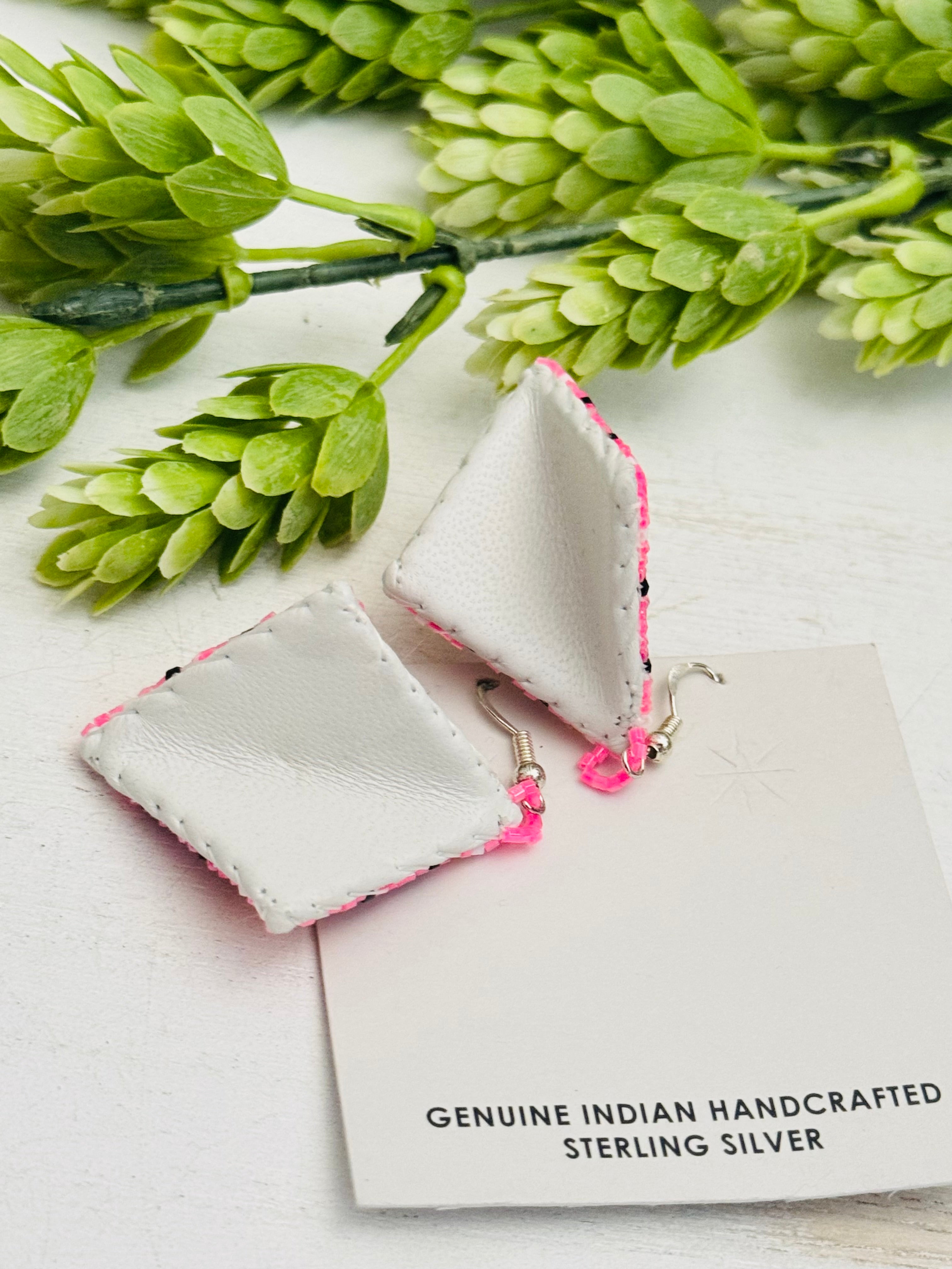 Navajo Made Leather Beaded & Sterling Silver Dangle Earrings