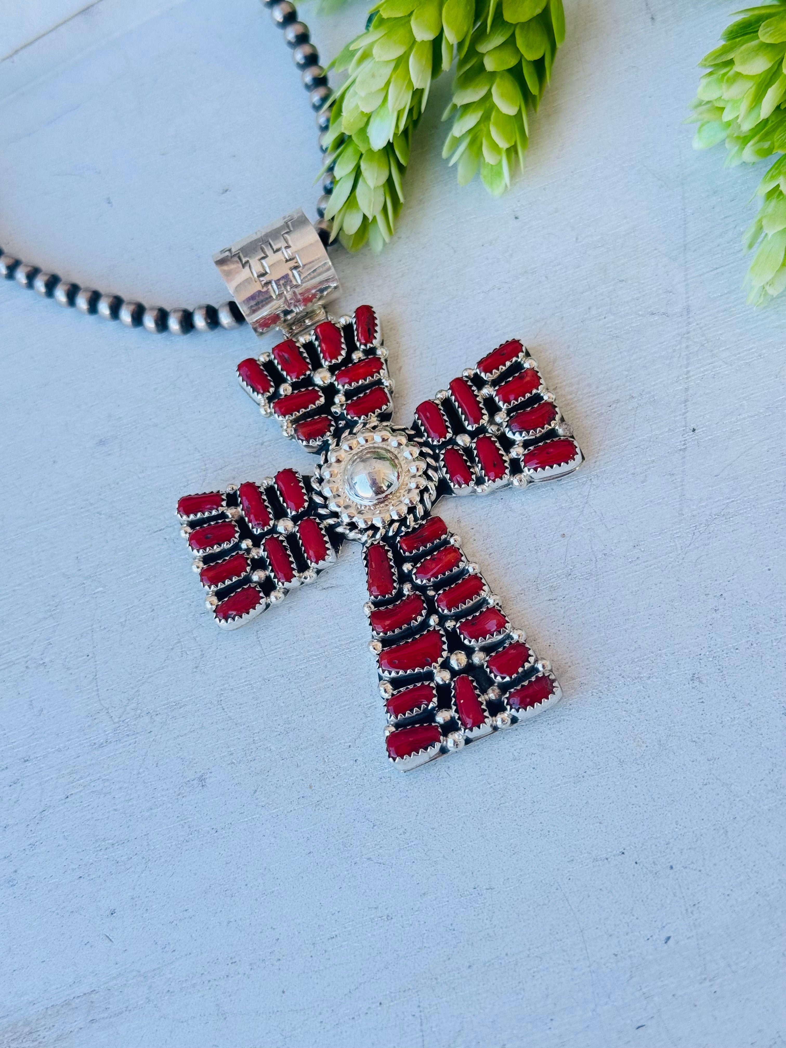 Navajo Made Mediterranean Coral & Sterling Silver Pendant