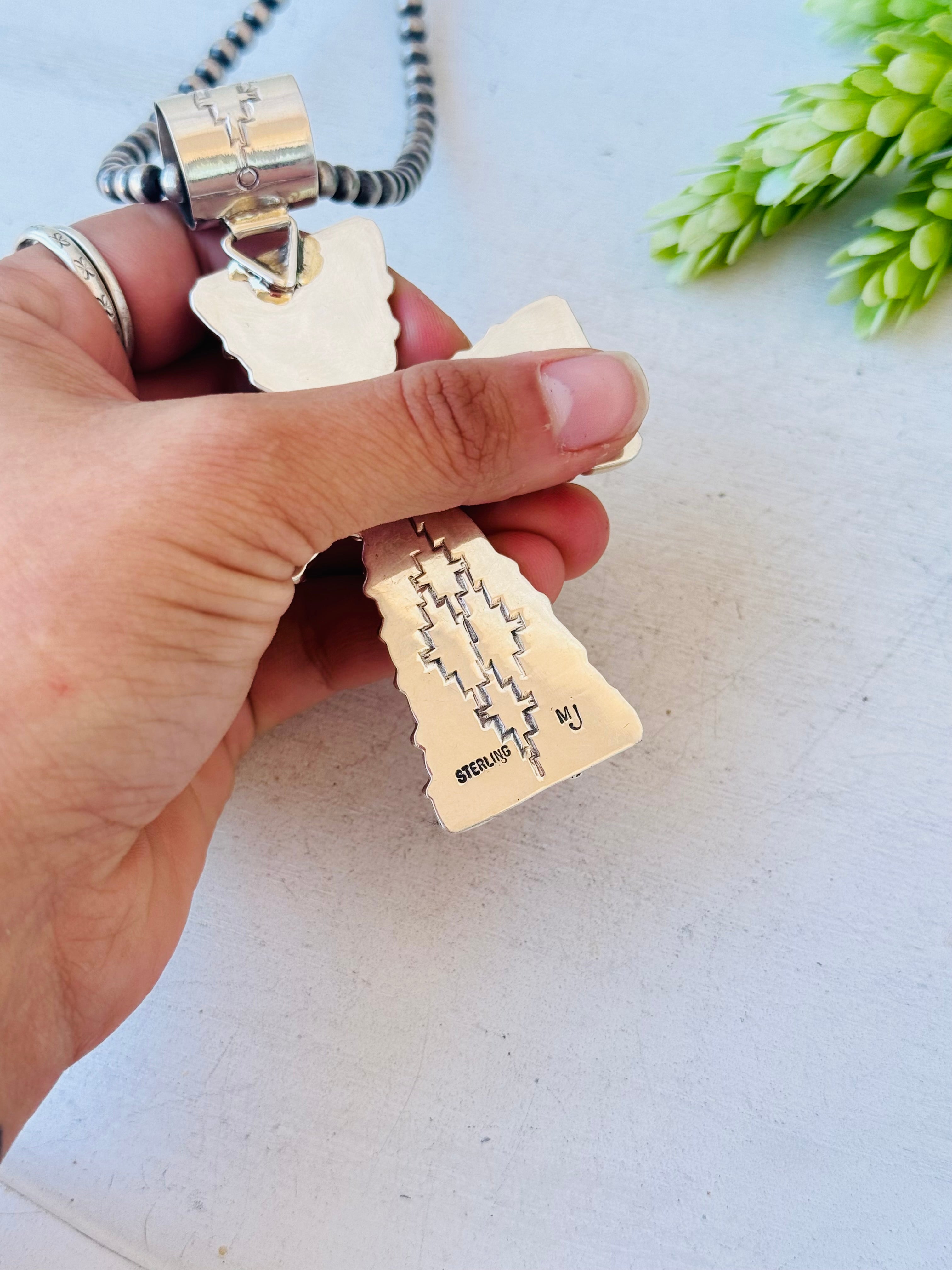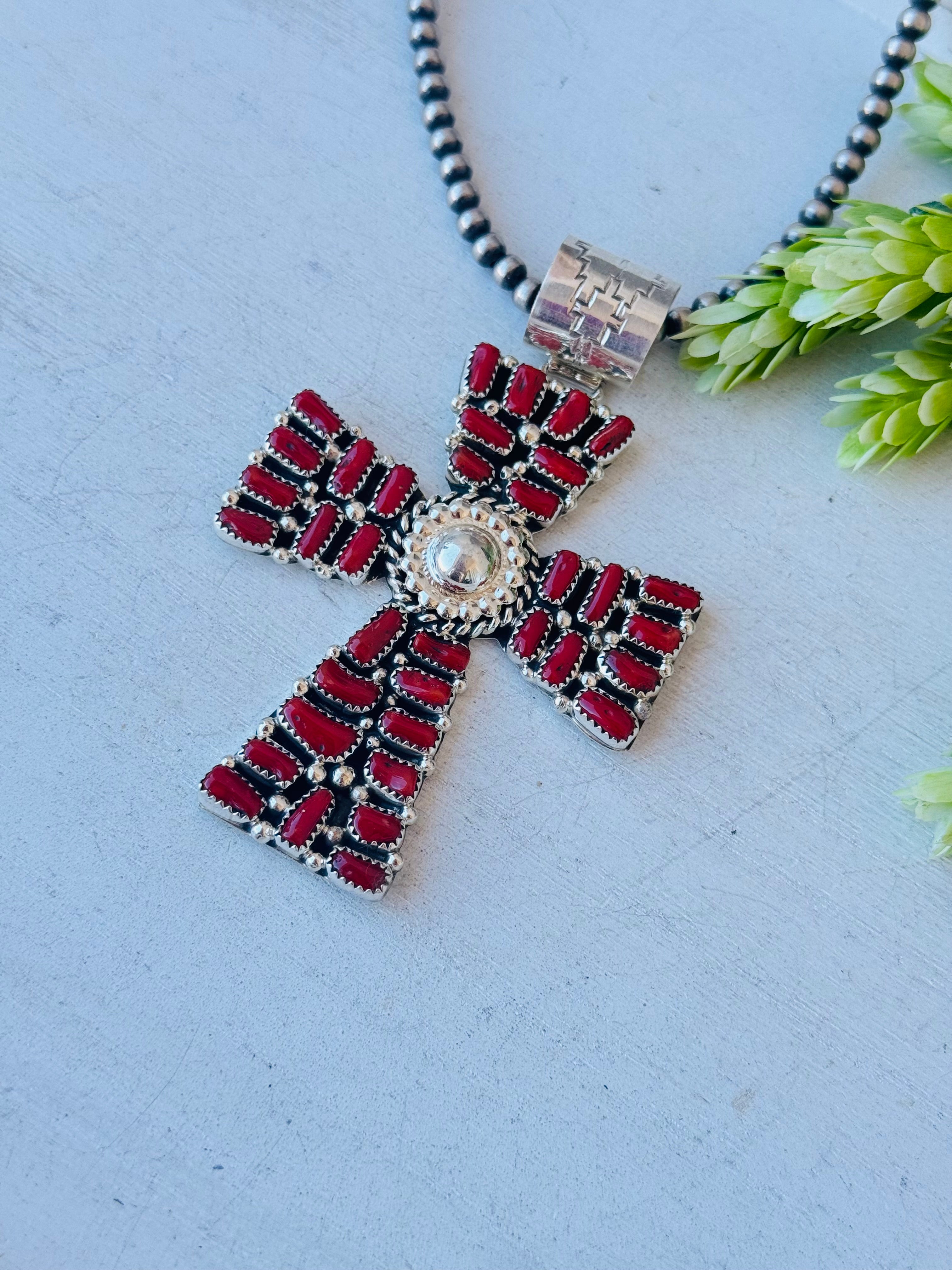 Navajo Made Mediterranean Coral & Sterling Silver Pendant. It measures 3 7/8 inches long and 2 1/2 inches wide. Pendant Only!! Stamped sterling silver and signed by the artist.