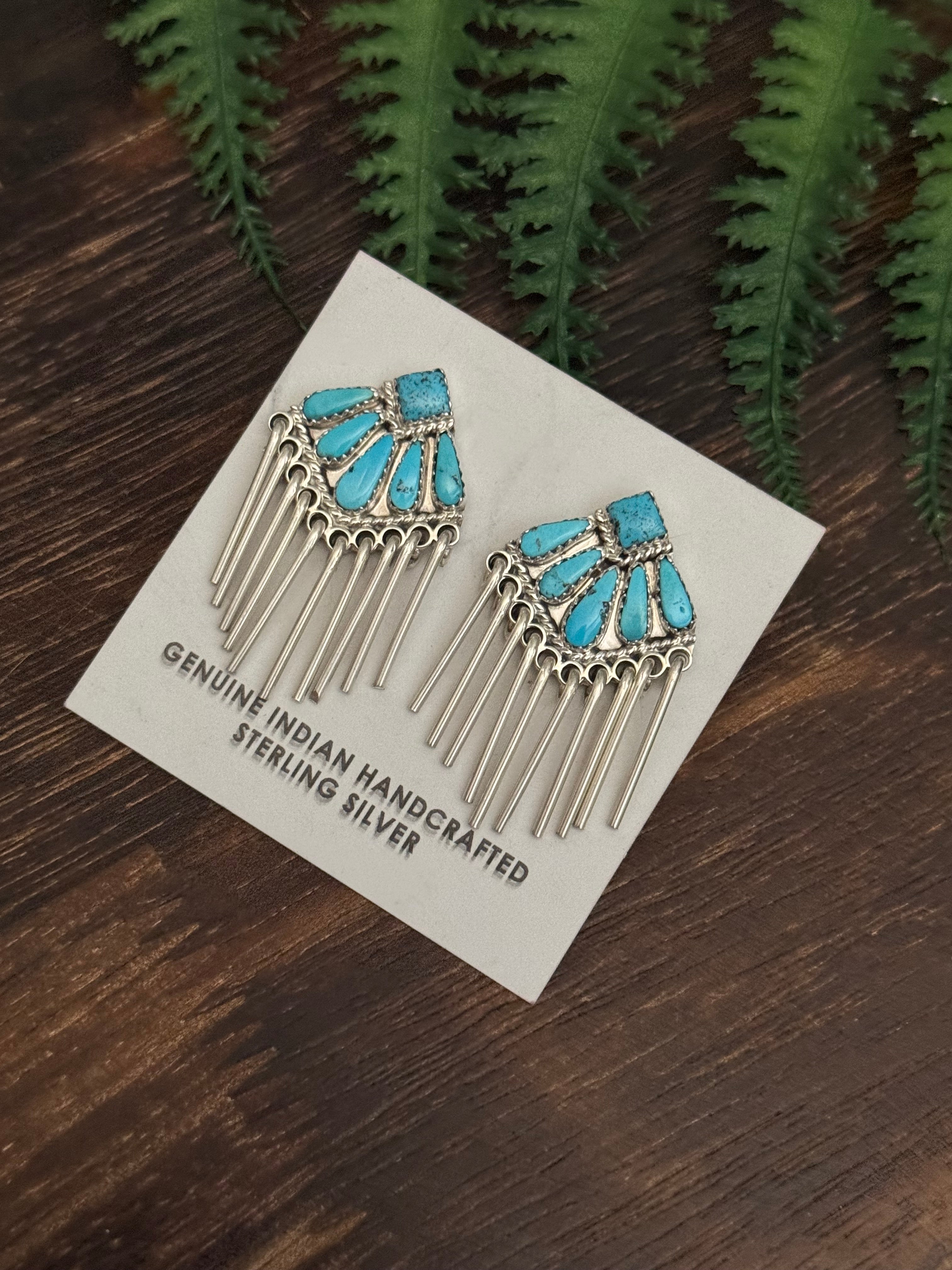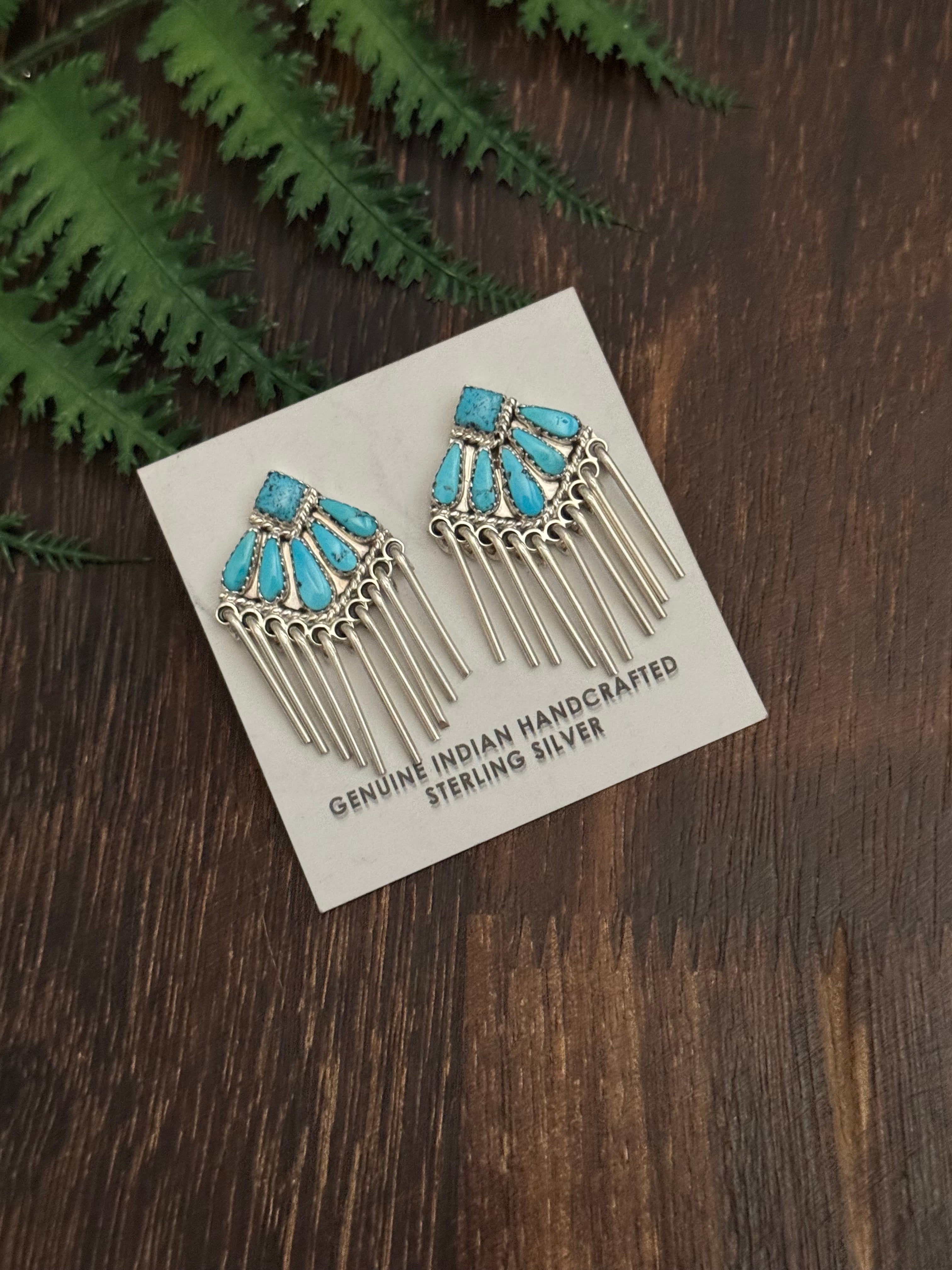 Navajo Made Sleeping Beauty Turquoise & Sterling Silver Post Dangle Cluster Earrings