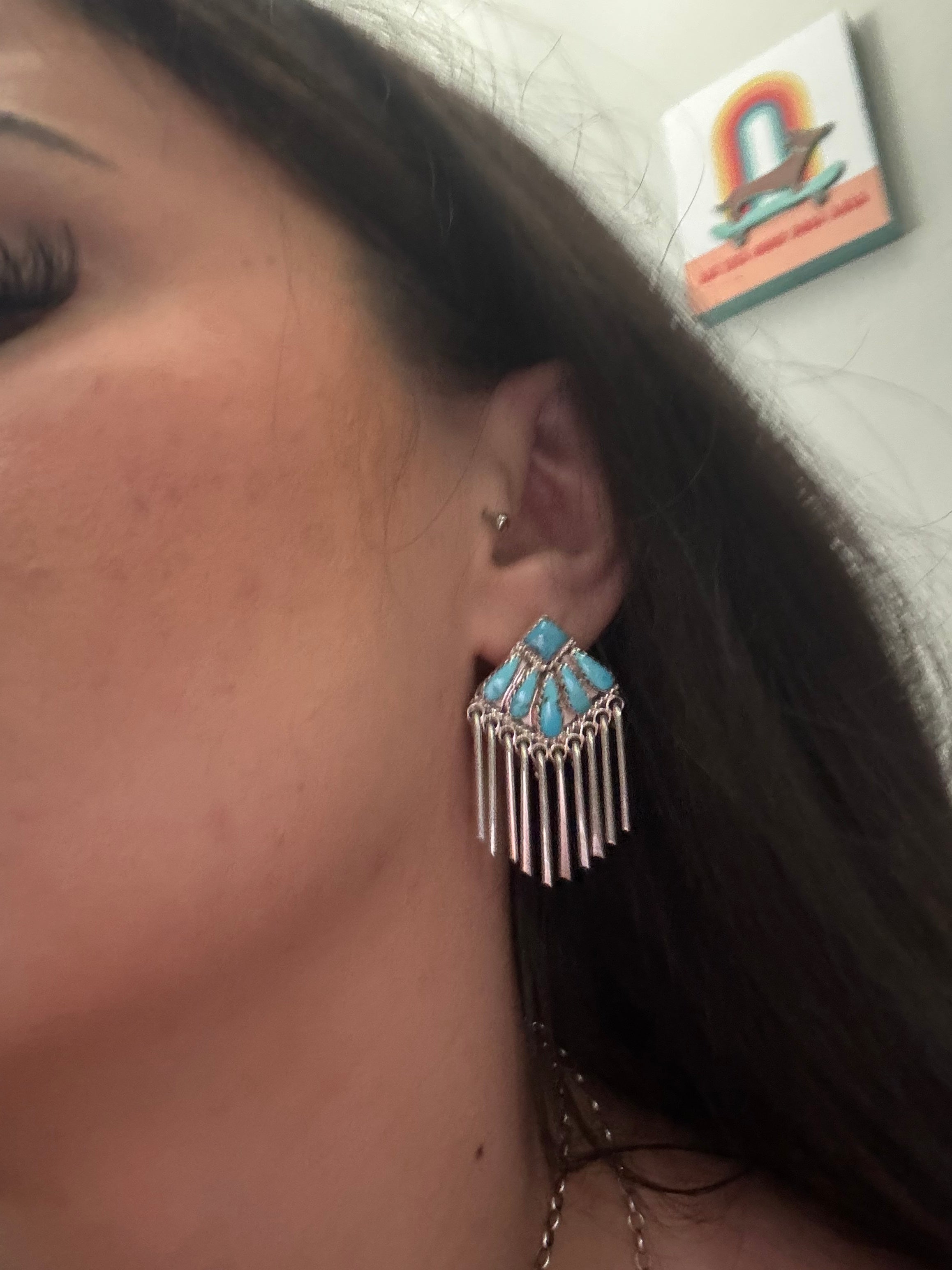 Navajo Made Sleeping Beauty Turquoise & Sterling Silver Post Dangle Cluster Earrings. It measures 1 1/2 inches long and 7/8 of an inch wide. Signed by artist and stamped sterling silver.
