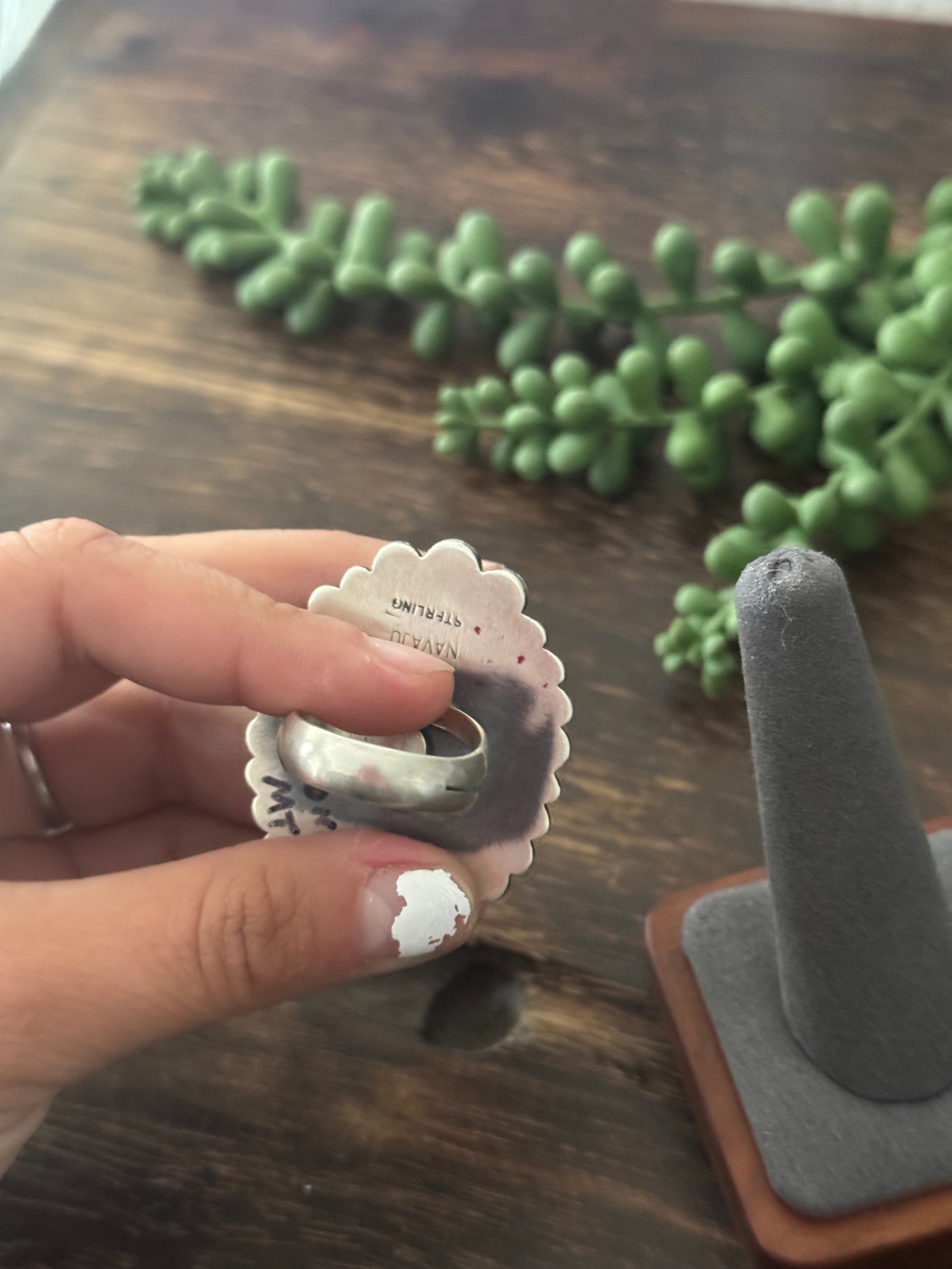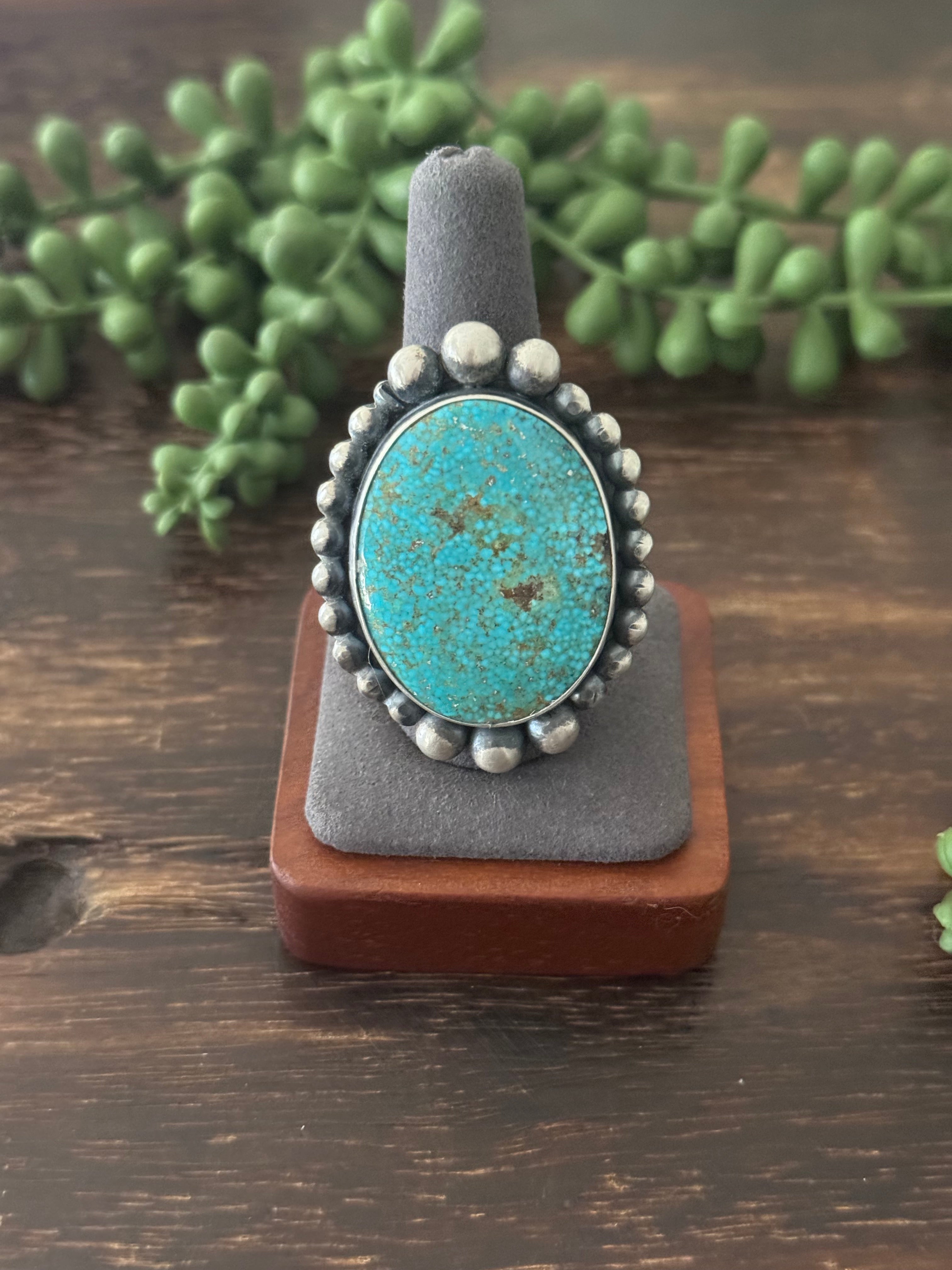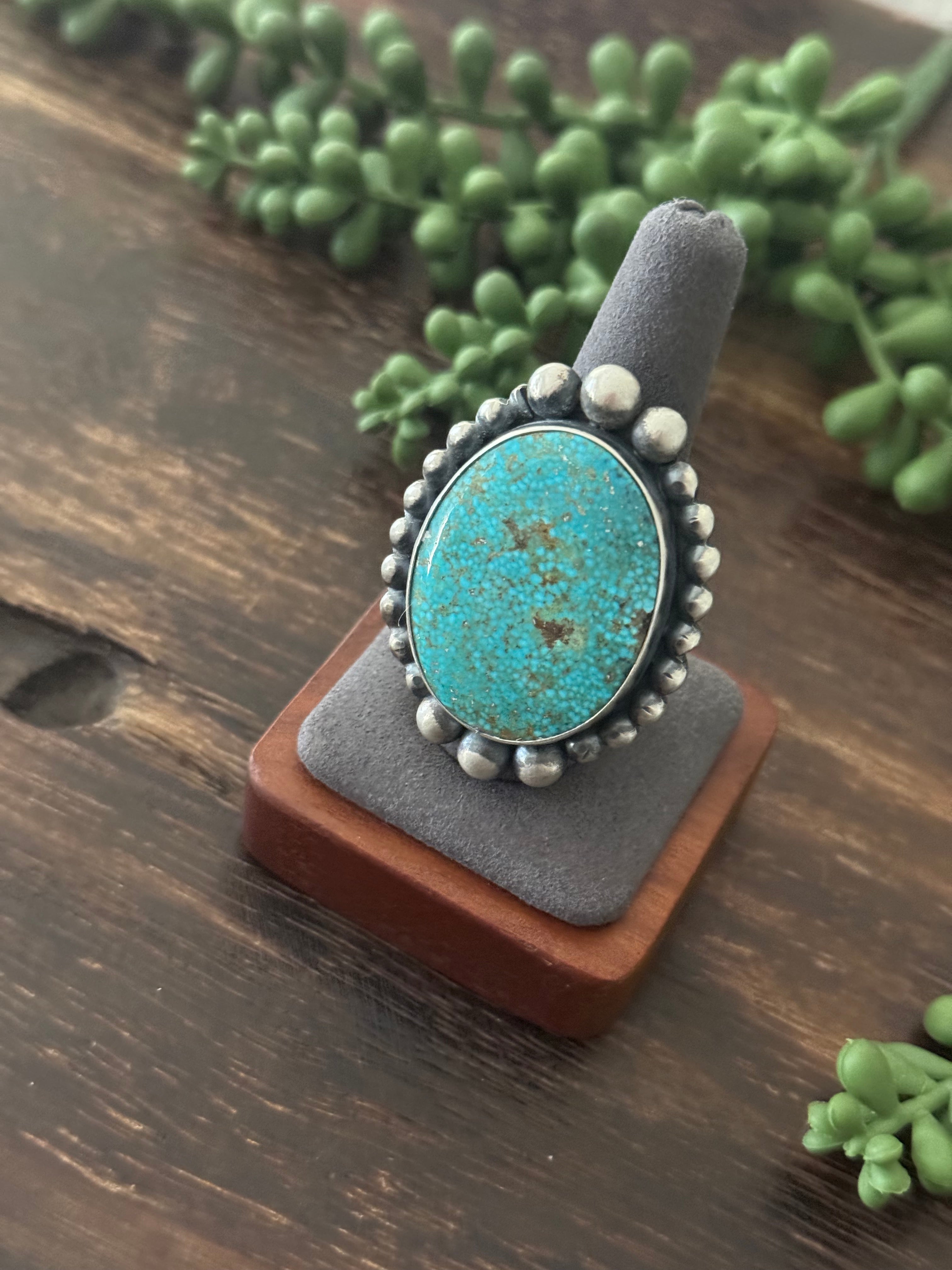 Ernest Begay Lone Mountain Turquoise & Sterling Silver Adjustable Ring. It measures 2 inches long and 1 1/2 inches wide. Signed by the artist and stamped sterling silver.