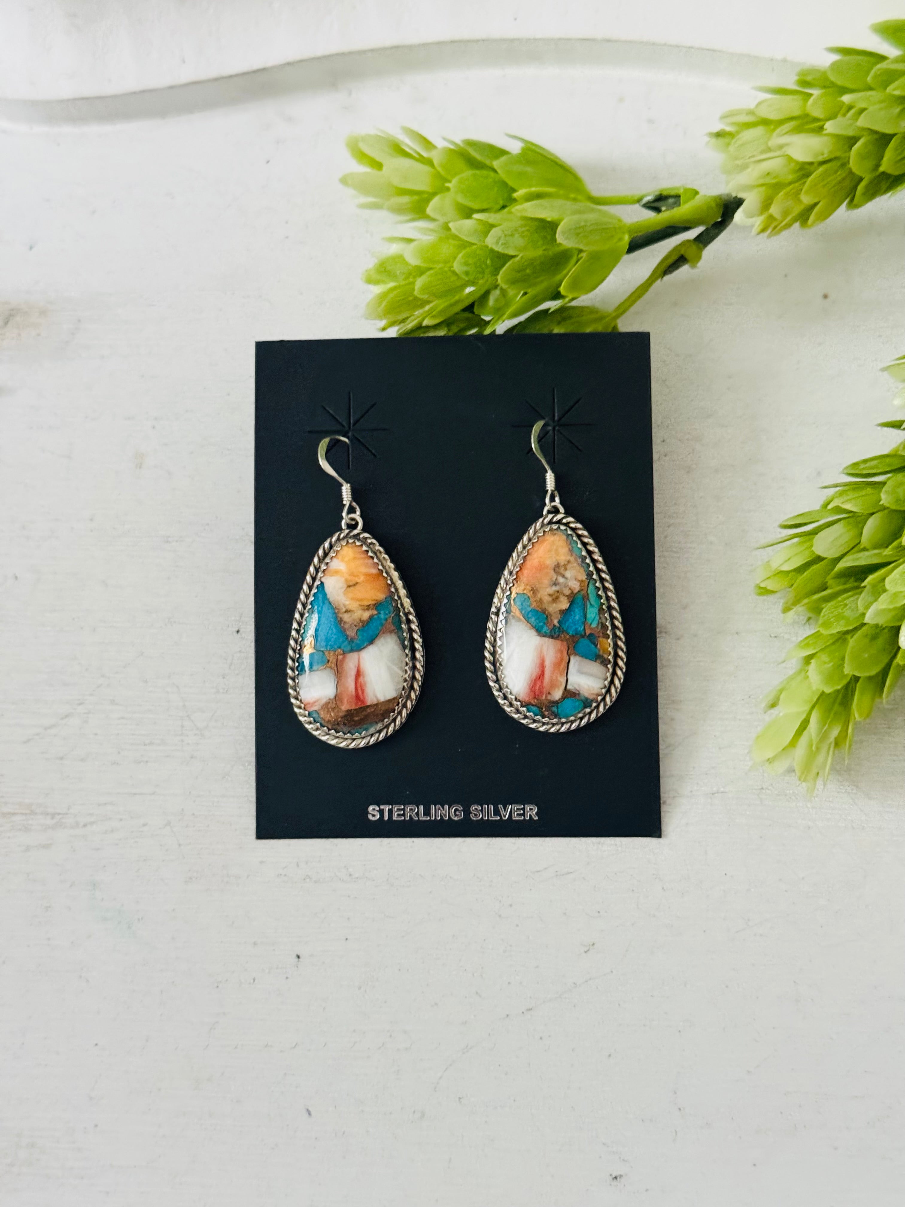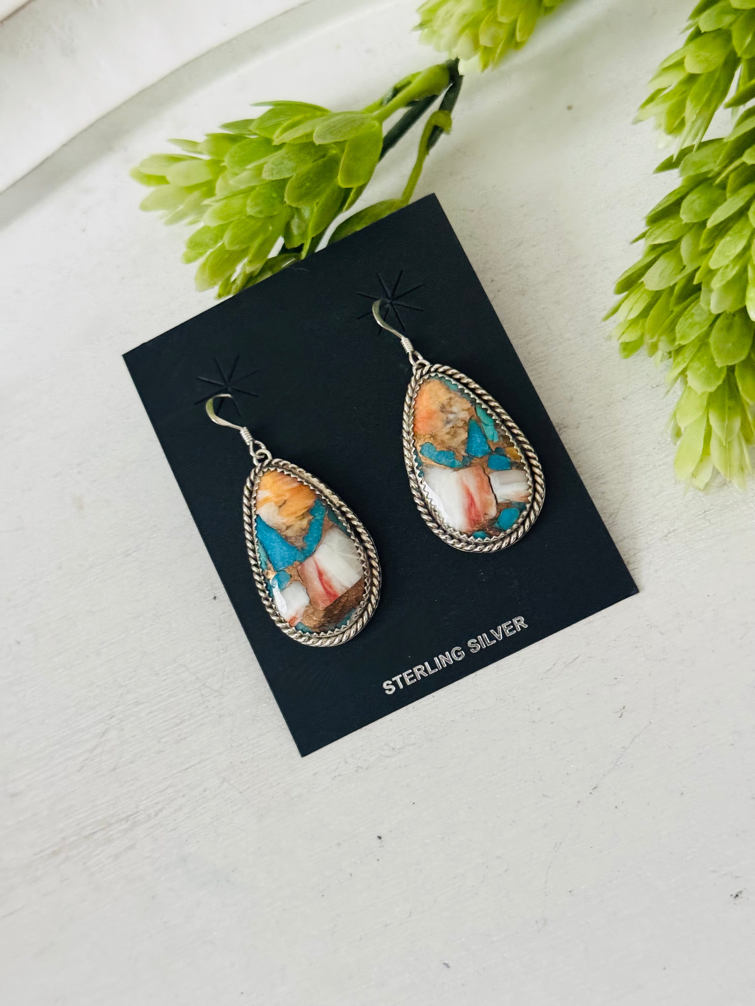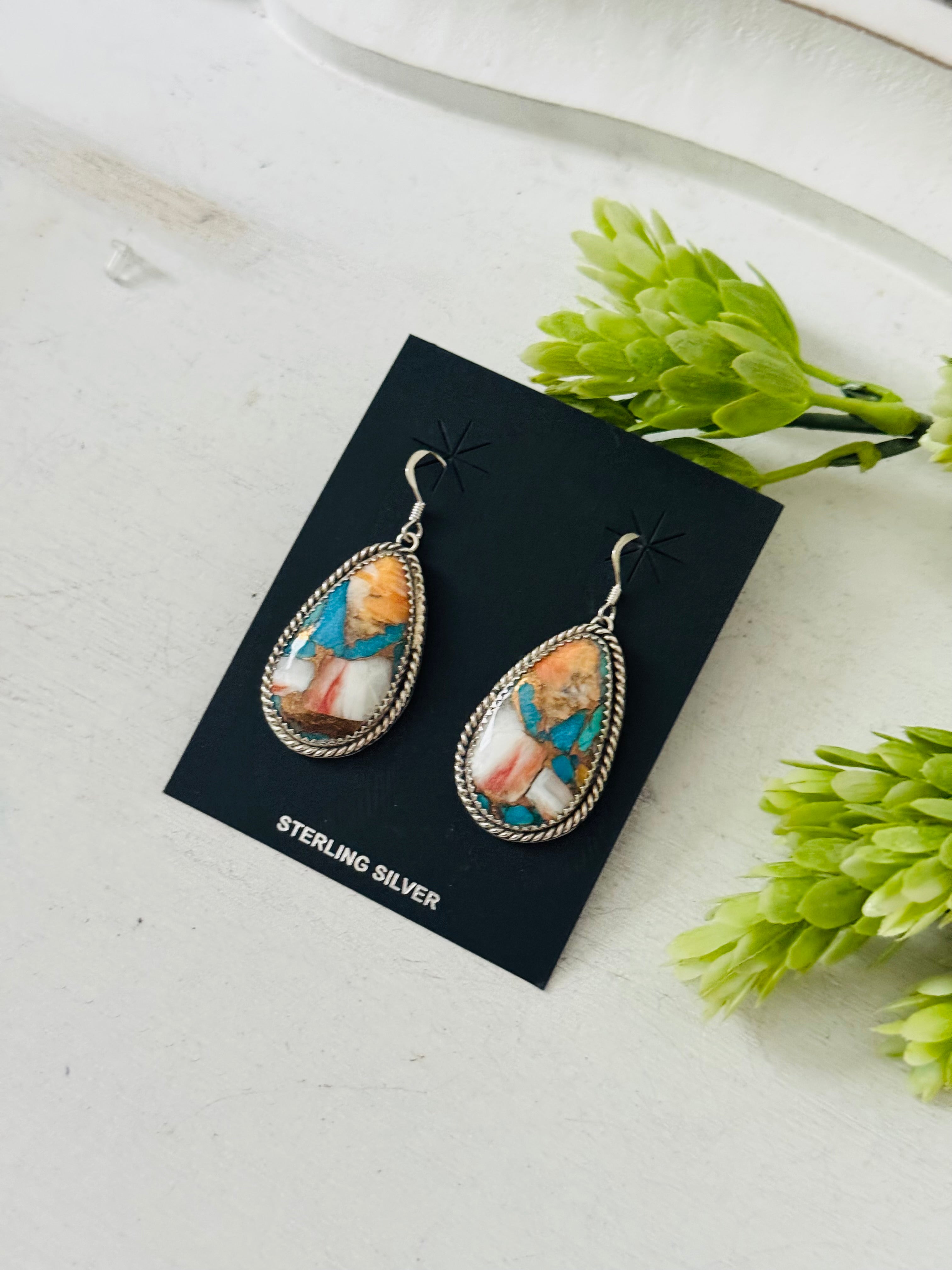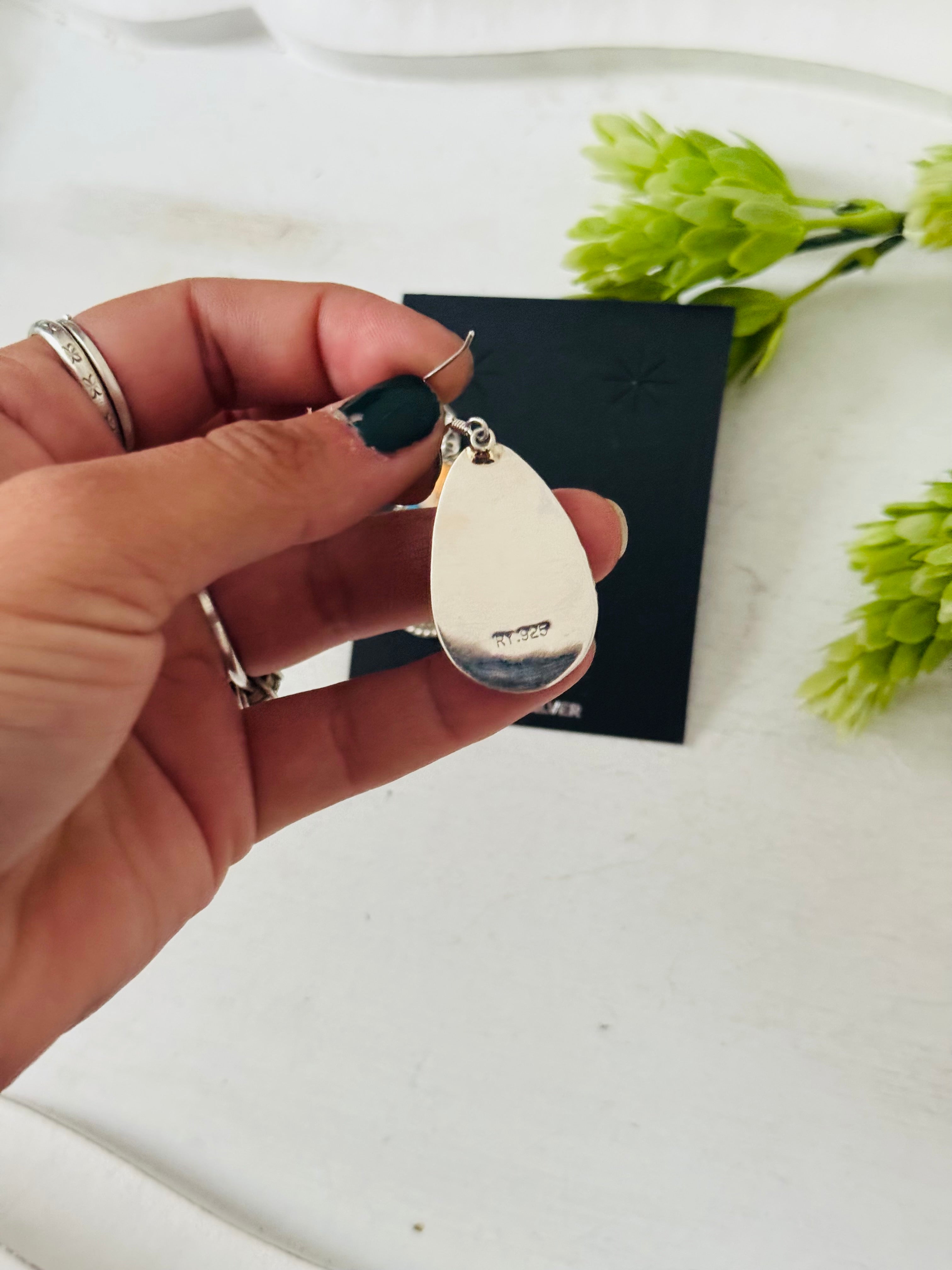 Navajo Made Mohave Turquoise & Sterling Silver Dangle Earrings. They measure 1 7/8 inches long and 7/8 of an inch wide. Signed by the artist and stamped sterling silver.