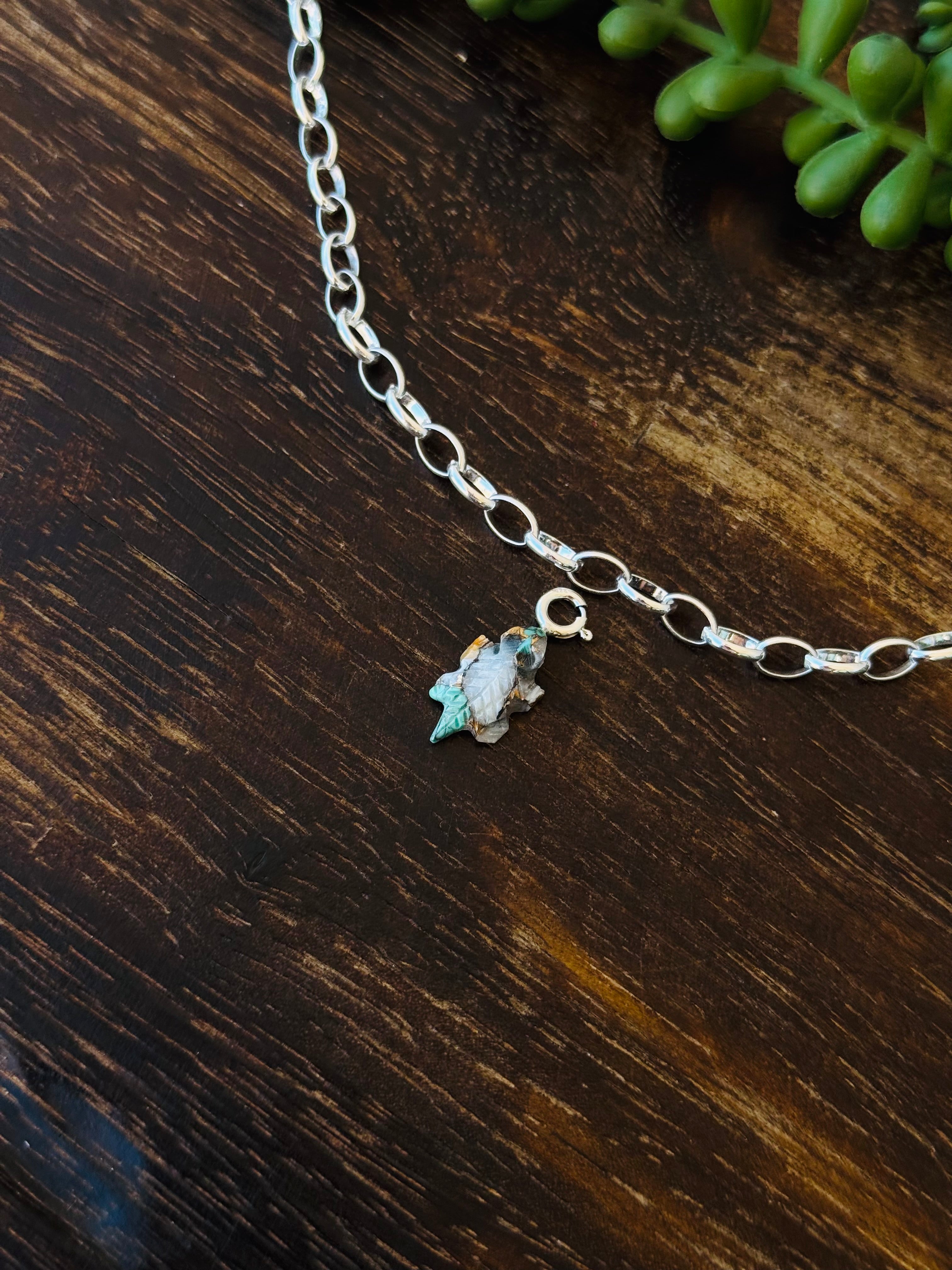Navajo Made Mohave Turquoise & Sterling Silver Horny Toad Charms. It measures 1 inch long. **Native** Stones will differ due to natural stones.