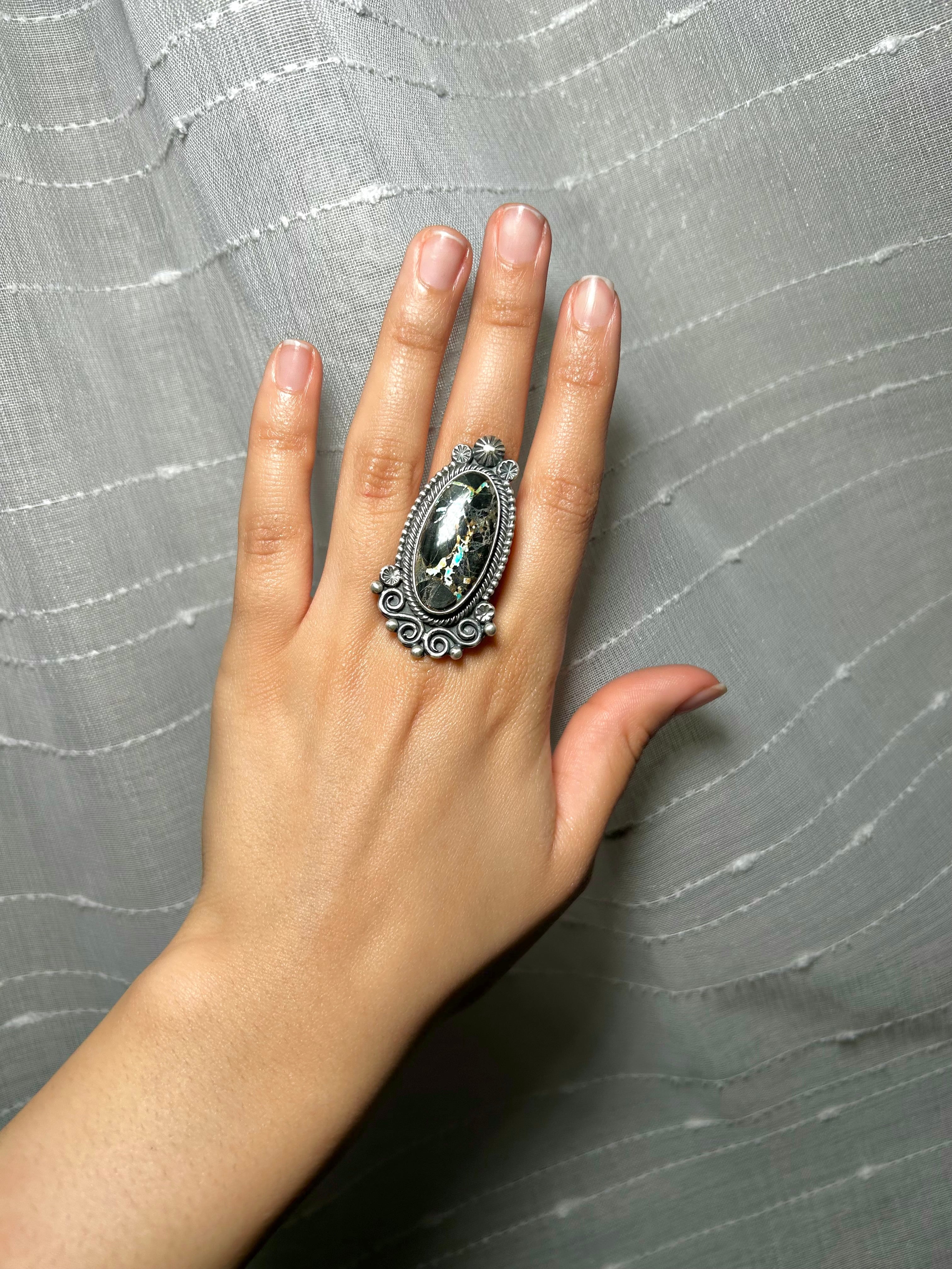 Navajo Made Black Jack Turquoise & Sterling Silver Ring Size 7.75. It measures 1 7/8 inches long and 1 inch wide. Signed by the artist and stamped sterling silver.