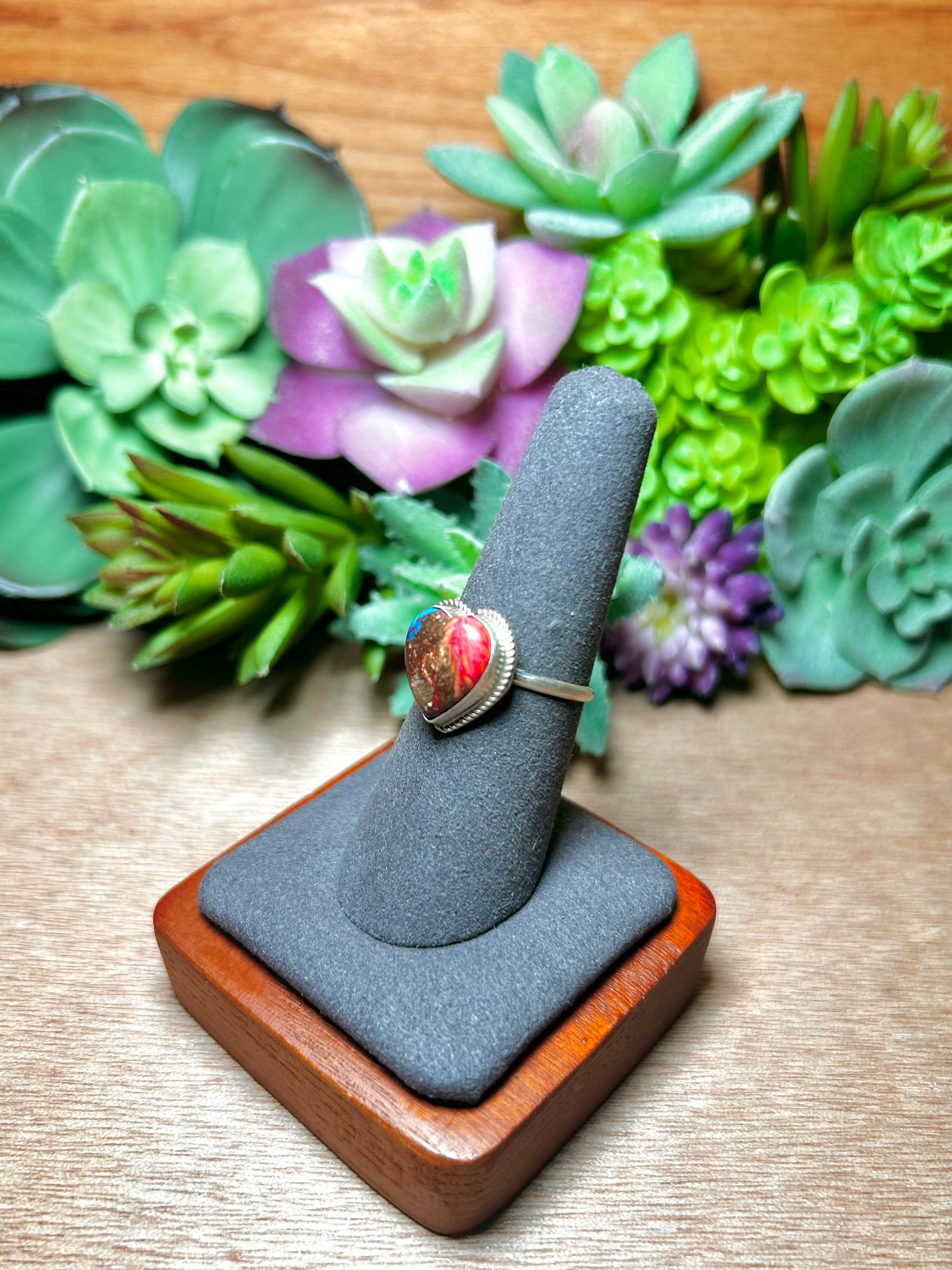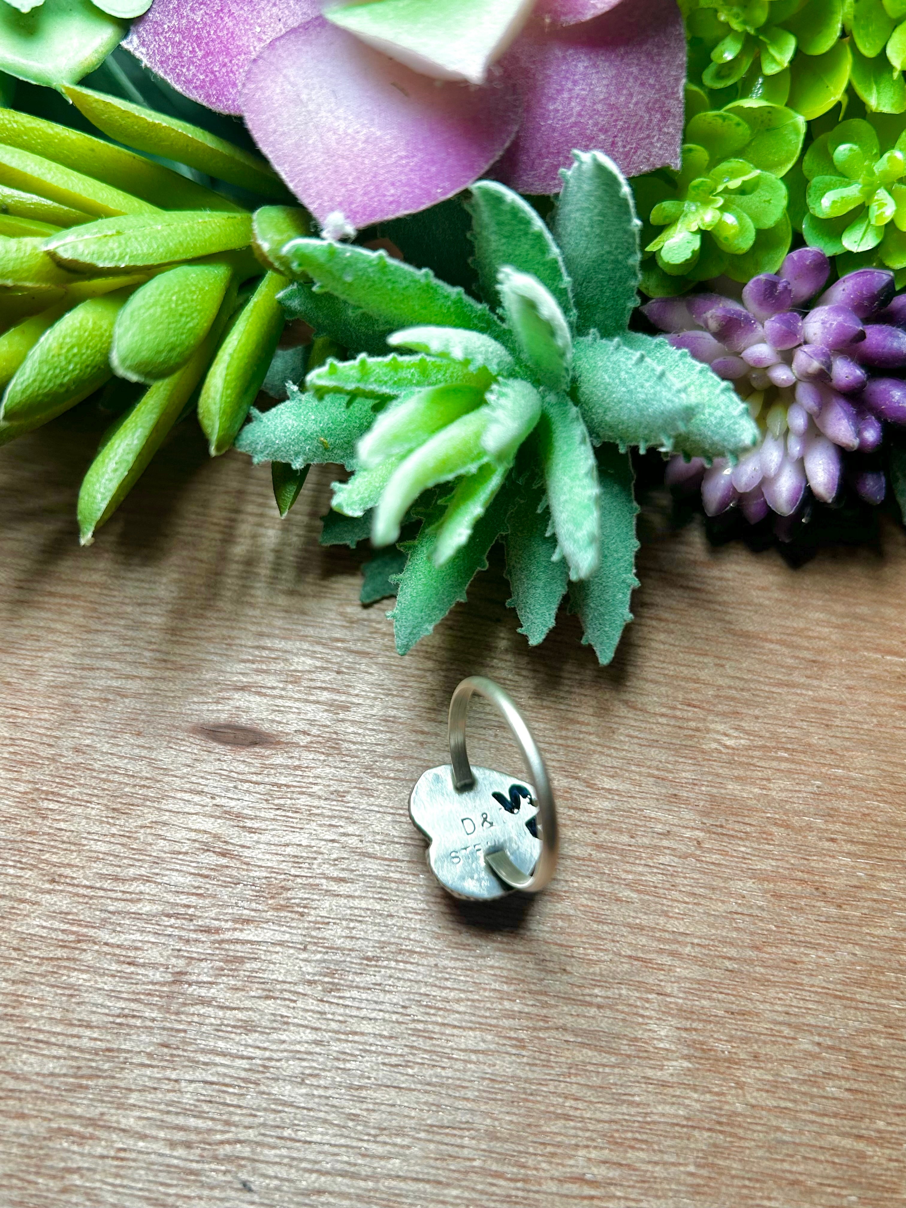 Navajo Made Mohave Turquoise & Sterling Silver Ring Size 7.75. It measures 5/8 of an inch long and 1/2 of an inch wide. Signed by the artist and stamped sterling silver.