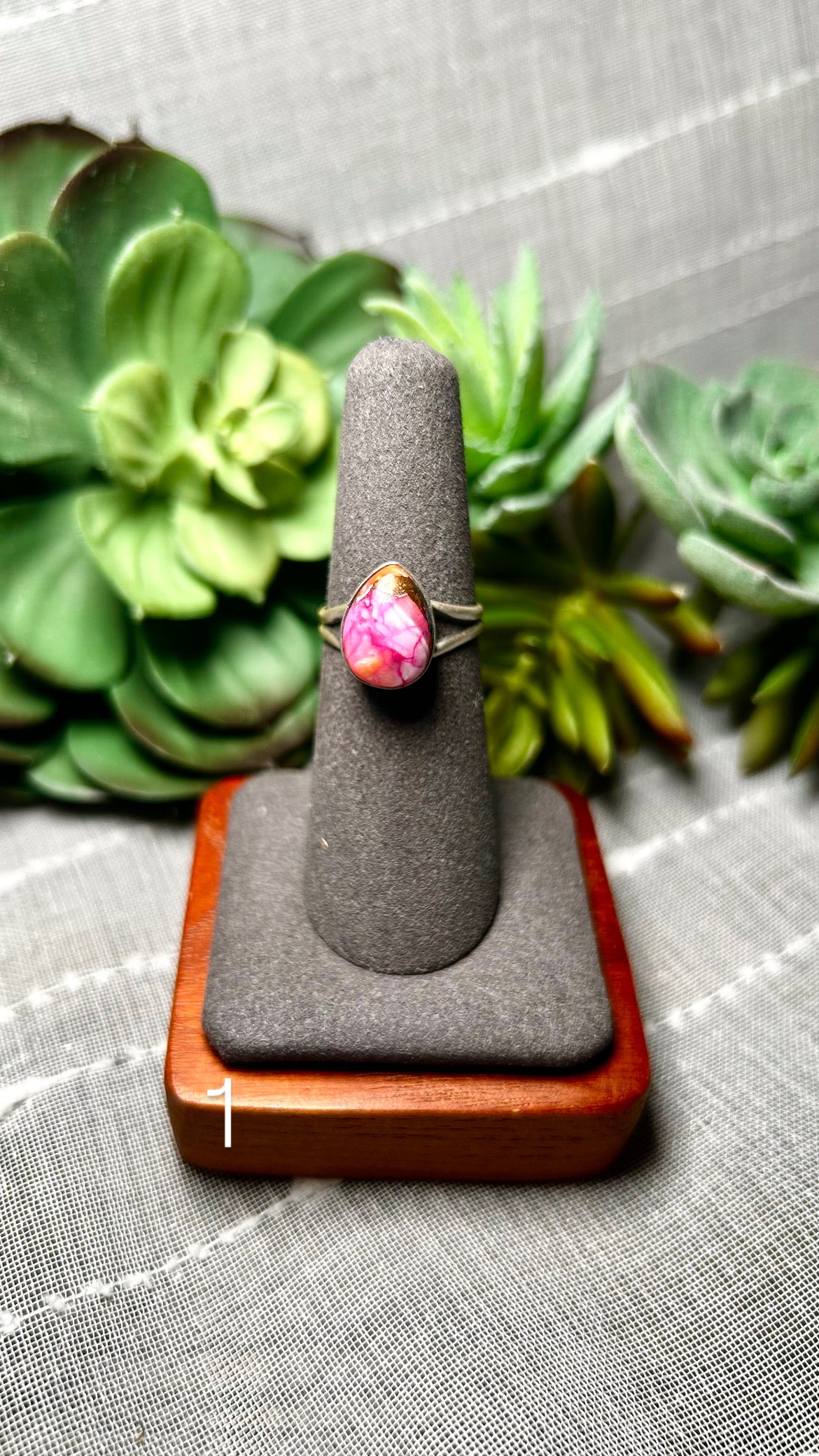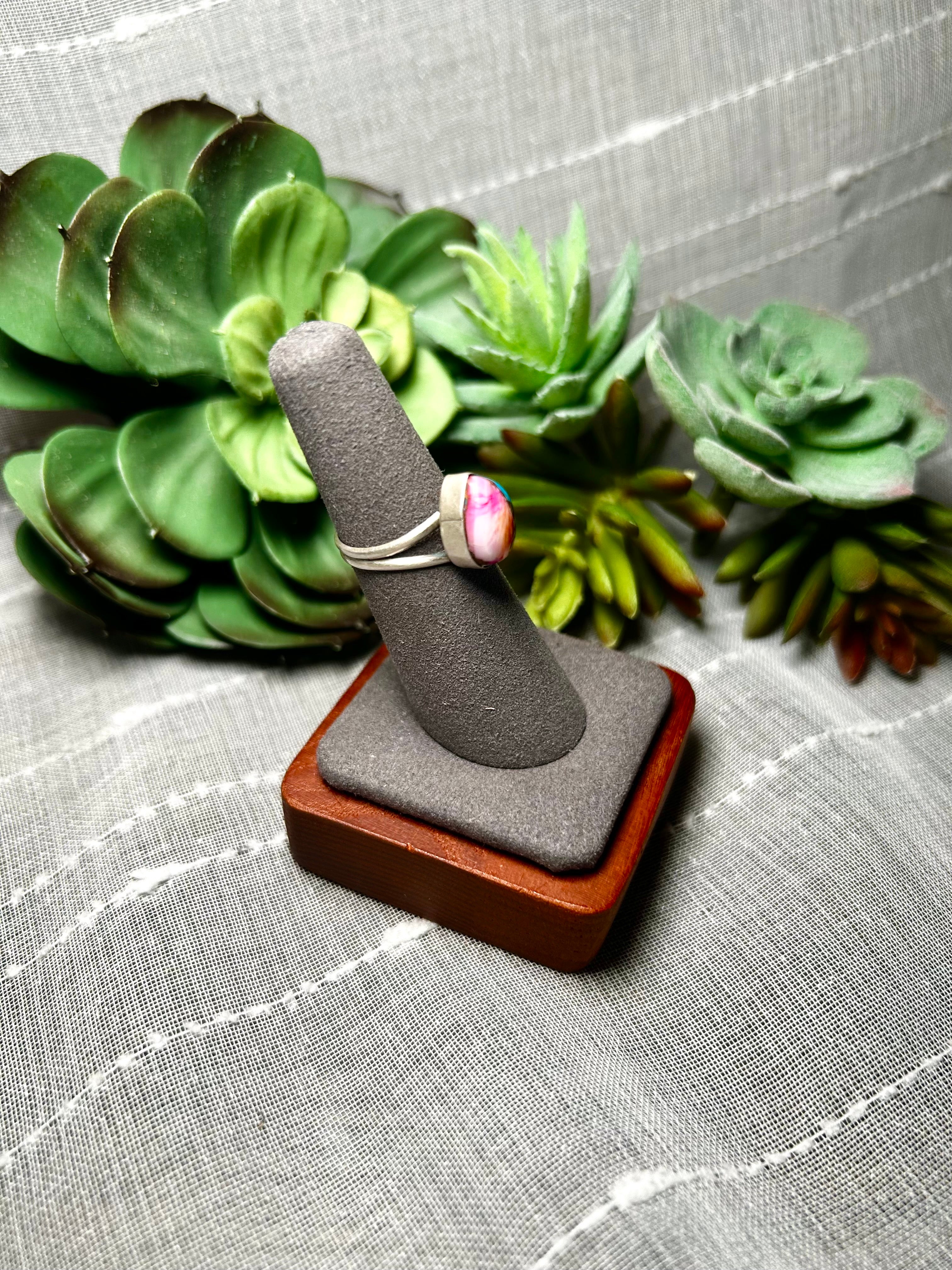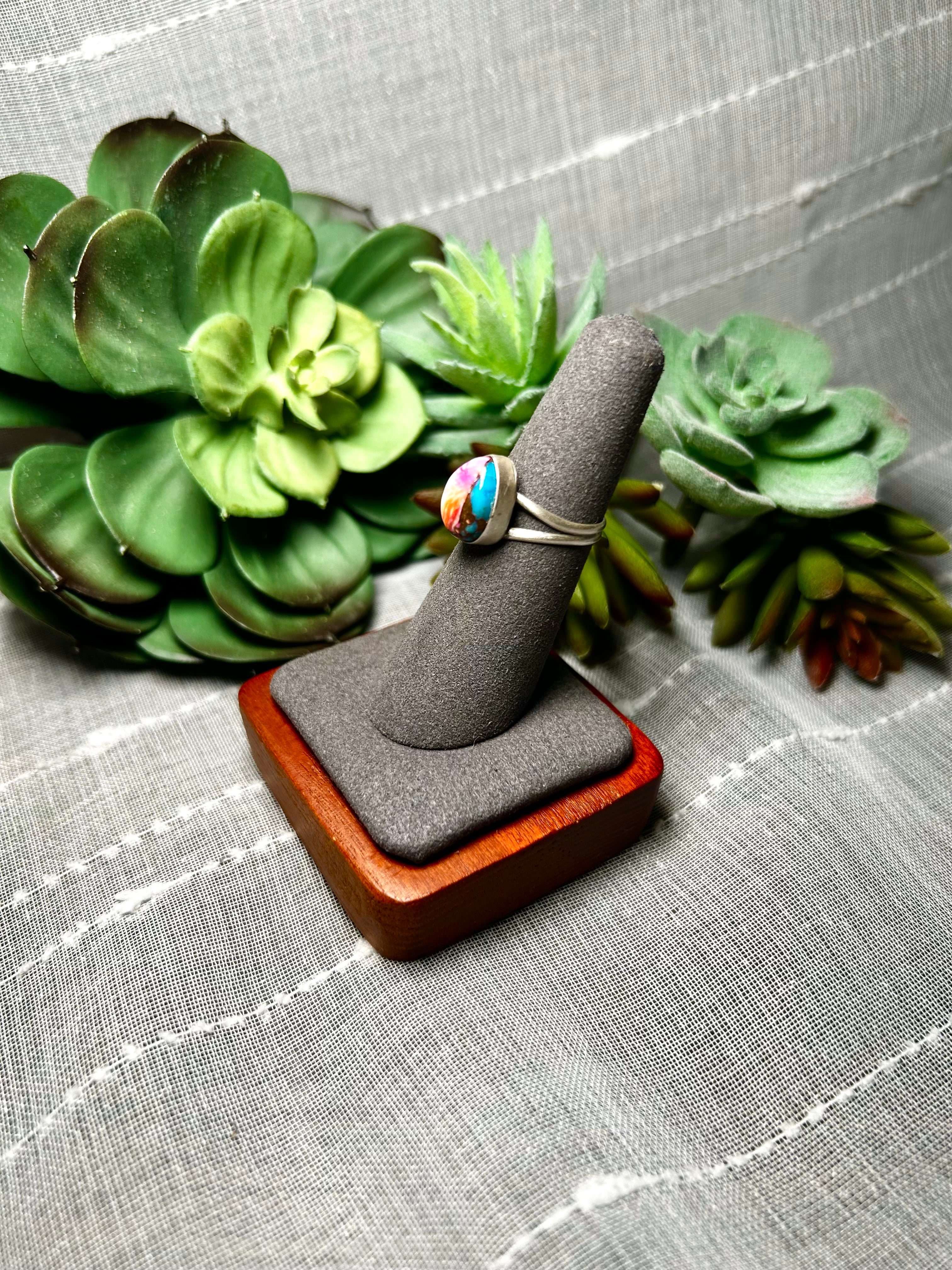 Navajo Made Mohave Turquoise & Sterling Silver Ring. It measures 1/2 of an inch long and 3/8 of an inch wide. Signed by the artist and stamped sterling silver.