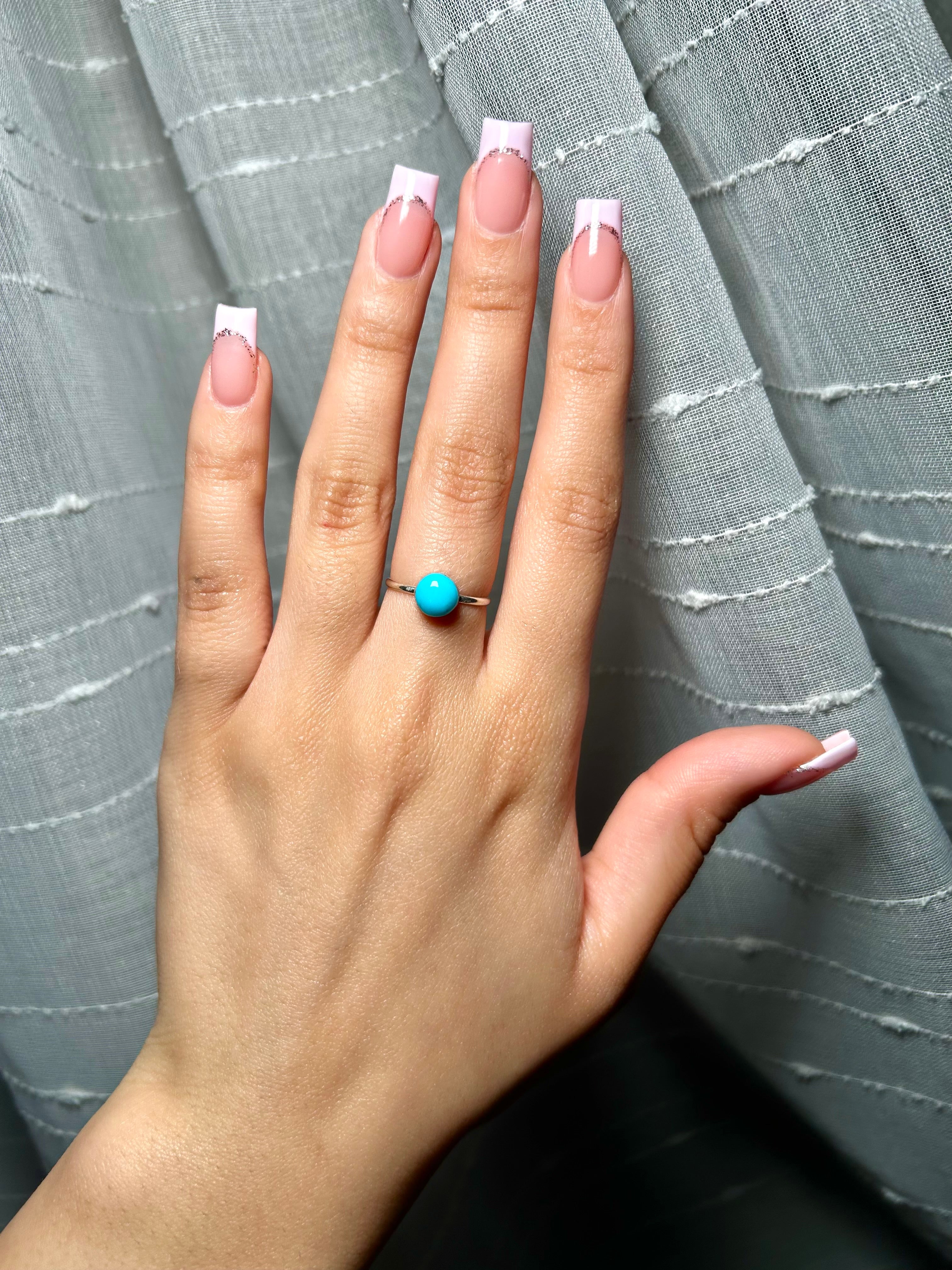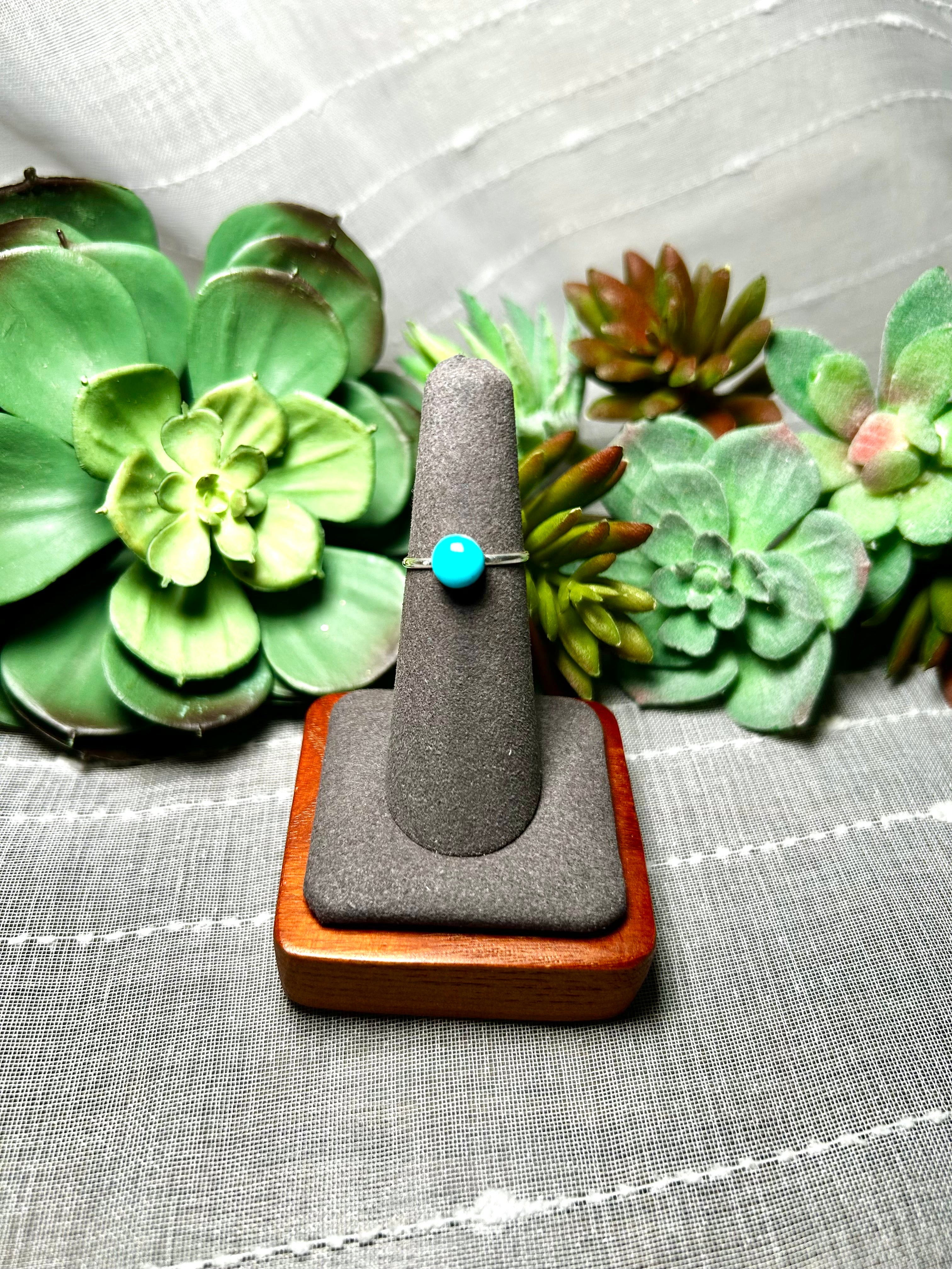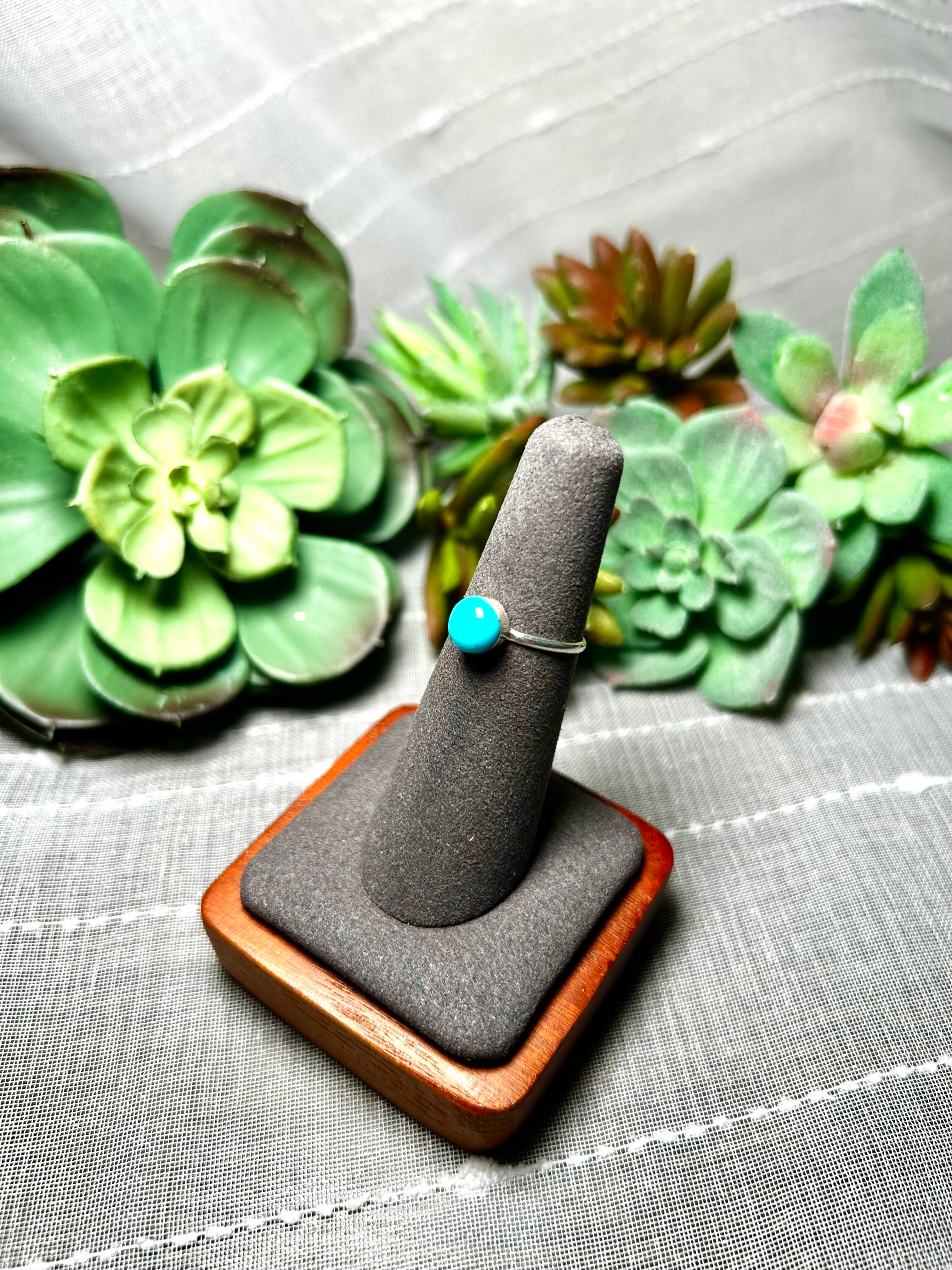 Navajo Made Kingman Turquoise & Sterling Silver Ring. It measures 1/4 of an inch long and 1/4 of an inch wide. Signed by the artist and stamped sterling silver.