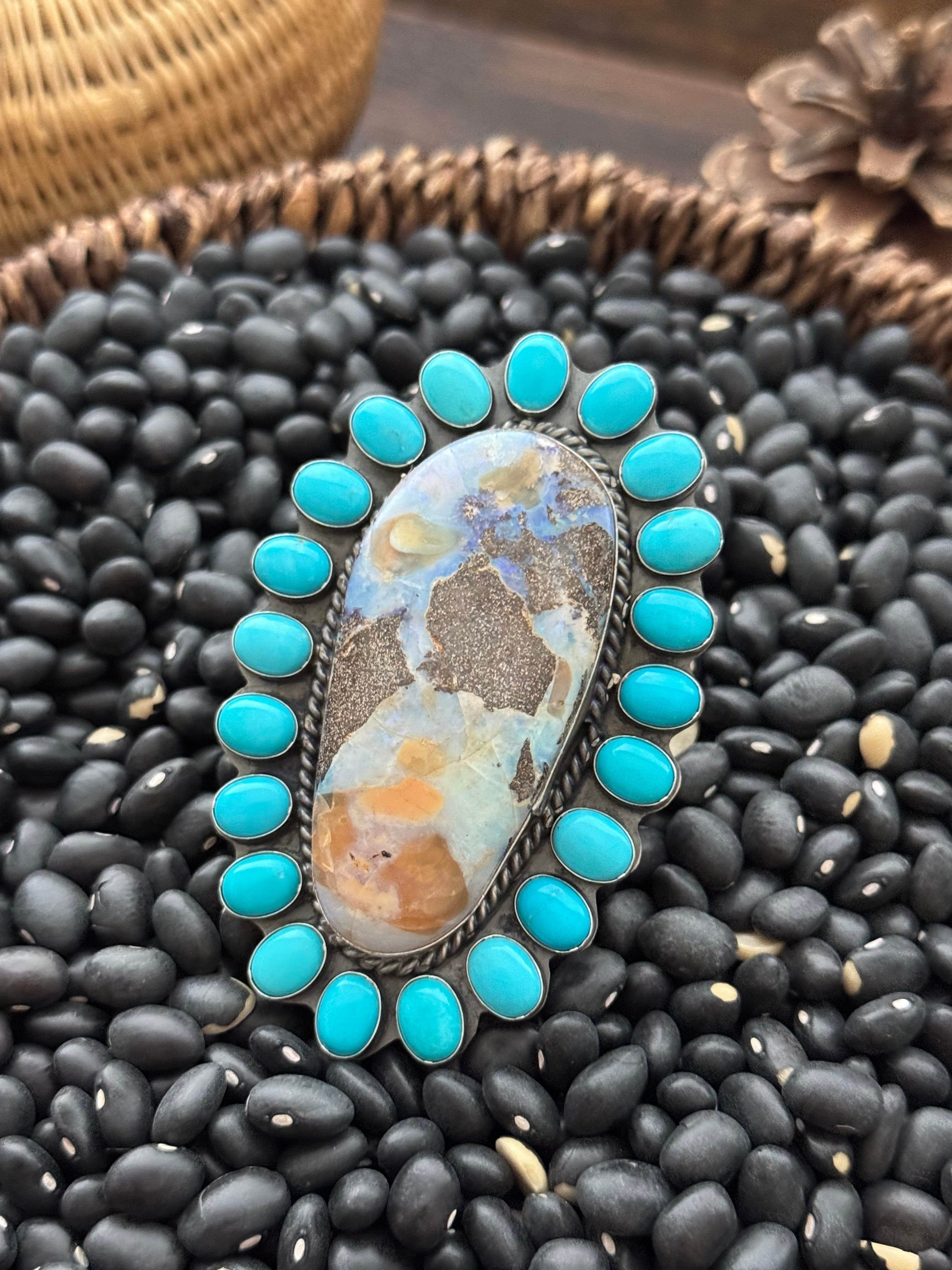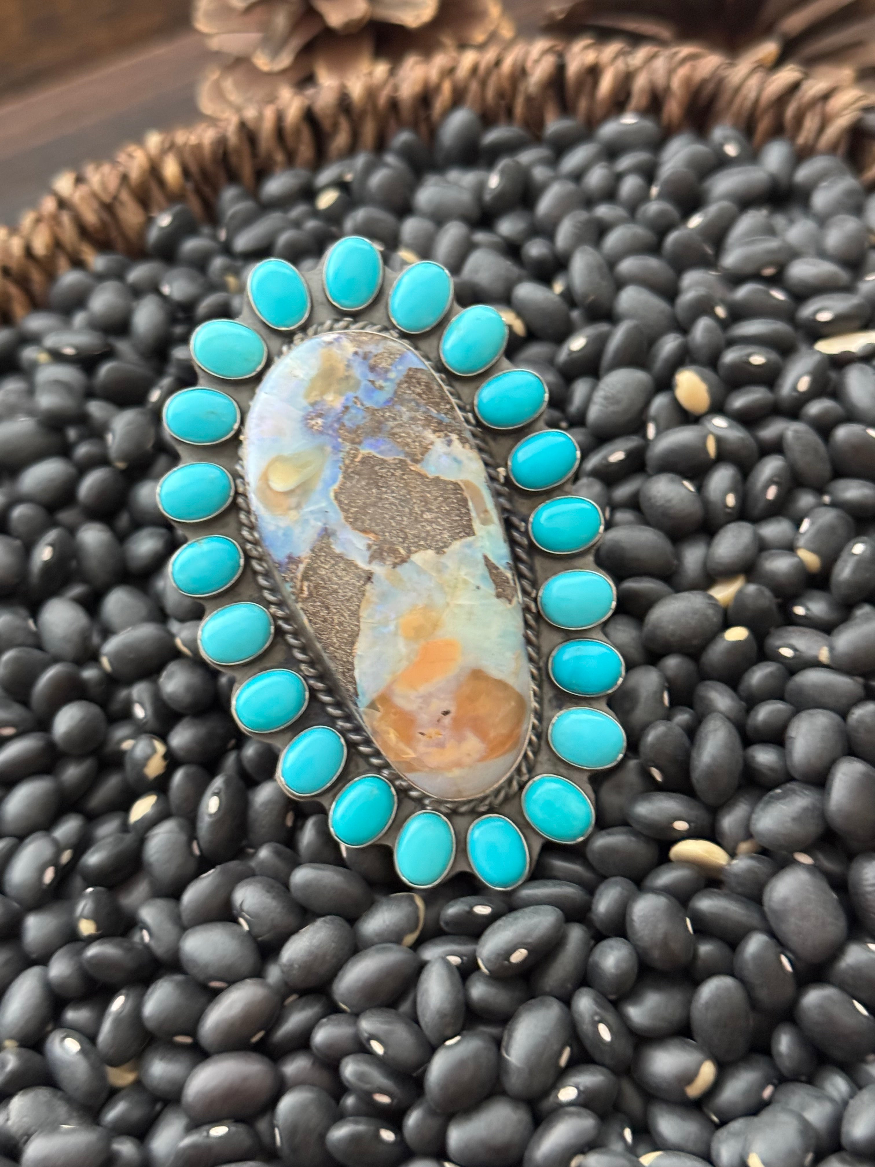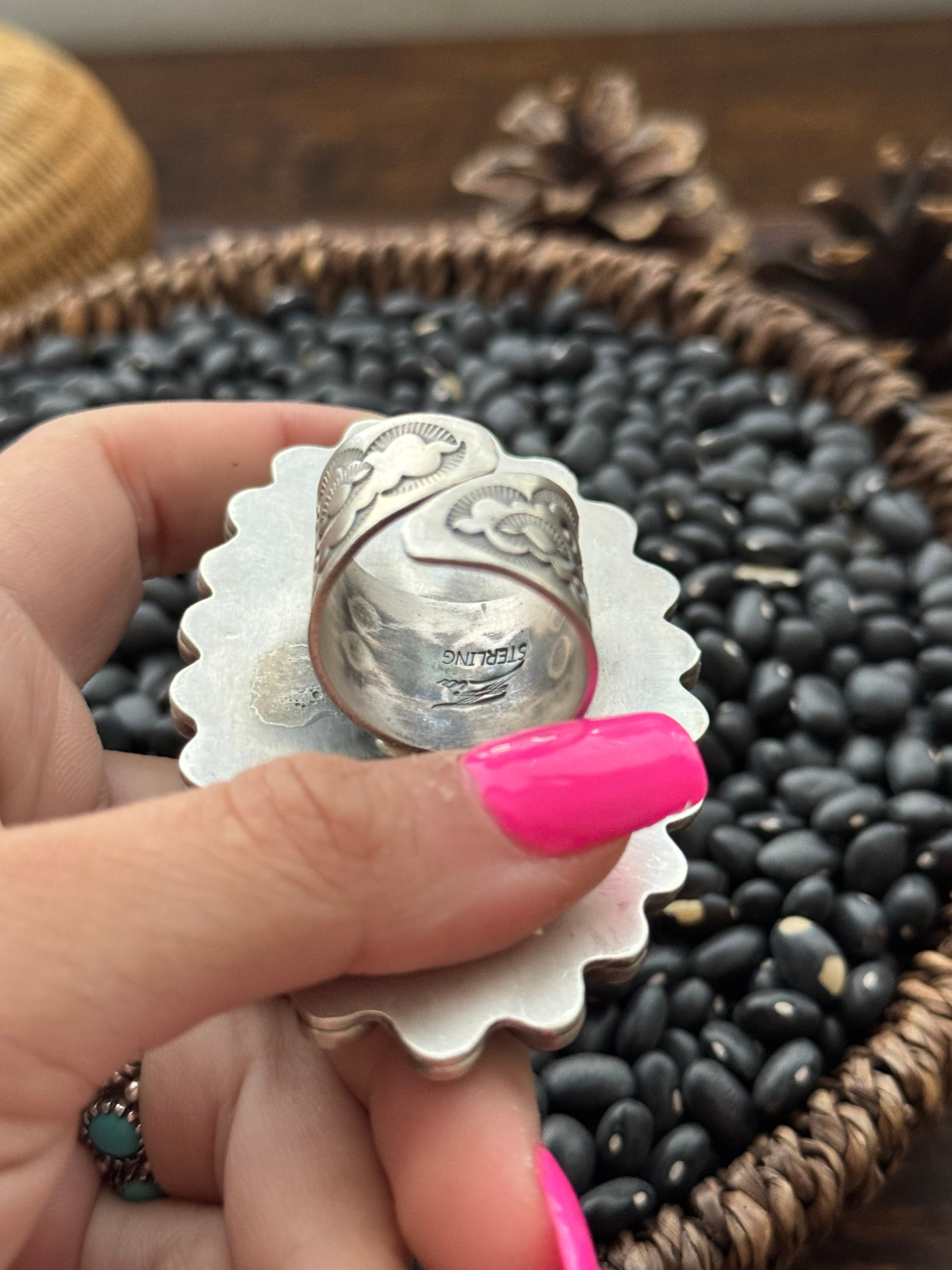 Beautiful ring. Navajo Made Multi Stone & Sterling Silver Adjustable Ring. It measures 3 inches long and 2 inches wide. Stamped sterling silver and signed.