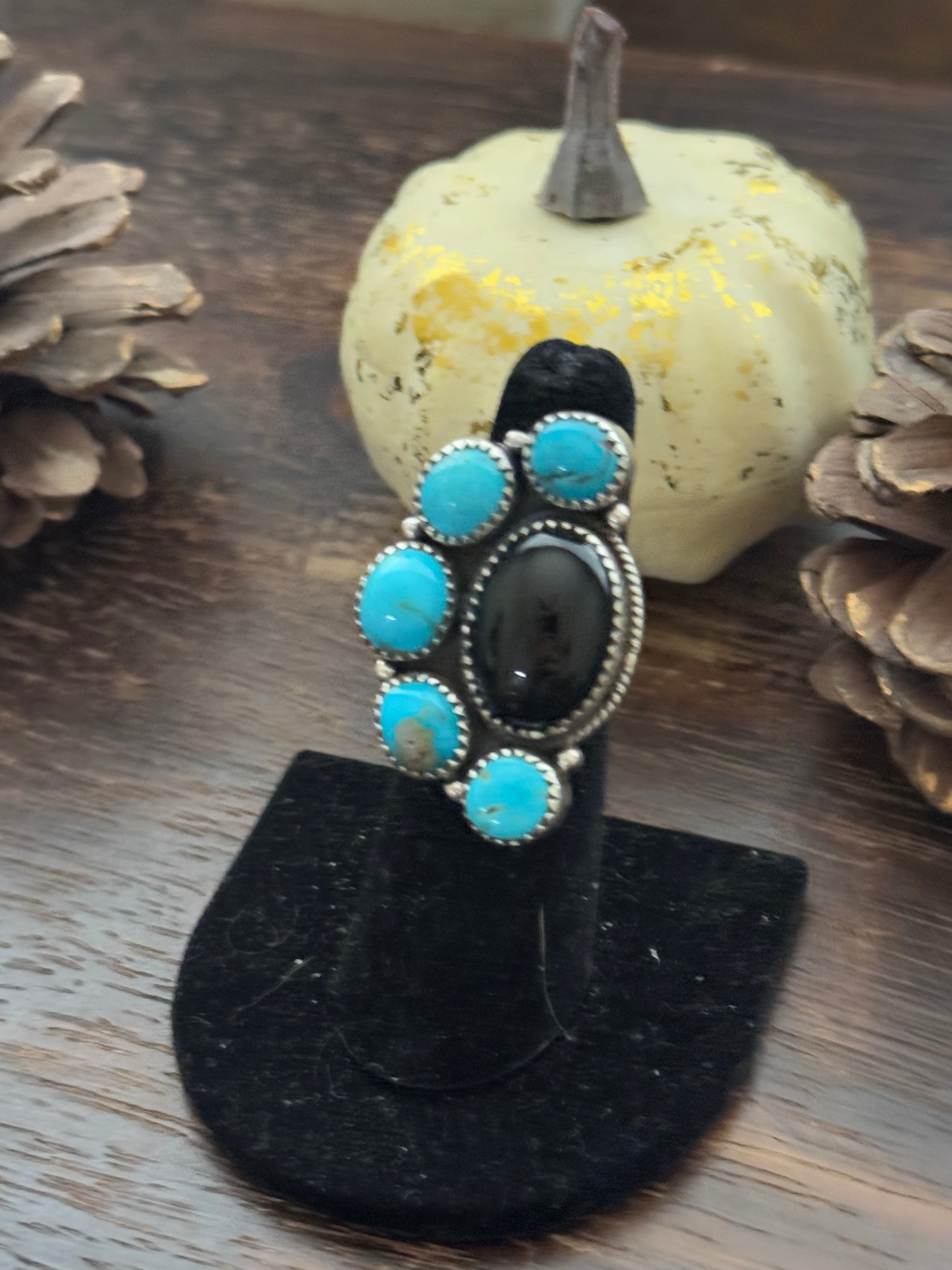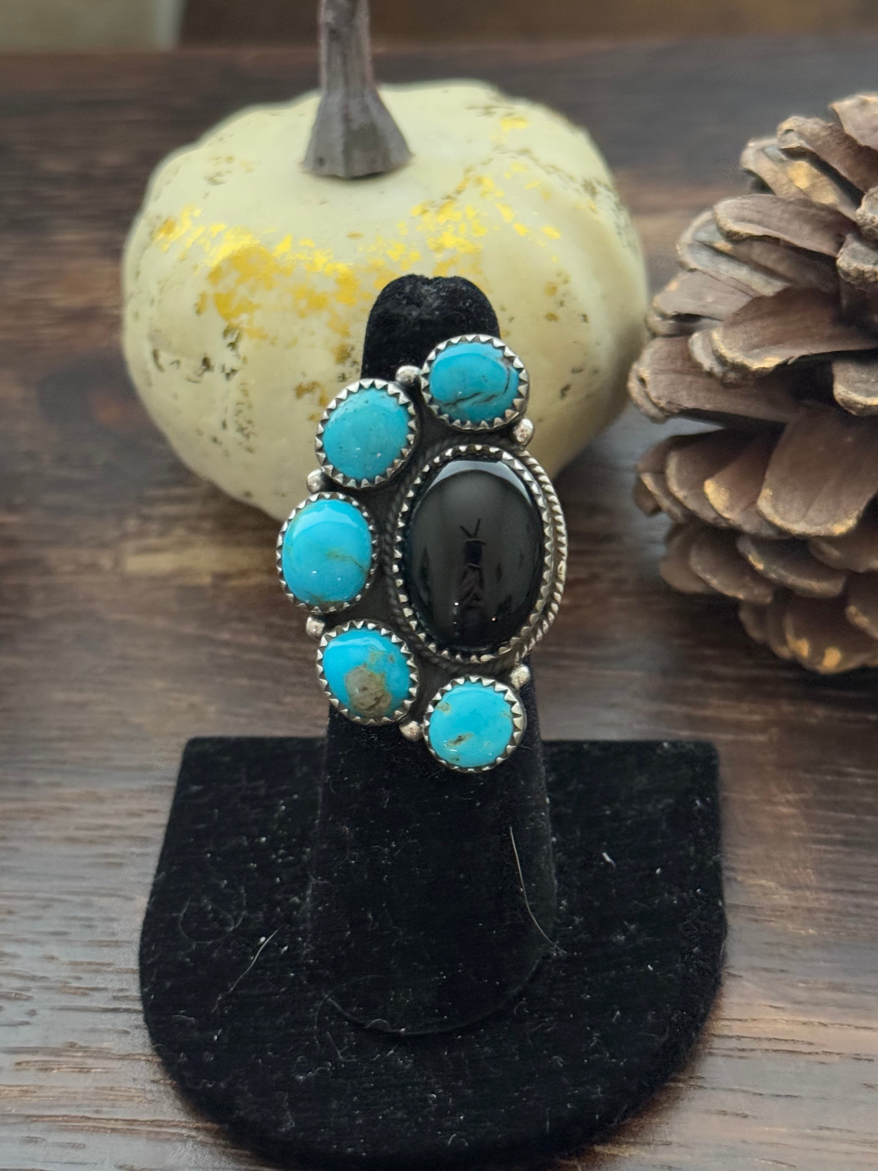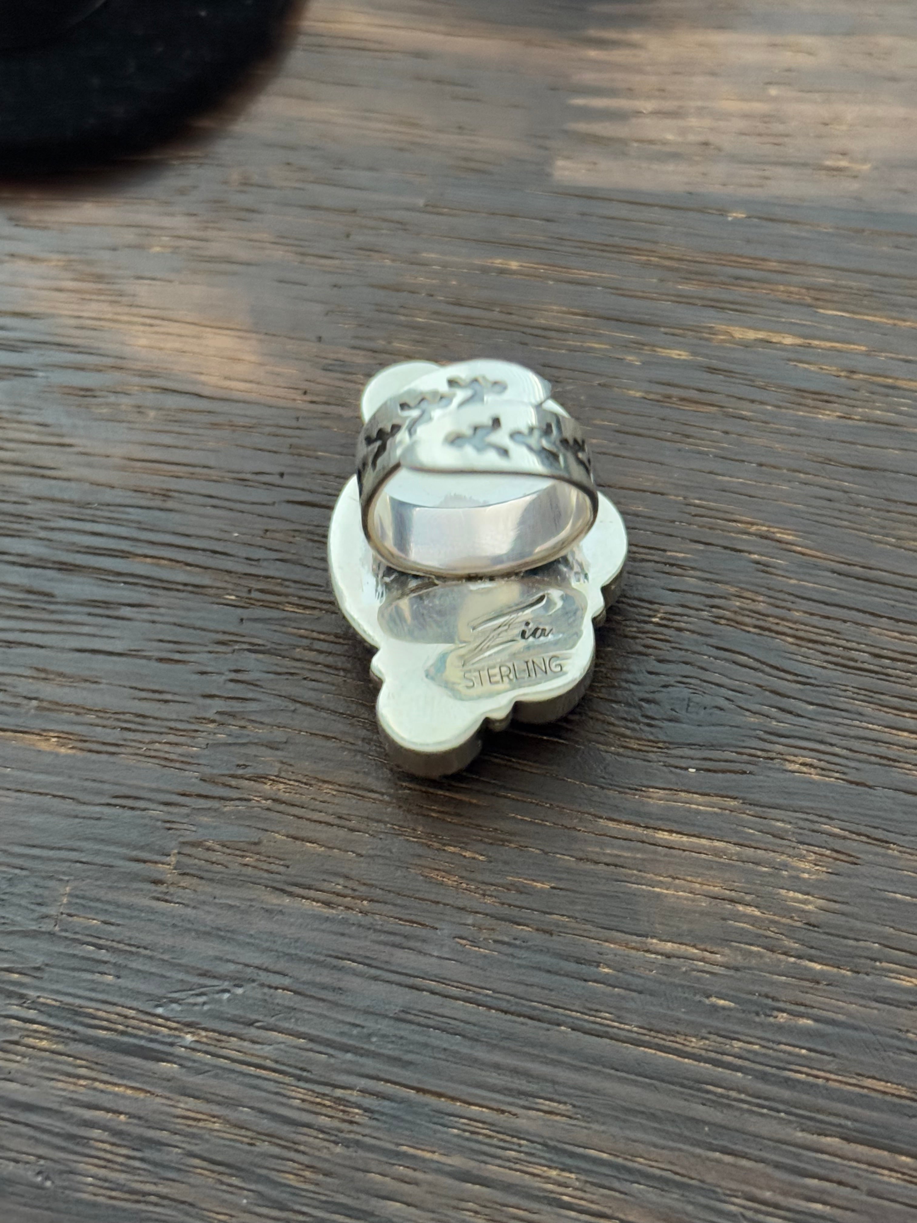 Beautiful ring. Navajo Made Multi Stone & Sterling Silver Adjustable Ring. It measures 1 1/2 inches long and 1 inch wide. Stamped sterling silver and signed.